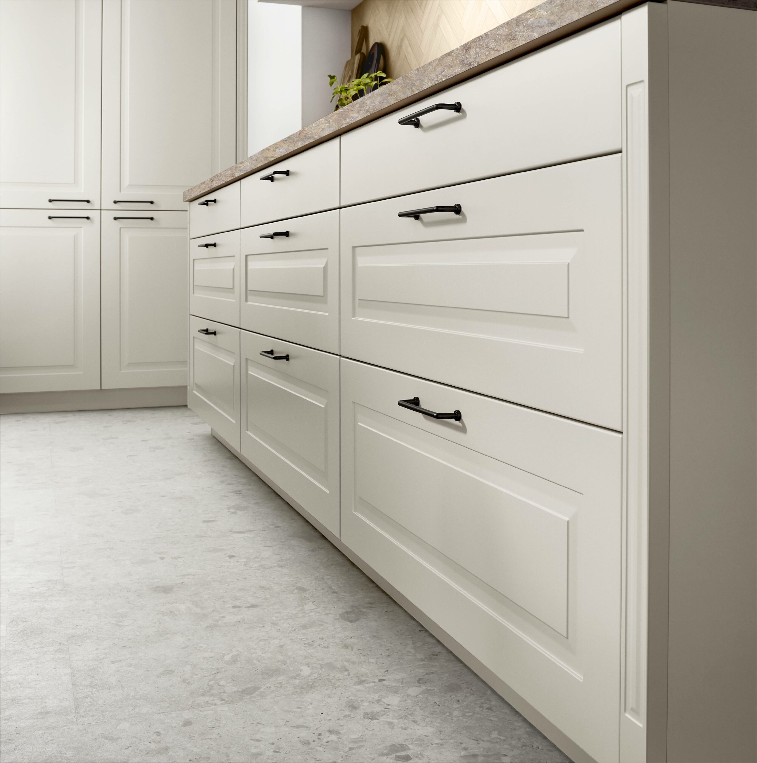 Our unique drawer system, nBOX, raises the bar for interior design. Maximum ease is ensured by the slate grey's linear design, hidden runners, and optional push-to-open feature. The Plus X Award 2025 was given to the idea.