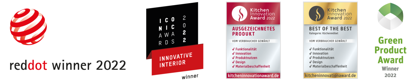 Nobilia's award-winning Xtra Ceramic worktop meets the highest standards. Its real ceramic surface is elegant, durable, and easy to clean. Recognised as Best of the Best in kitchen furniture, it received the Reddot Winner 2022, Innovative Interior 2022, Green Product Award 2022, and Kitchen Innovation Award 2022.