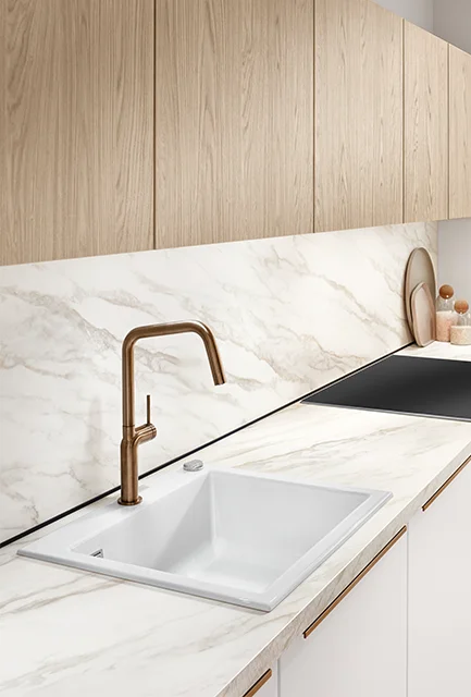 Stone-effect designs give the kitchen a high-quality, modern look. The elegant prints create an authentic stone effect and lend the kitchen a stylish, architecturally striking aesthetic.
