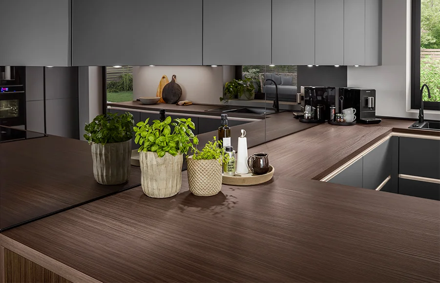 Wood look meets design: the Stripewood dark decor brings a natural warmth to your kitchen with its unique tactile and visual effects.
