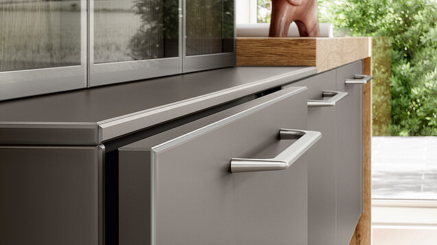 The Matt Titano fronts give the room a calm, modern base. Warm wood on the back wall adds depth and a soft, natural touch. Glass doors on the wall unit keep the space open while transforming tidy storage into a striking and essential element.