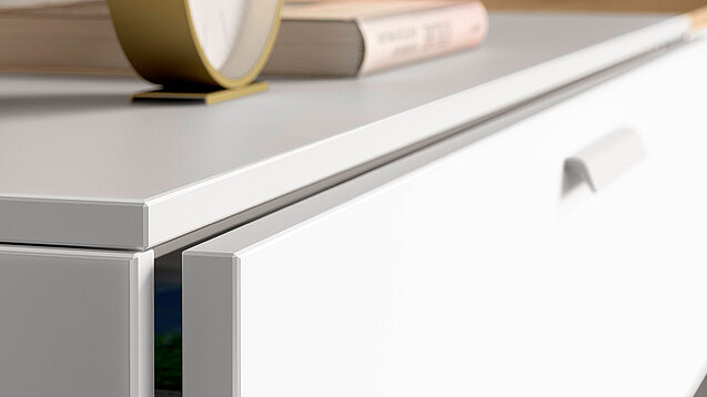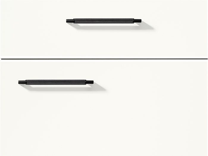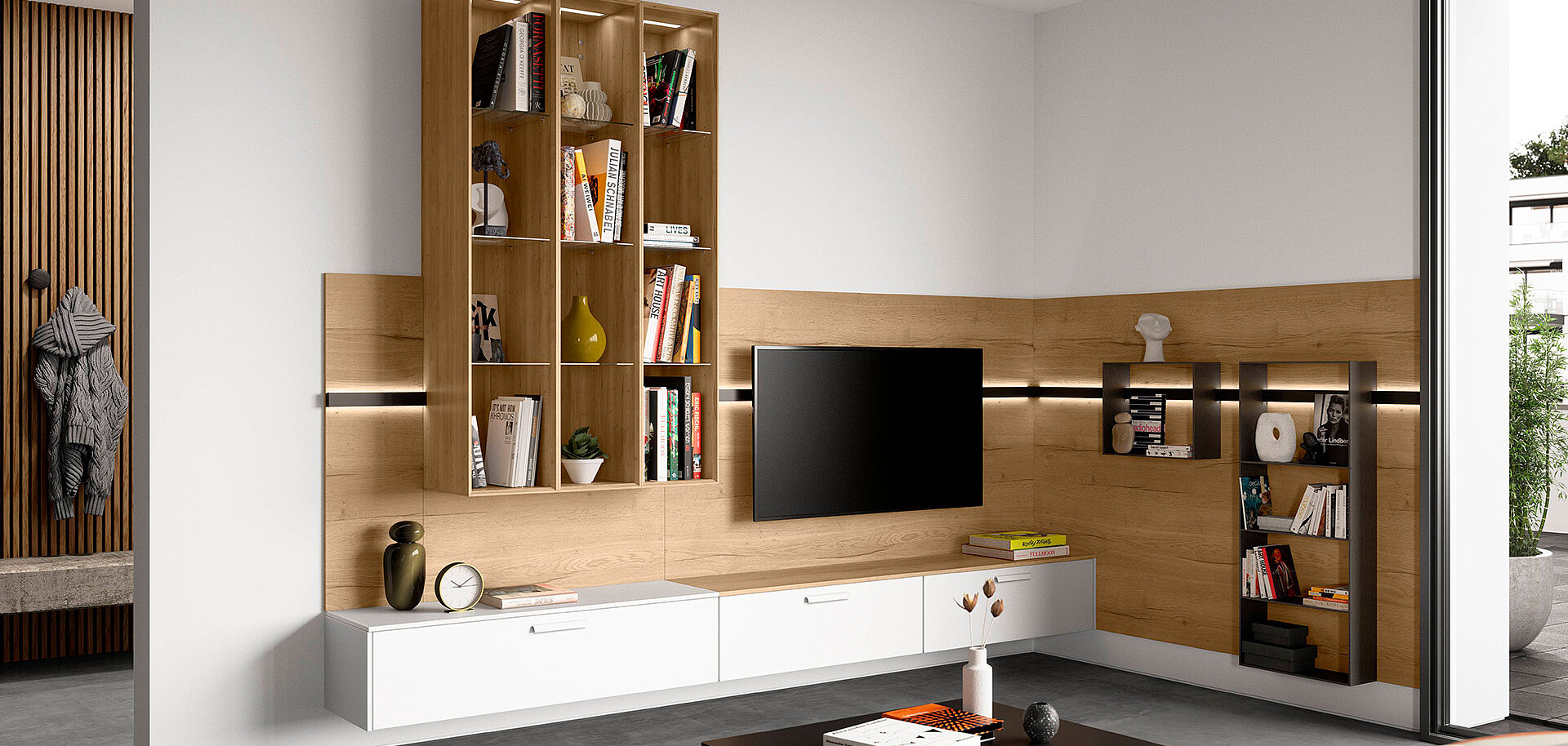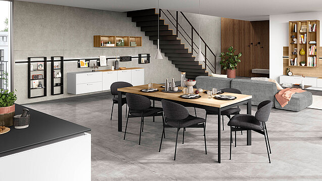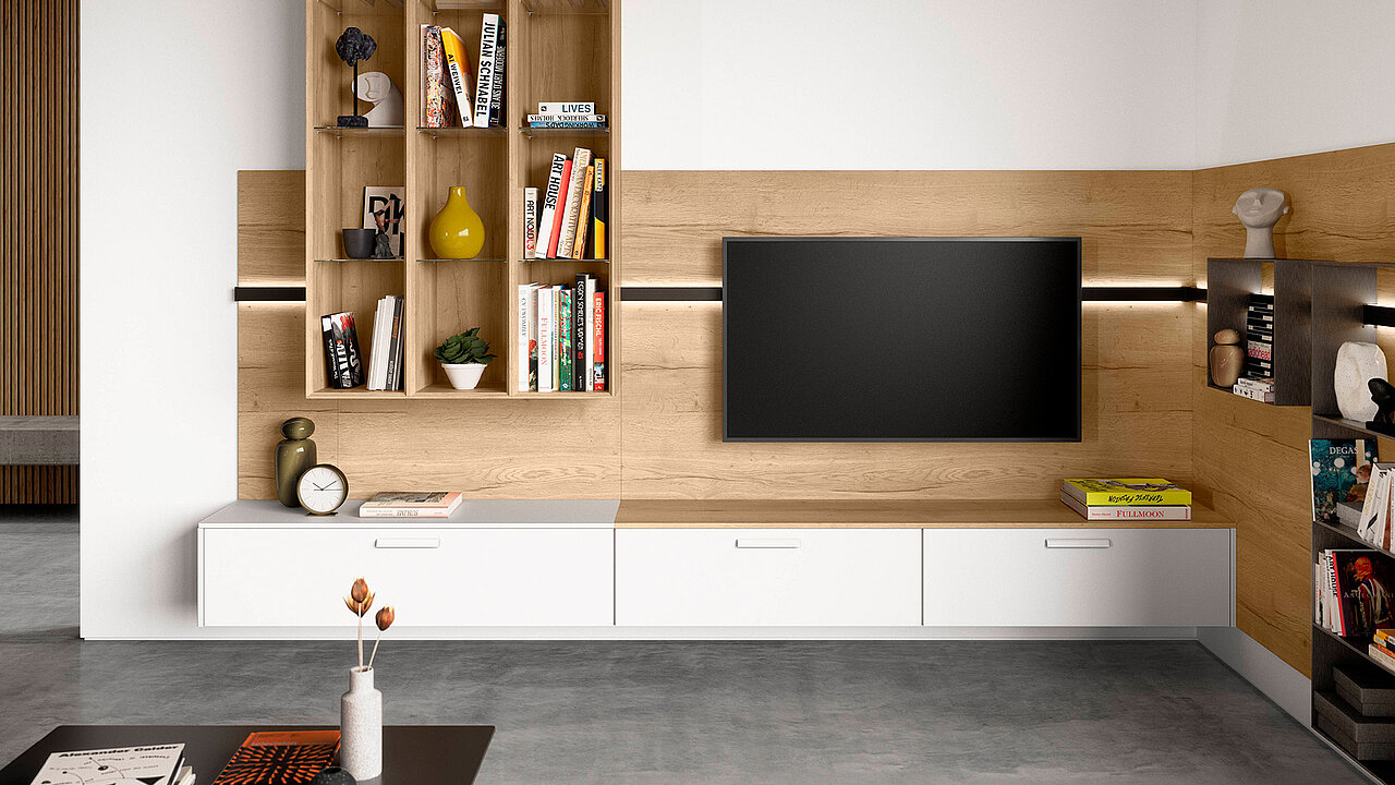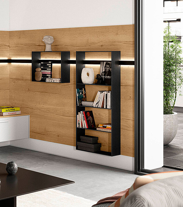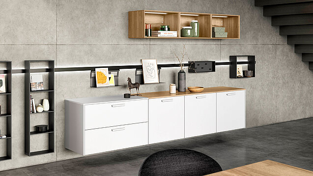This design stands out through a smart mix of textures and tones. The sideboard shows a soft satin finish with a quiet glass look. A facetted shelf in natural oak adds warmth. The black Sign Emotion rail gives the room a clean, modern edge.