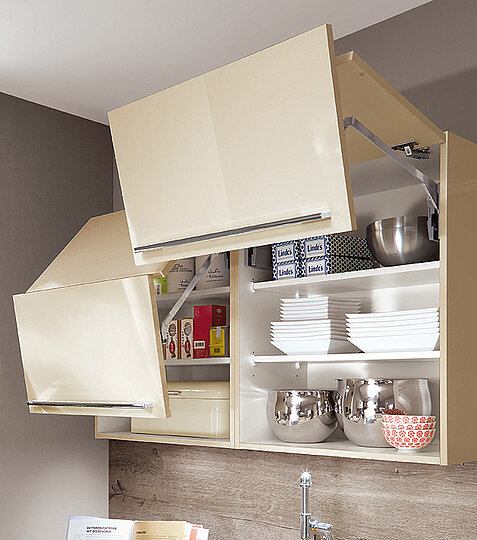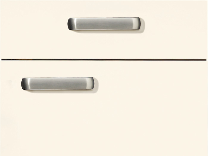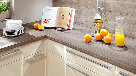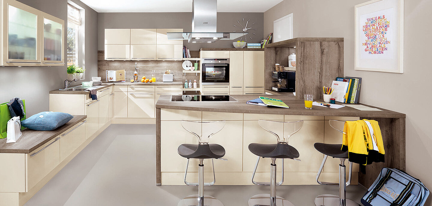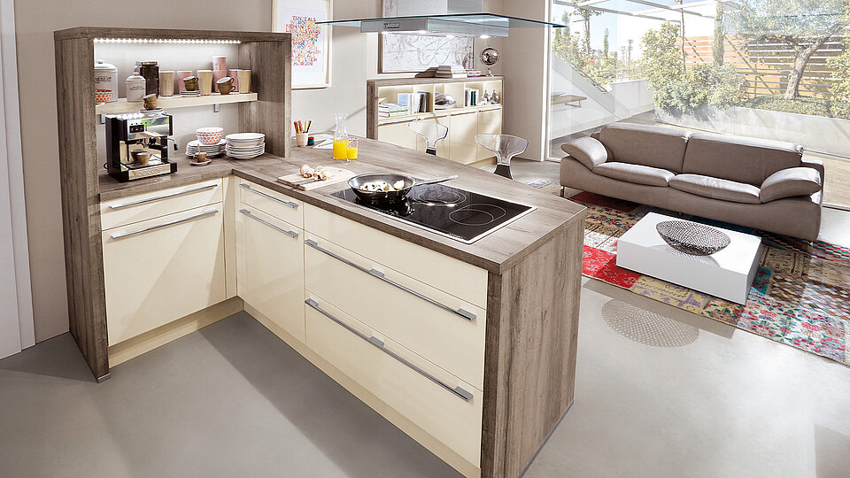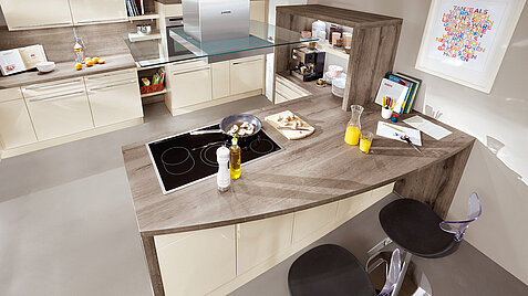 The focus of this family-centered kitchen is the island cooking centre with the integrated dining space, which separates the kitchen and the living room. The organic, rounded shape of the attachment table is hassle-free in terms of production and is customisable.