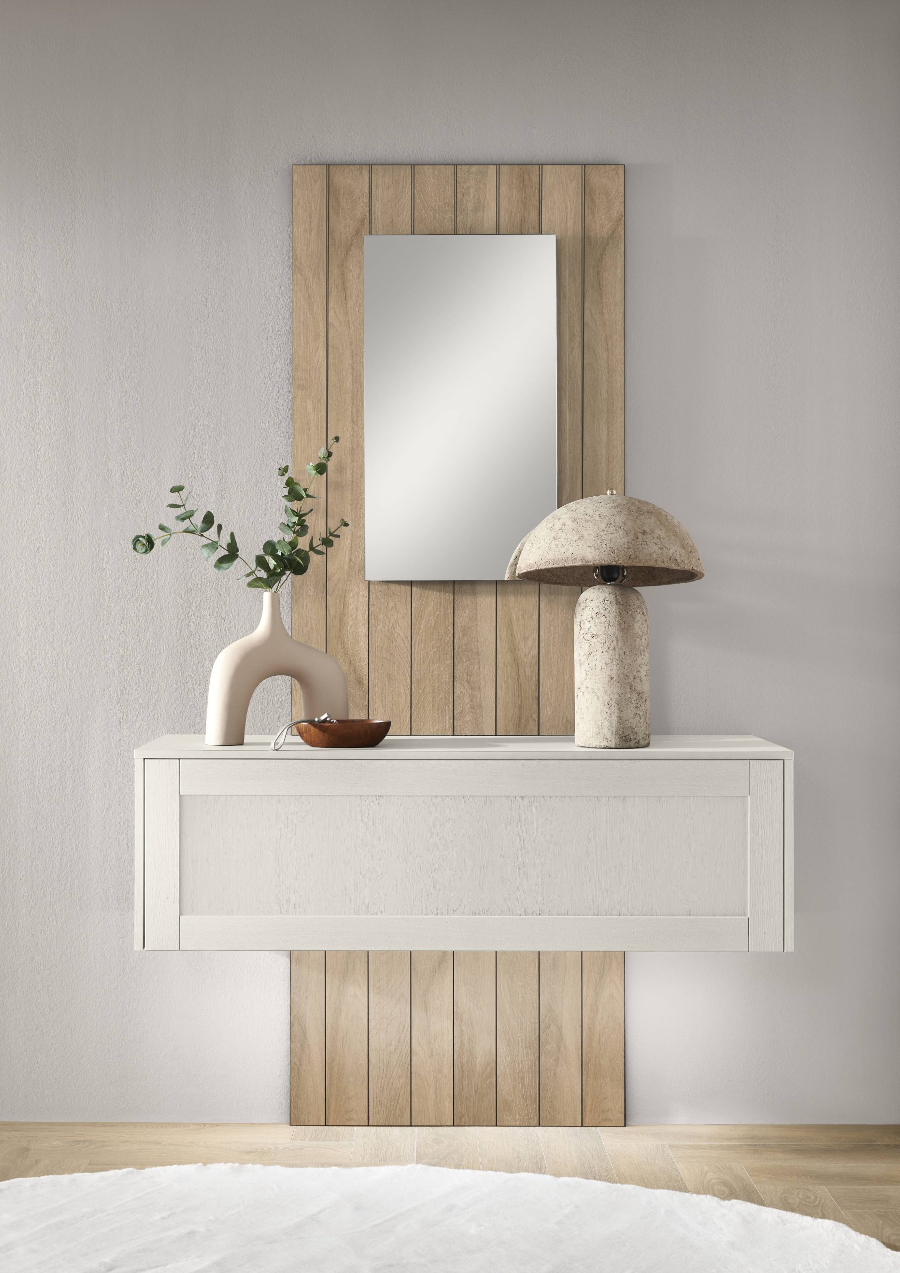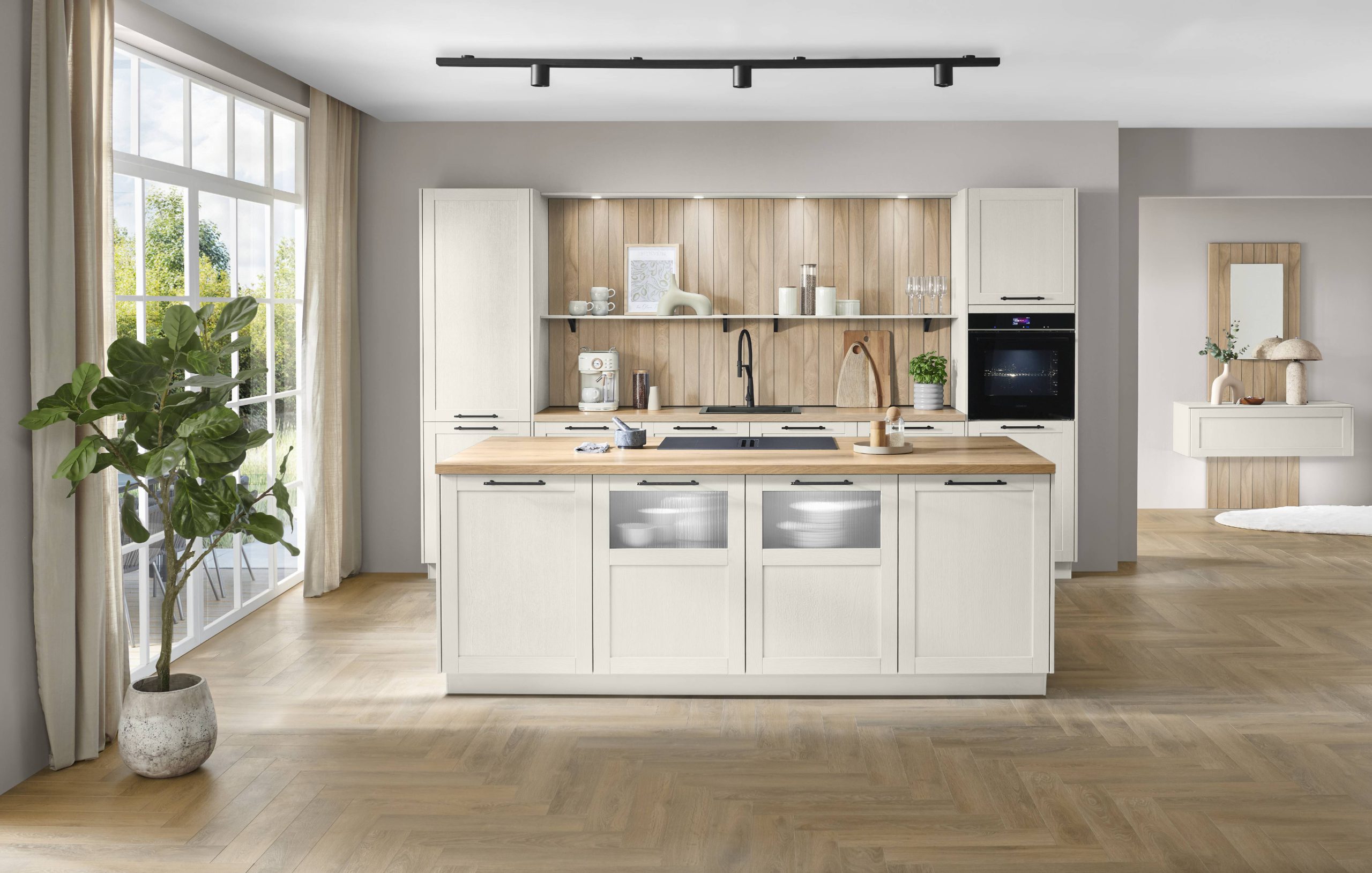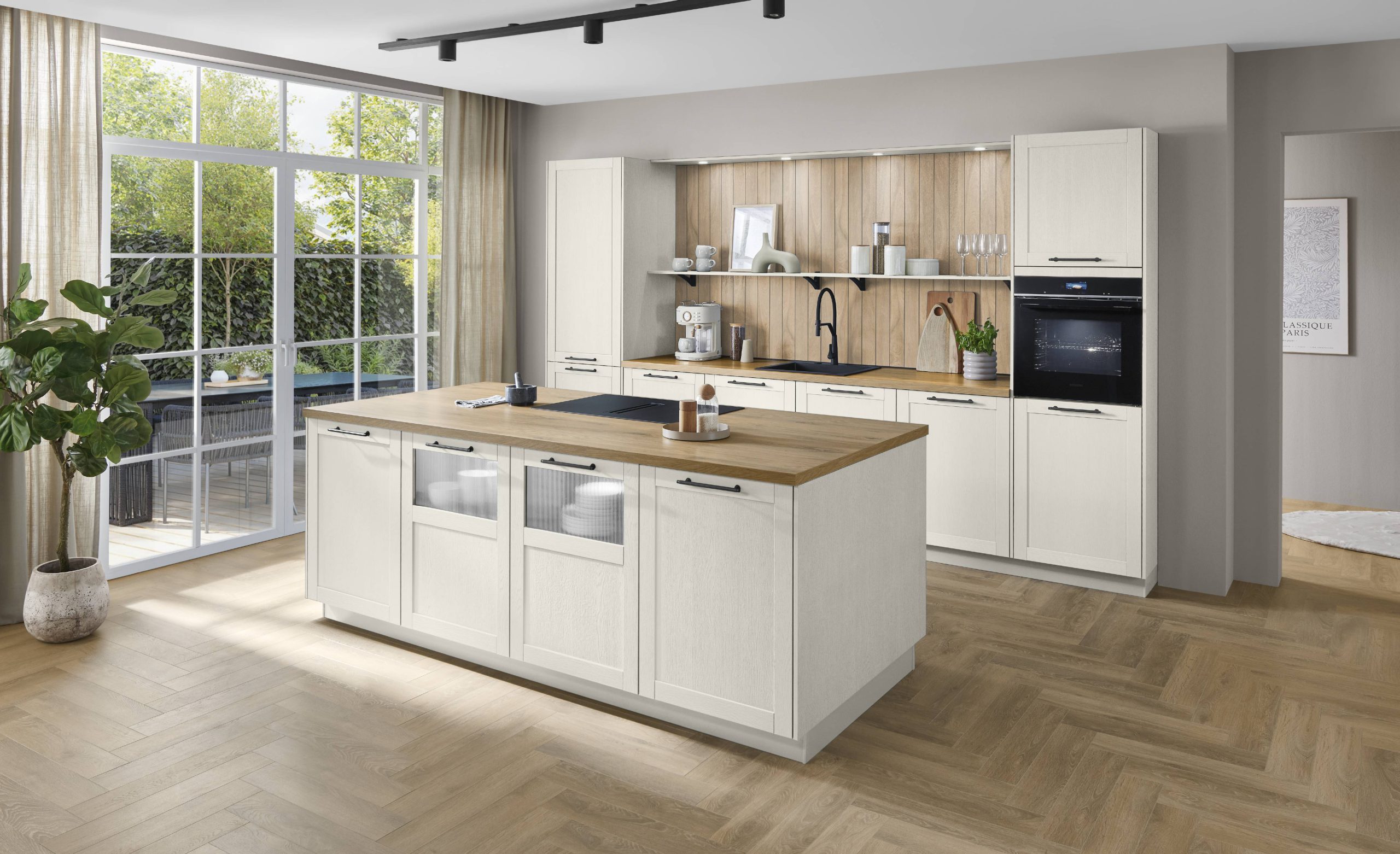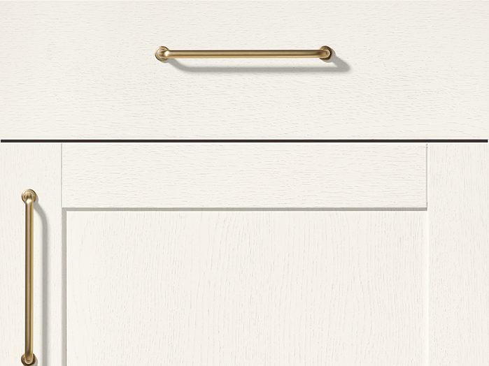 A kitchen is made special with minuscule details and shaped with its character. The classic white framed fronts with visible wood grain create a bright, friendly environment. Natural wooden elements set harmonious accents and create a feel-good atmosphere. The dining table with real-wood-veneered table top completes the harmonious picture and becomes a place where moments are shared.