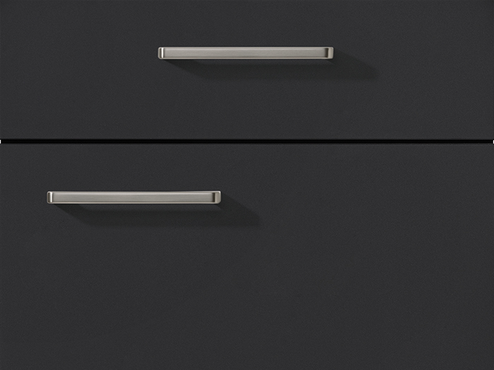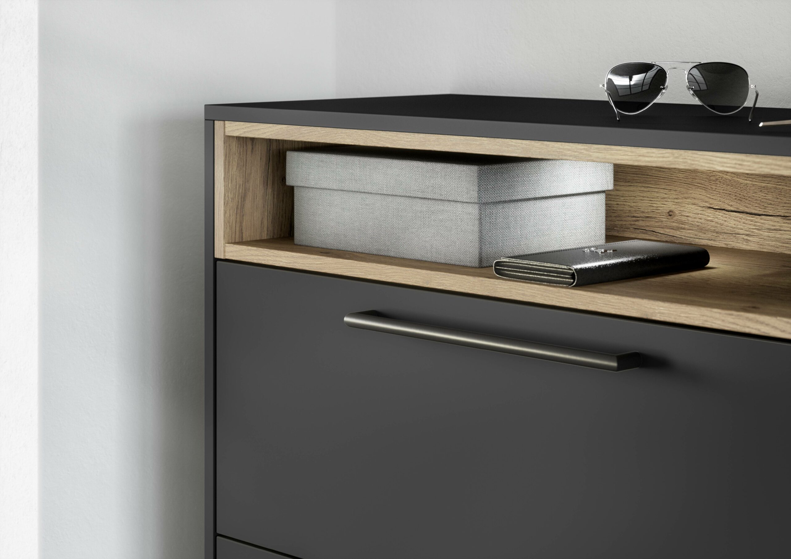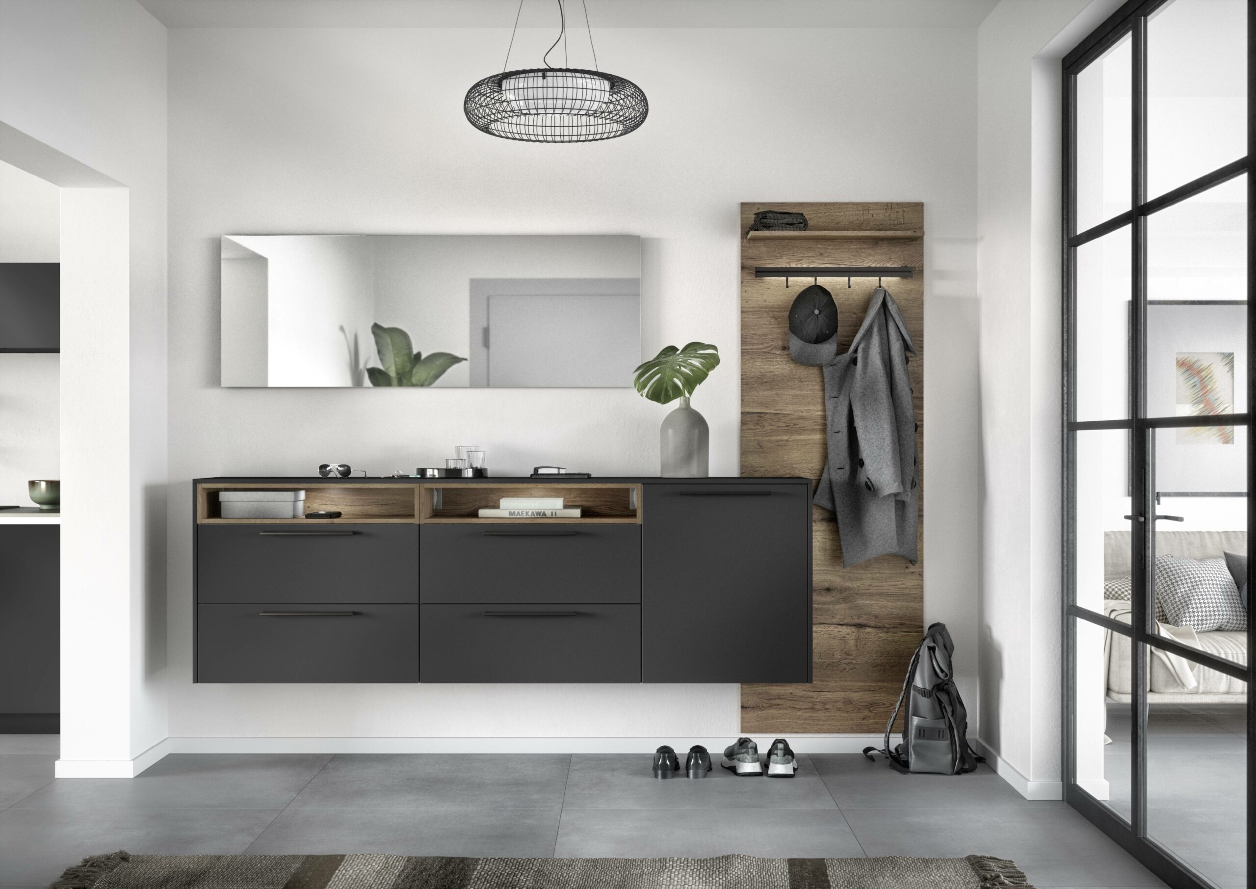 The floating sideboard in ultra-matt black gives the space a calm, elegant start. Tone-on-tone handles keep the look smooth. An oak-look wall shelf elevates the warmth. A large mirror pulls everything together with a soft, balanced touch.