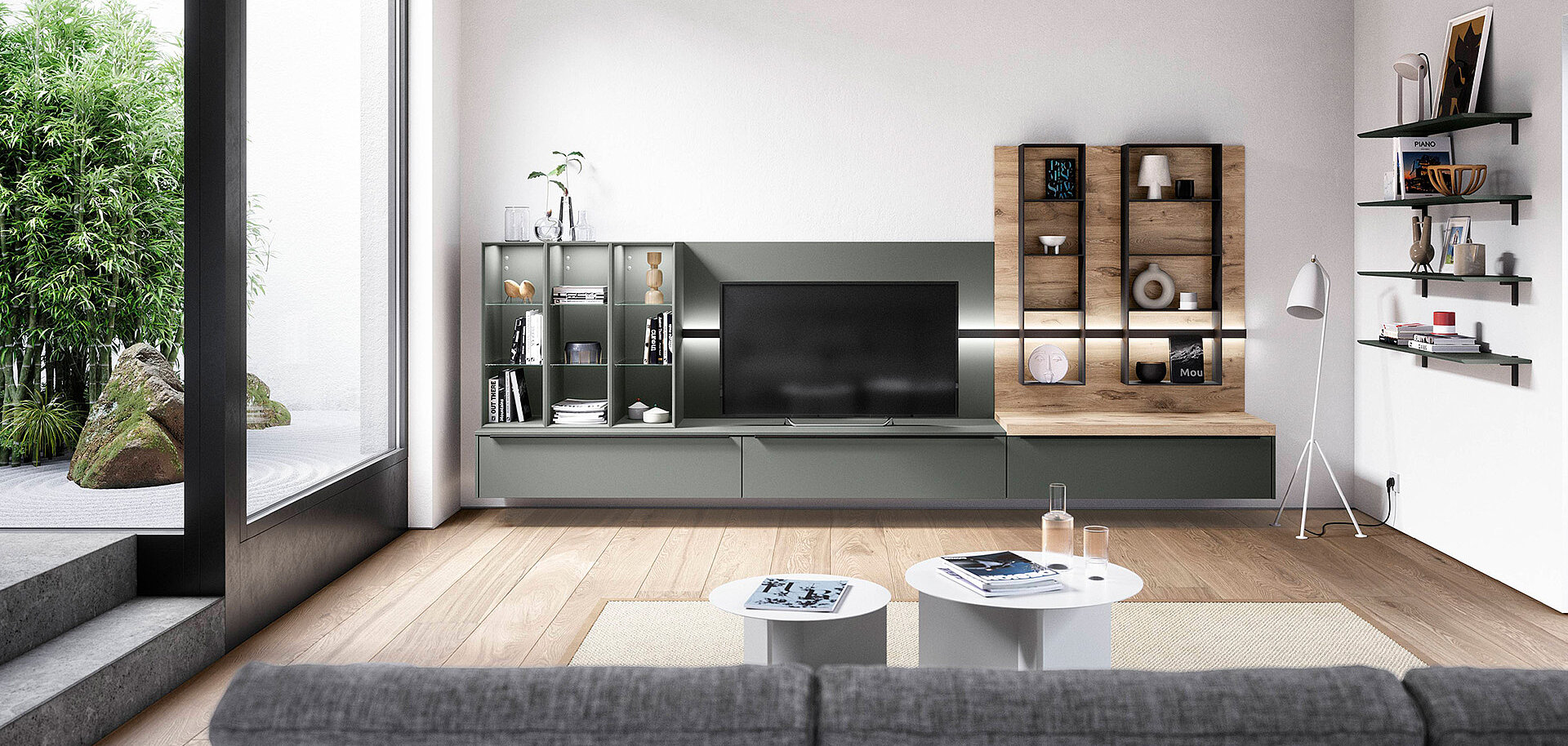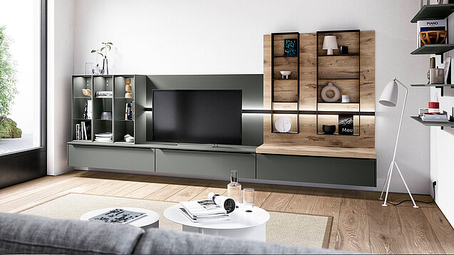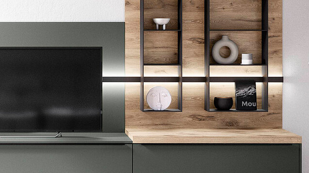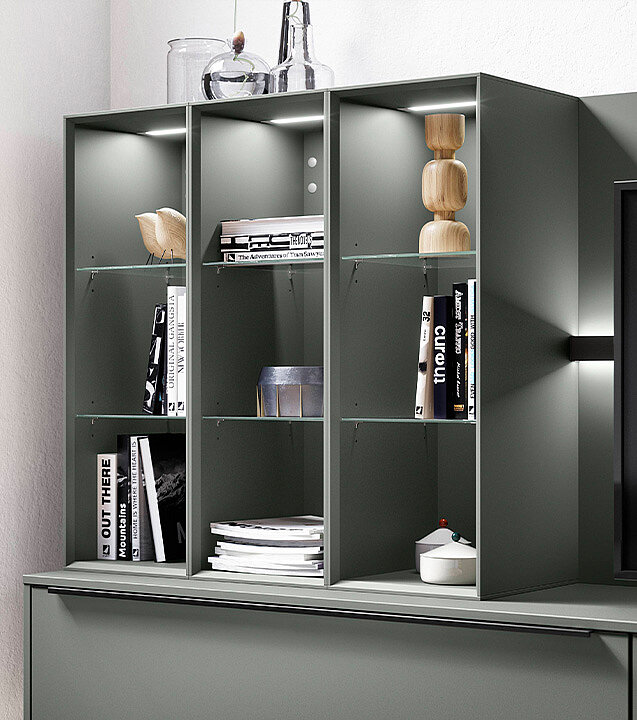 Shelving create a sense of openness in the room. When they share one tone, the layout feels steady and smooth. Oak décor and the Sign Emotion rail add gentle warmth and a natural feel.