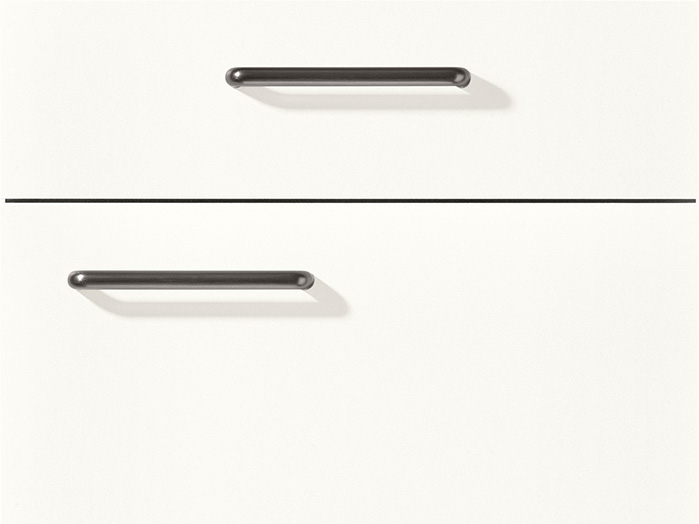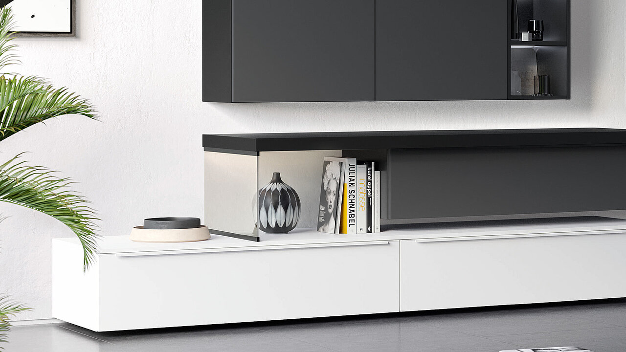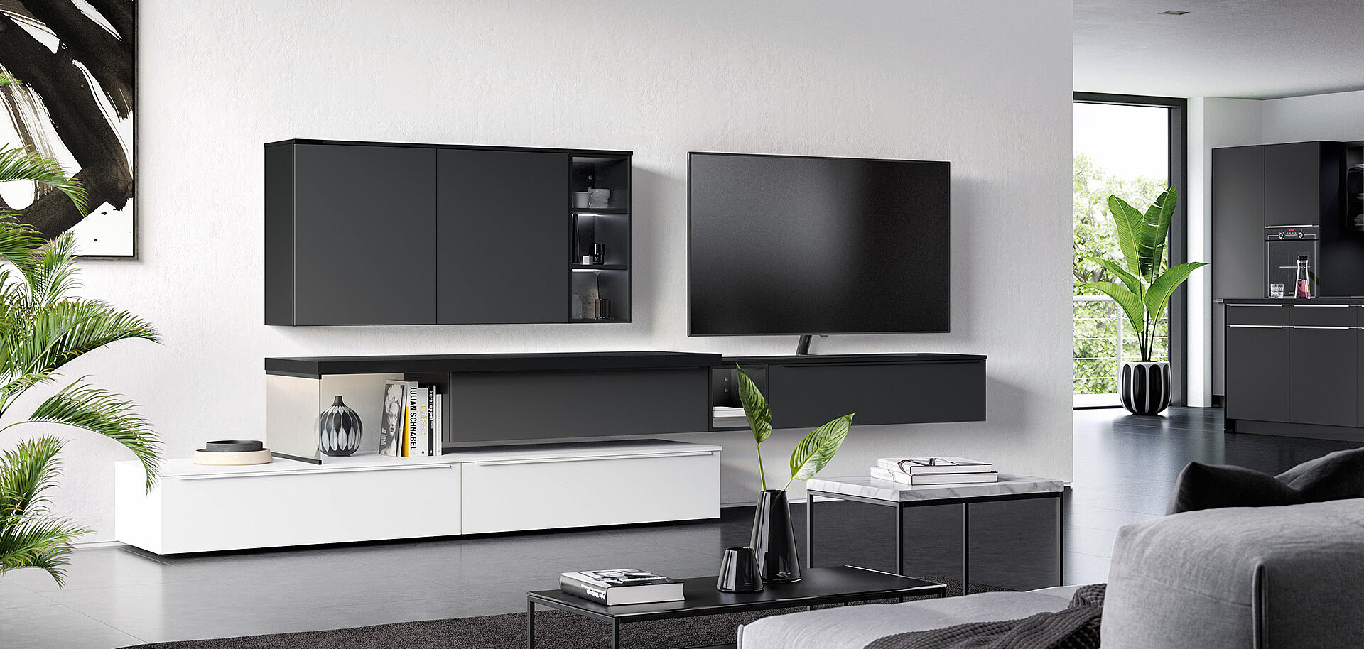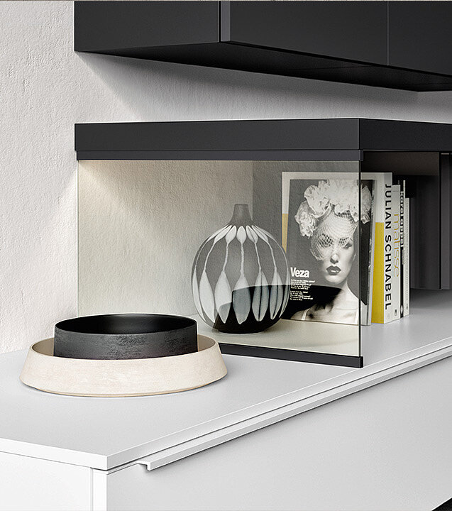 Dark carcasses paired with soft light accents shape the tranquil urban mood. Anti-fingerprint fronts help the cabinets stay tidy. Glass pieces break up the depth and bring a light, airy touch to the layout.
