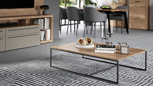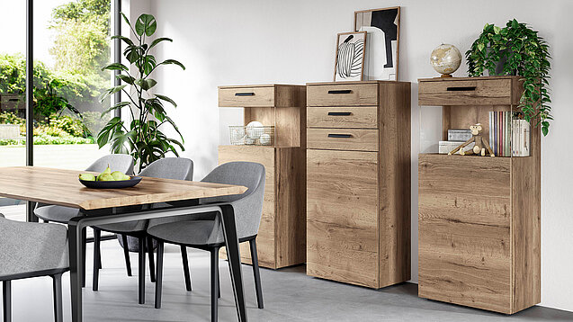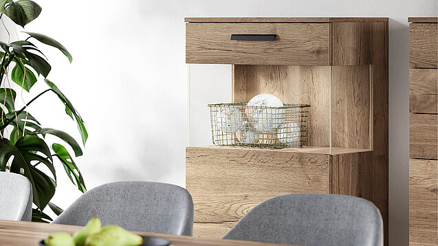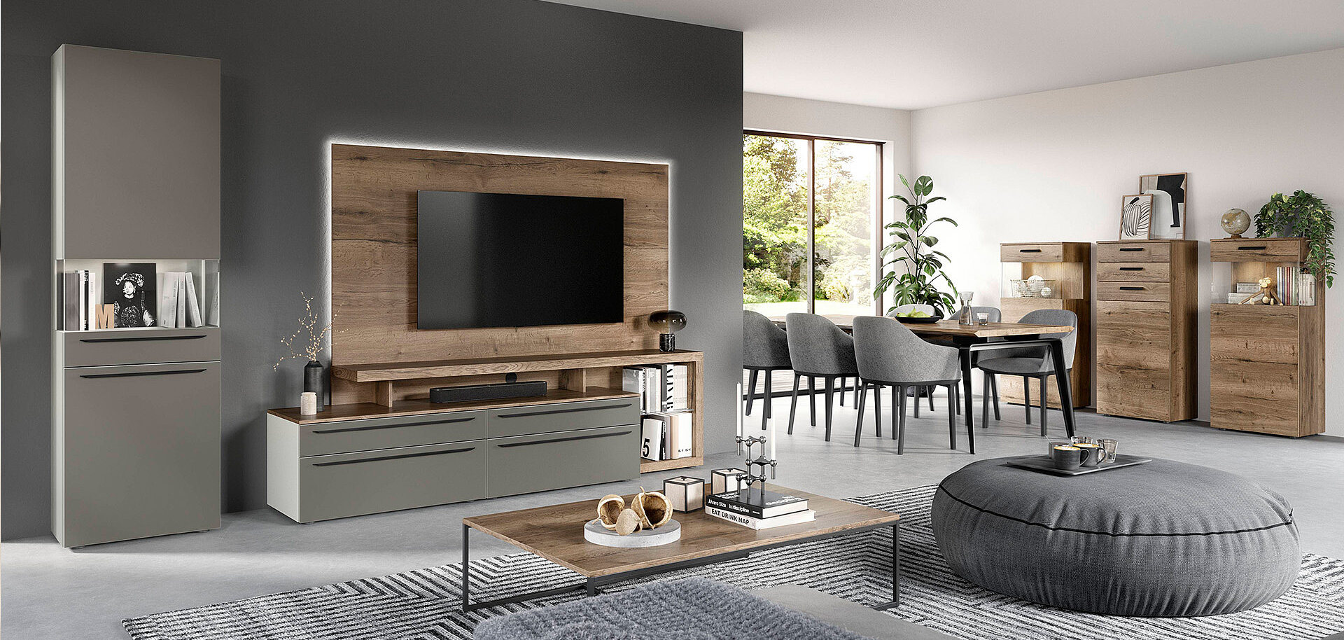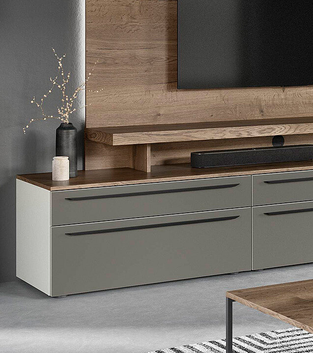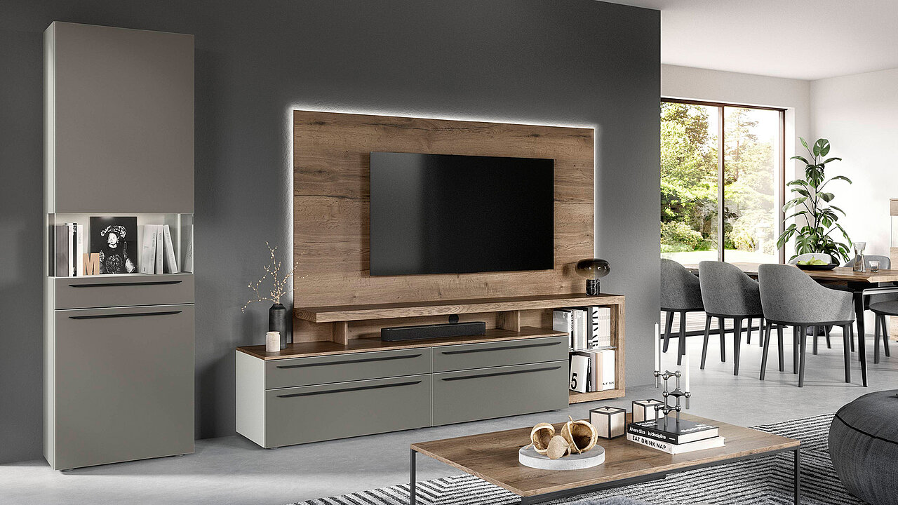 Taupe grey has a cosy charm and blends well with varied pieces. The display cabinet with glazing on both sides gives a clear focal point. Soft lighting on the media console elevates the mood. The cable aperture helps keep everything neat.