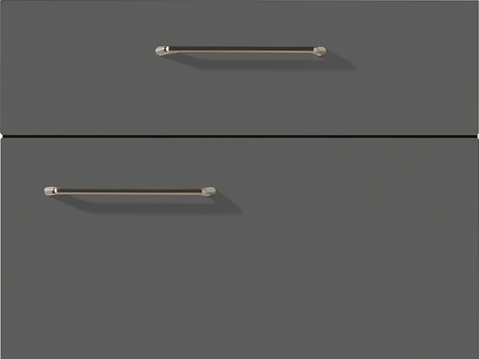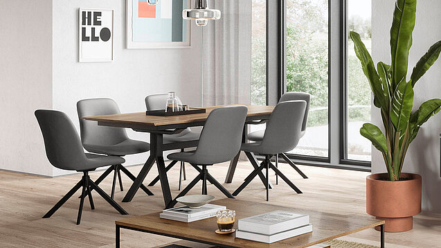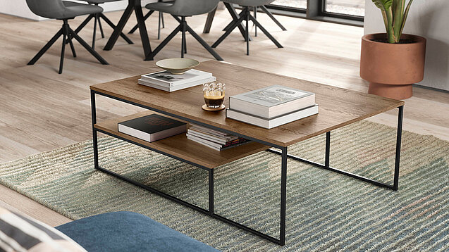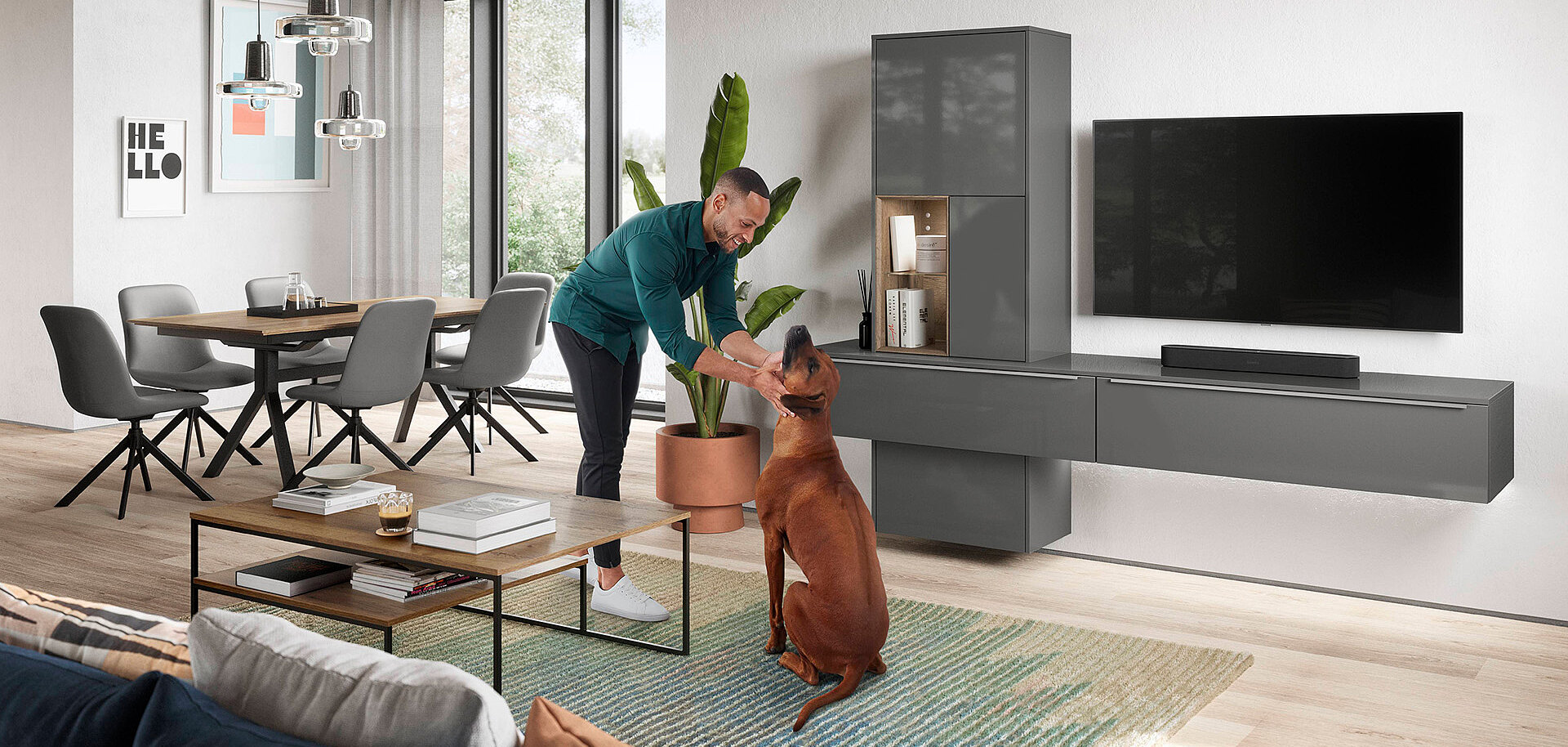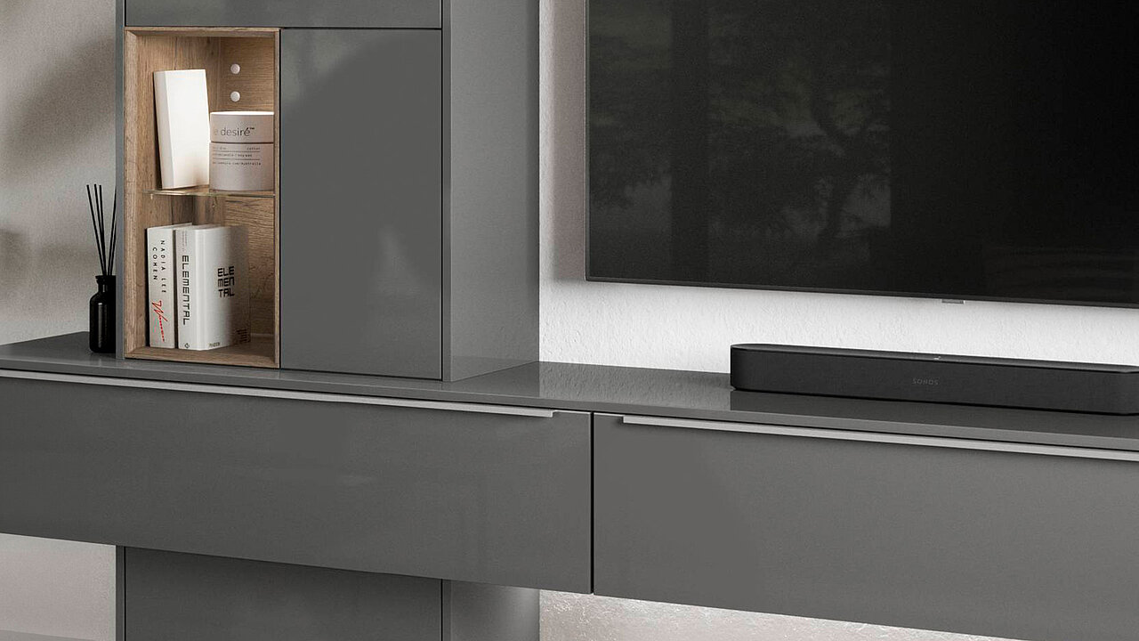 Slate grey in a high-gloss finish pairs with warm Havana oak to create a calm, refined living space. The mix brings modern style and a soft natural warmth into the room. Every piece balances design with everyday function, so your living or dining area feels both elegant and comfortable.
