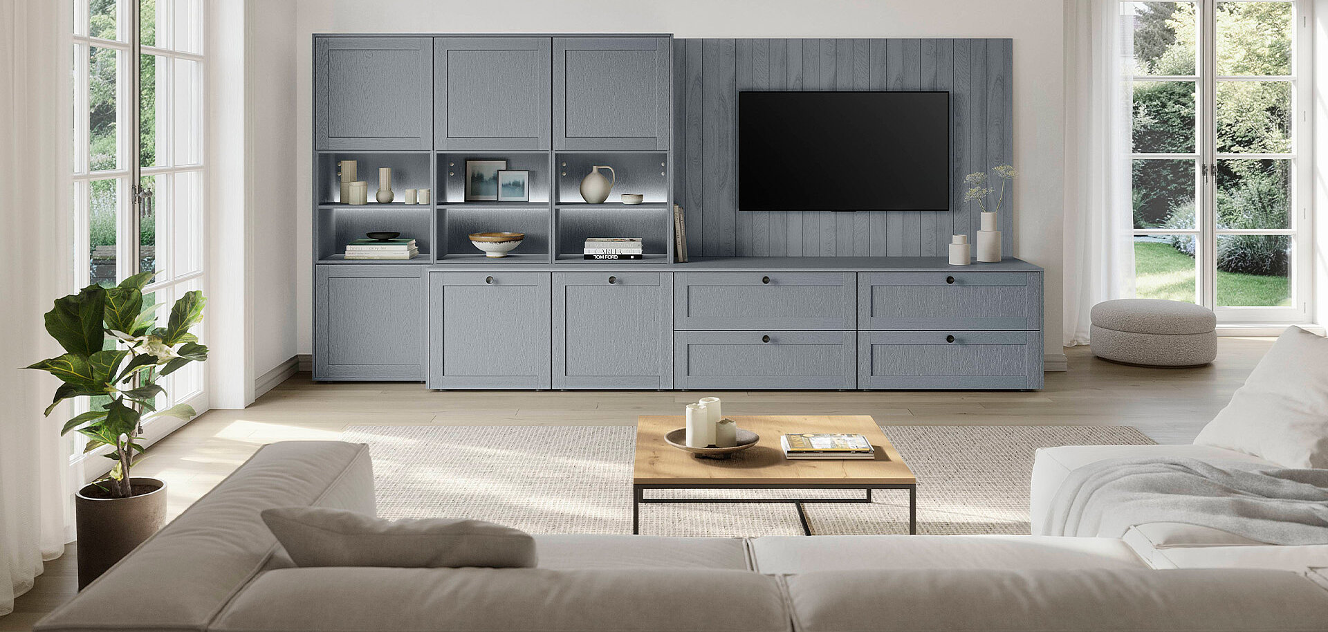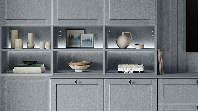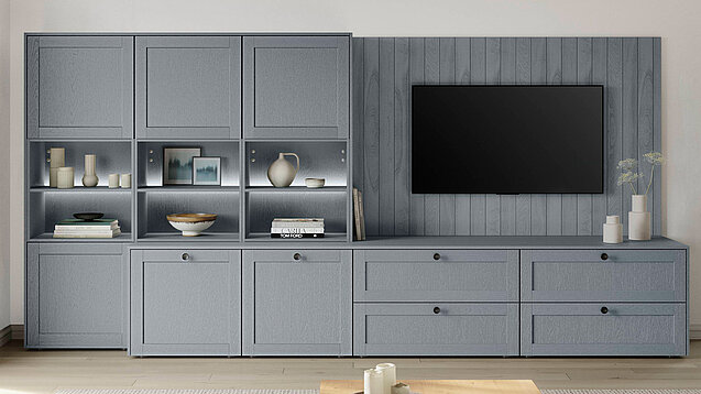 This stone-blue wood-textured wall unit blends cosy country charm with clean, modern lines. The soft blue tone brings fresh warmth to the room. Open shelves and closed cabinets give space for display and storage at once. The design feels natural and neat. It makes any living area look beautiful, fresh and a little special.