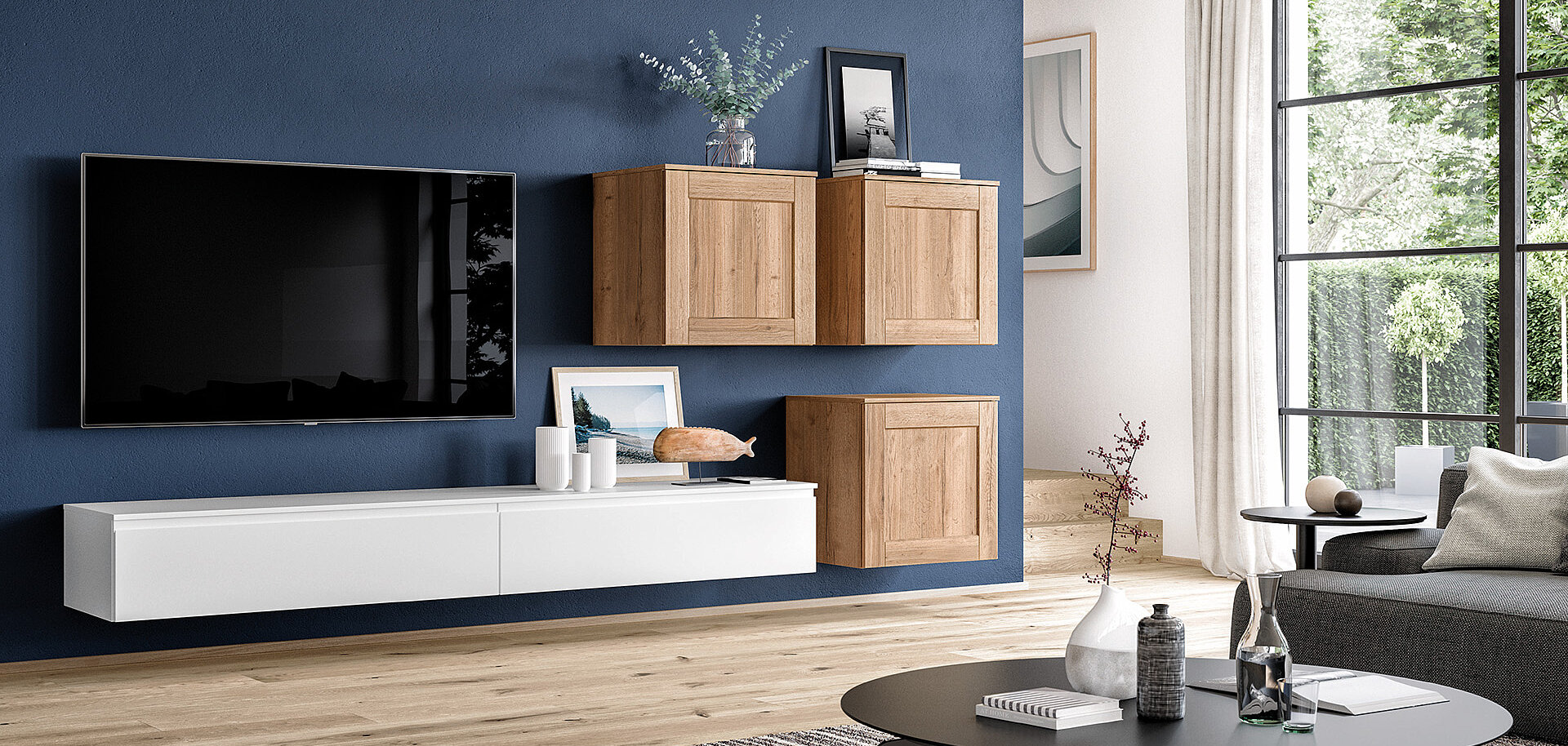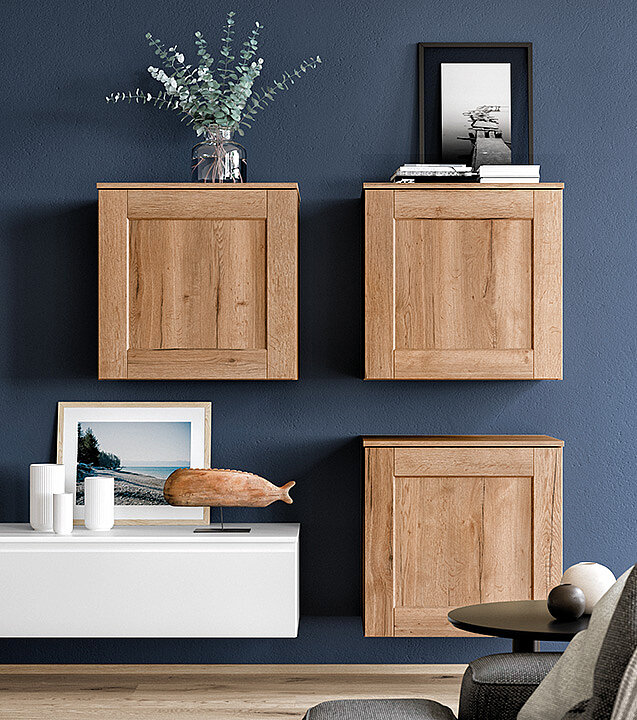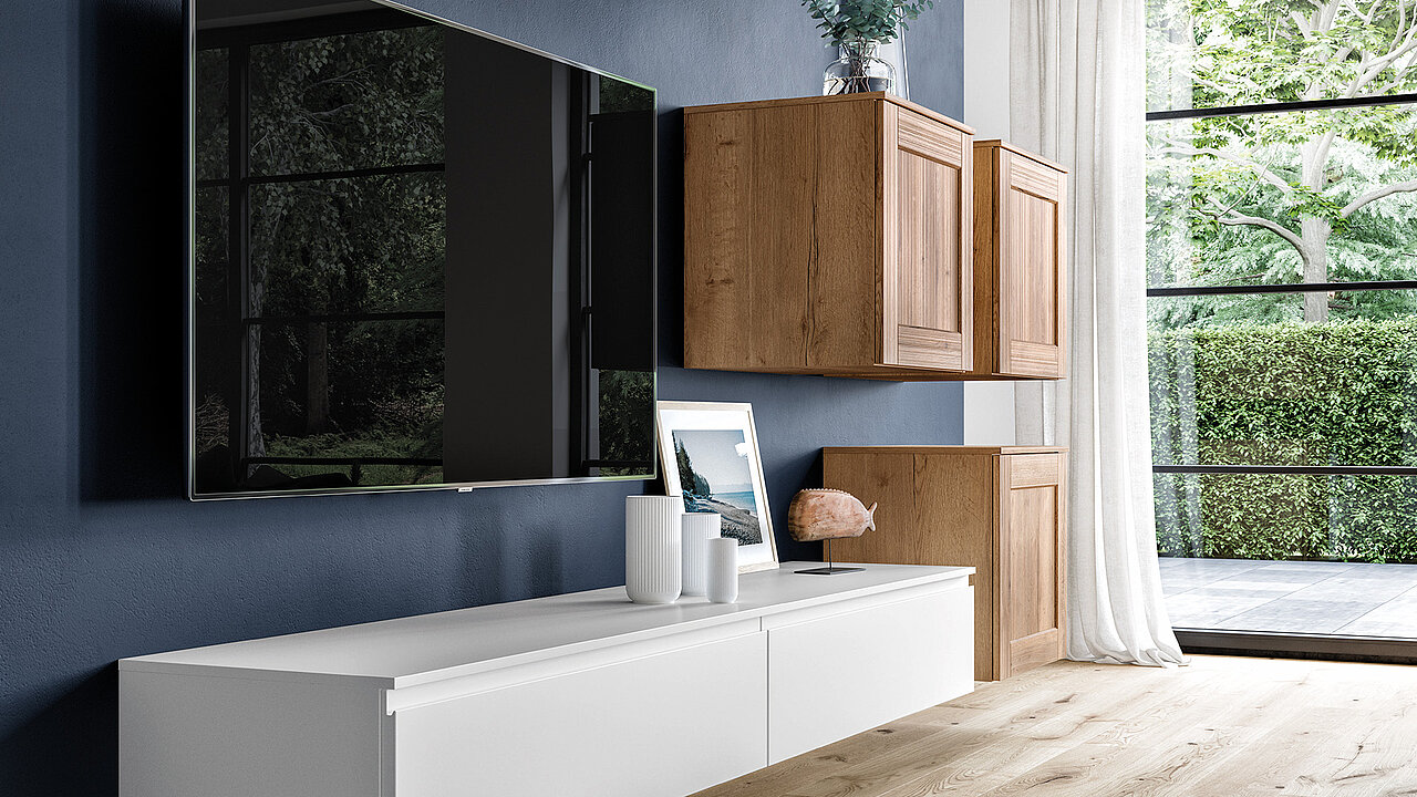The alpine-white matt sideboard pairs softly with warm oak shelves for a gentle, cosy feel. Clean lines keep the look simple and minimal. Open and closed parts give you room for display and hidden storage. The whole space feels airy, neat, and welcoming.
