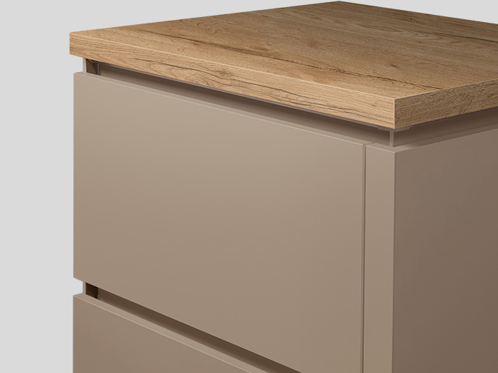 Taupe-toned macchiato and walnut accents give the wall-unit quiet luxury. Shelf inserts break up the design with subtle, tasteful rhythm. The media board lifts the screen and conceals wires cleanly. Integrated lighting sets a soft, refined glow. The result feels classy, balanced, and deeply refined.