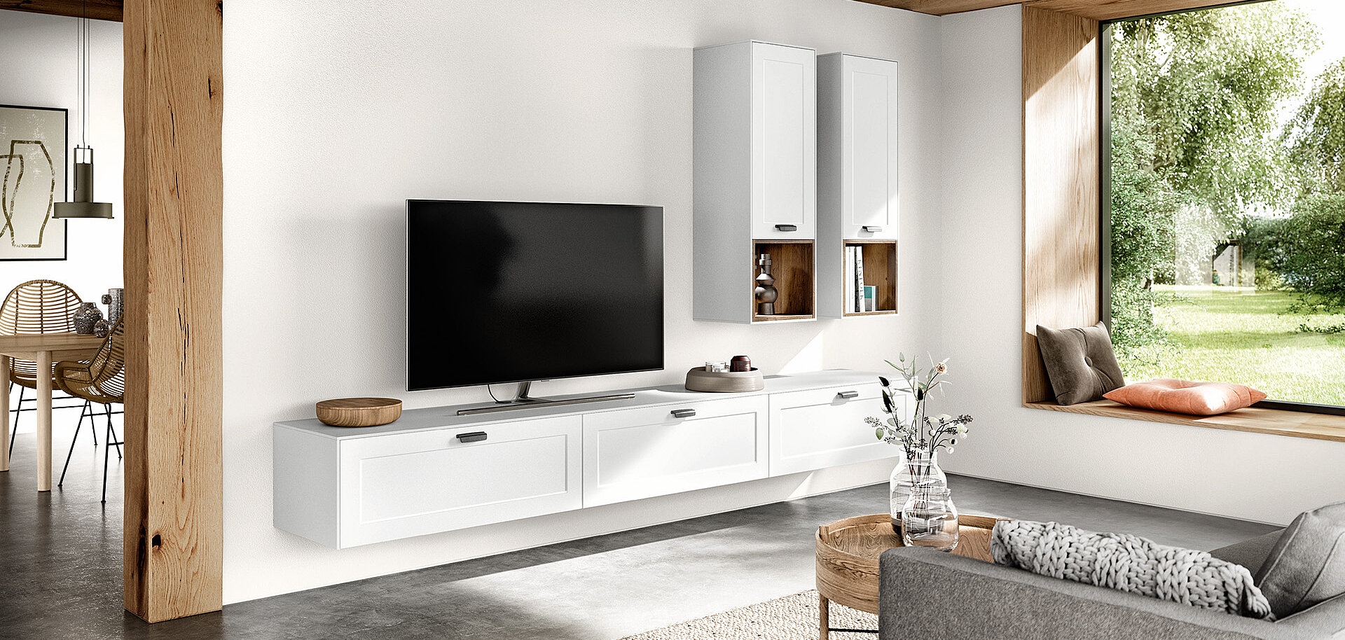 White-matt furniture softens the room with clean lines and light contrast. Oak-look shelves bring a warm, vivid touch. The mix of open shelves and closed cabinets keeps decor immaculate and flexible. The room feels calm, homely and timeless.