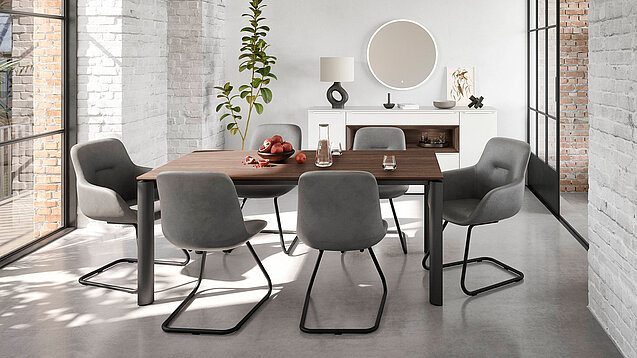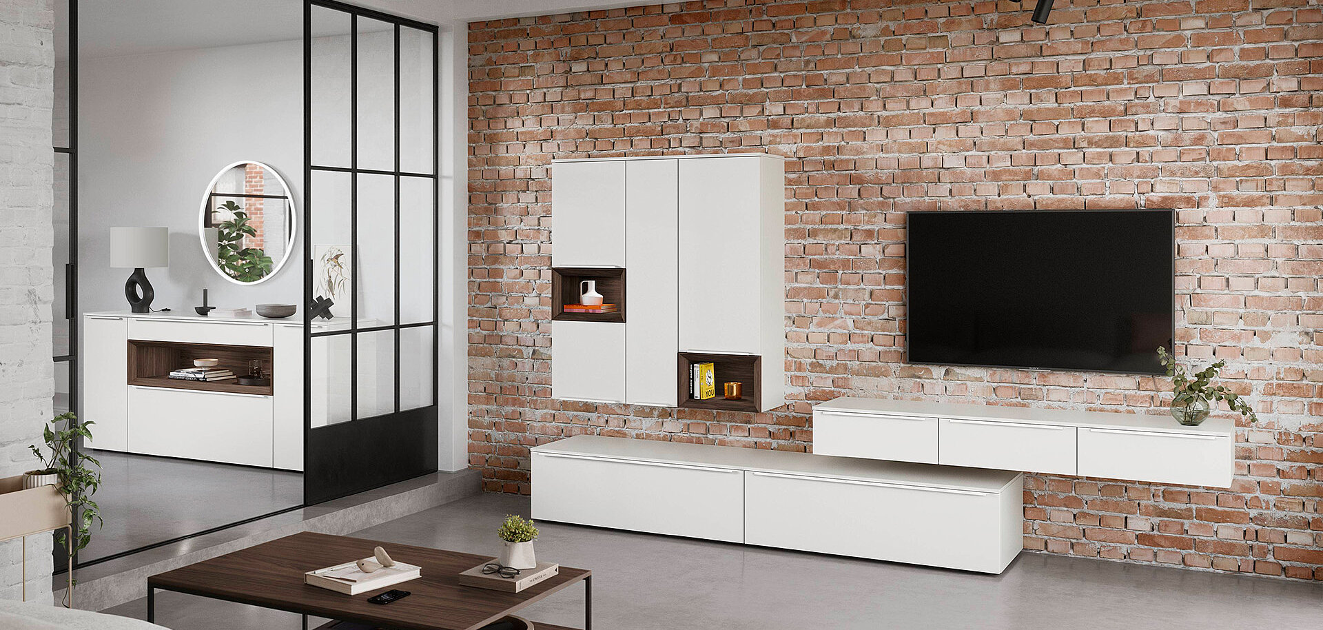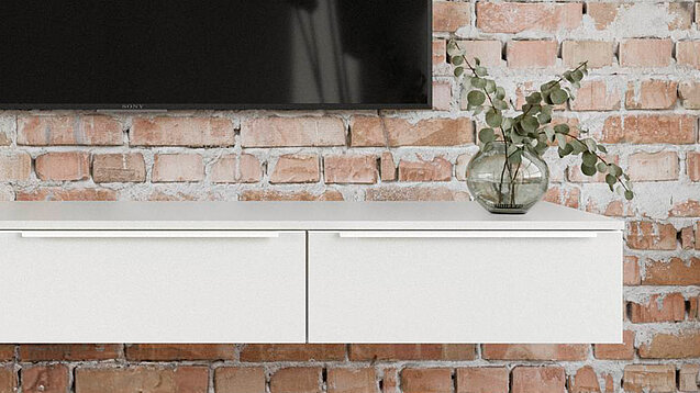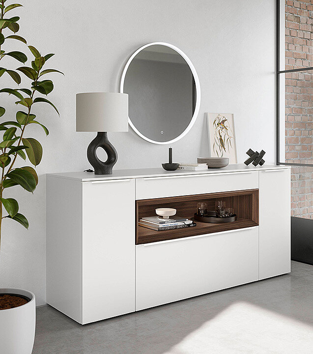 This sideboard with matt fronts and warm wood touches adds subtle elegance and comfort. Anti-fingerprint finish means no smudges, even in a busy home. The LED mirror adds light and a refined detail — giving the room character and depth. The result is a home ready for relaxed dinners and comfortable gatherings.