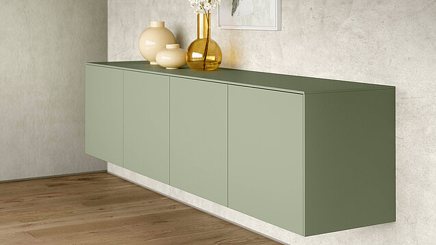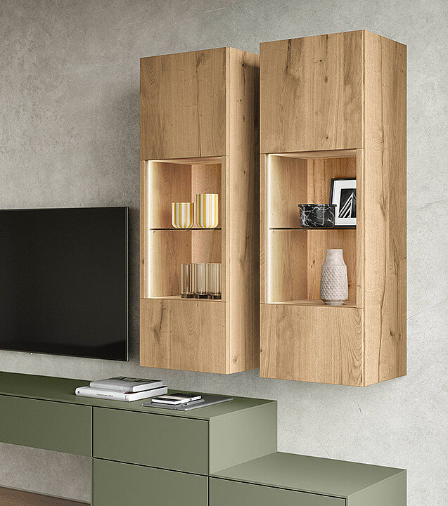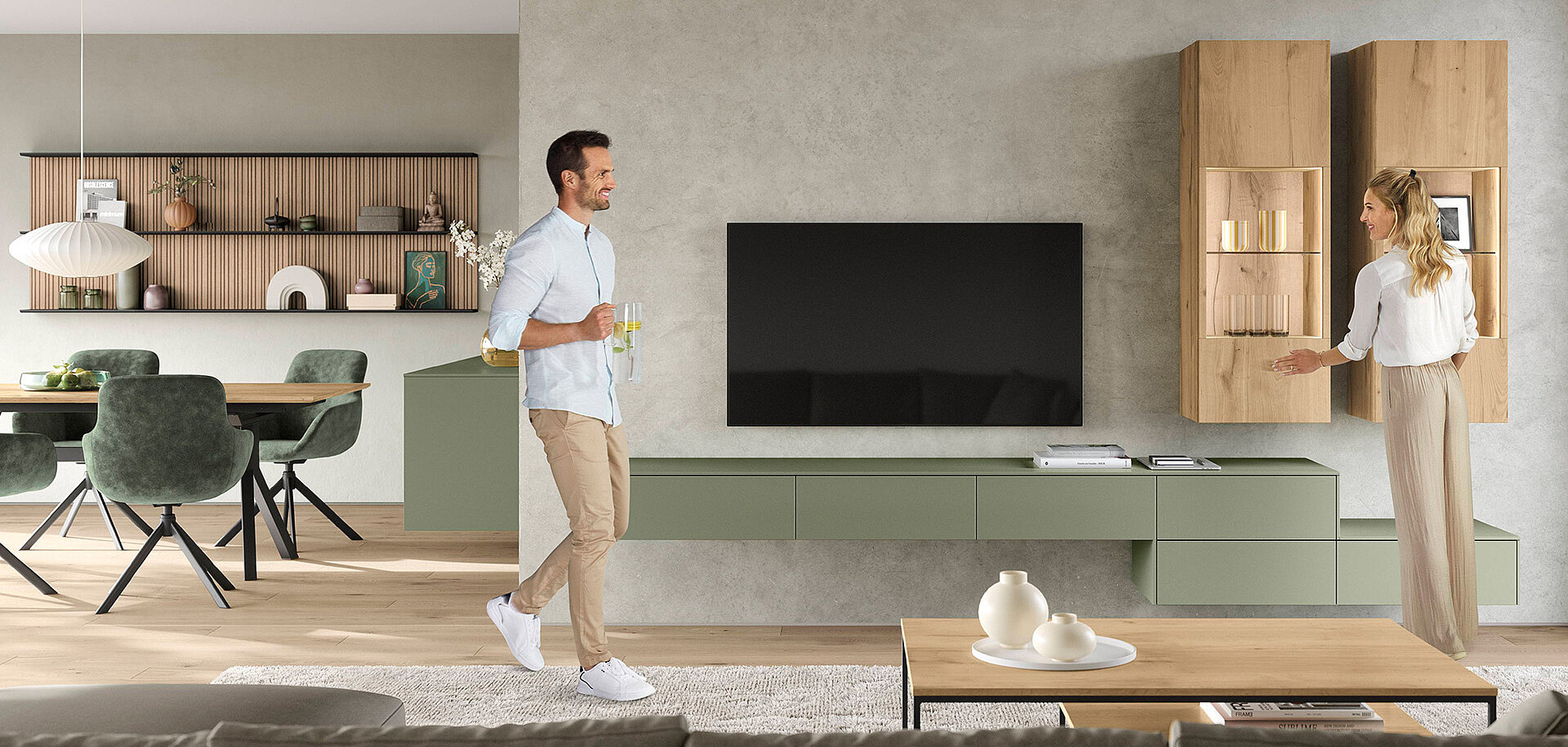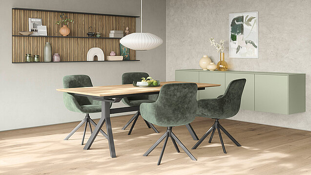 The olive trend colour and real-wood-veneer accents bring nature indoors. Soft wood grain adds warmth and natural texture. A light Stripewood-light niche keeps the room airy and open. The dark-steel dining table and Turn armchair add modern balance. The space feels relaxed, rejuvenating, and welcoming.