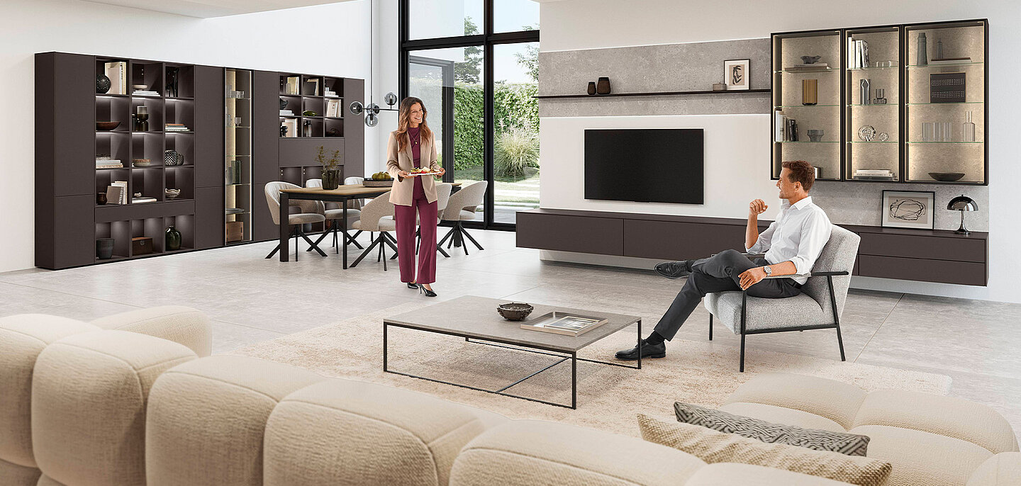 Room for style: these fronts establish their full effect through their velvety matte surface and the elegant coffee colour, adding to the look’s exclusive touch. The perfect complement to this assortment: the elegant Oslo dining table with butterfly technology for extending and the elegant Turn II armchairs.