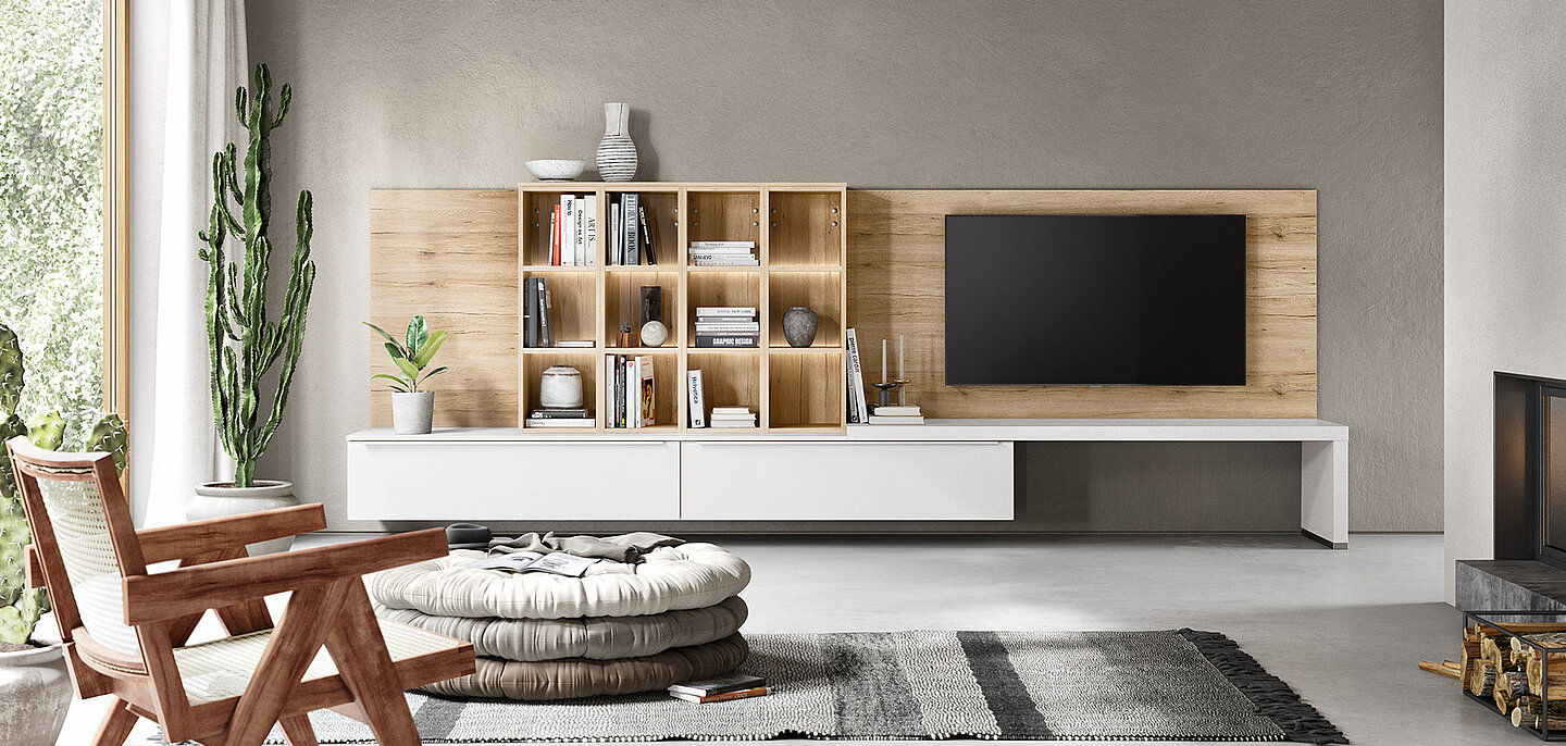 Bring harmony and style to your living room with light-coloured surfaces, and create a bright and calming atmosphere with the wooden details adding warmth and depth. Minimalist shapes combine with practical elegance and transform the room into a place both modern and inviting, which is perfect for relaxing and spending time.