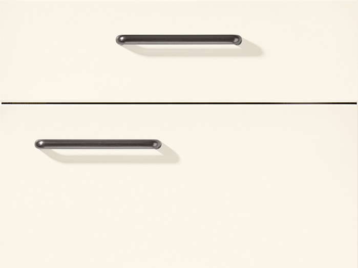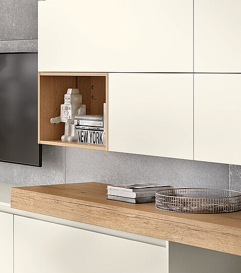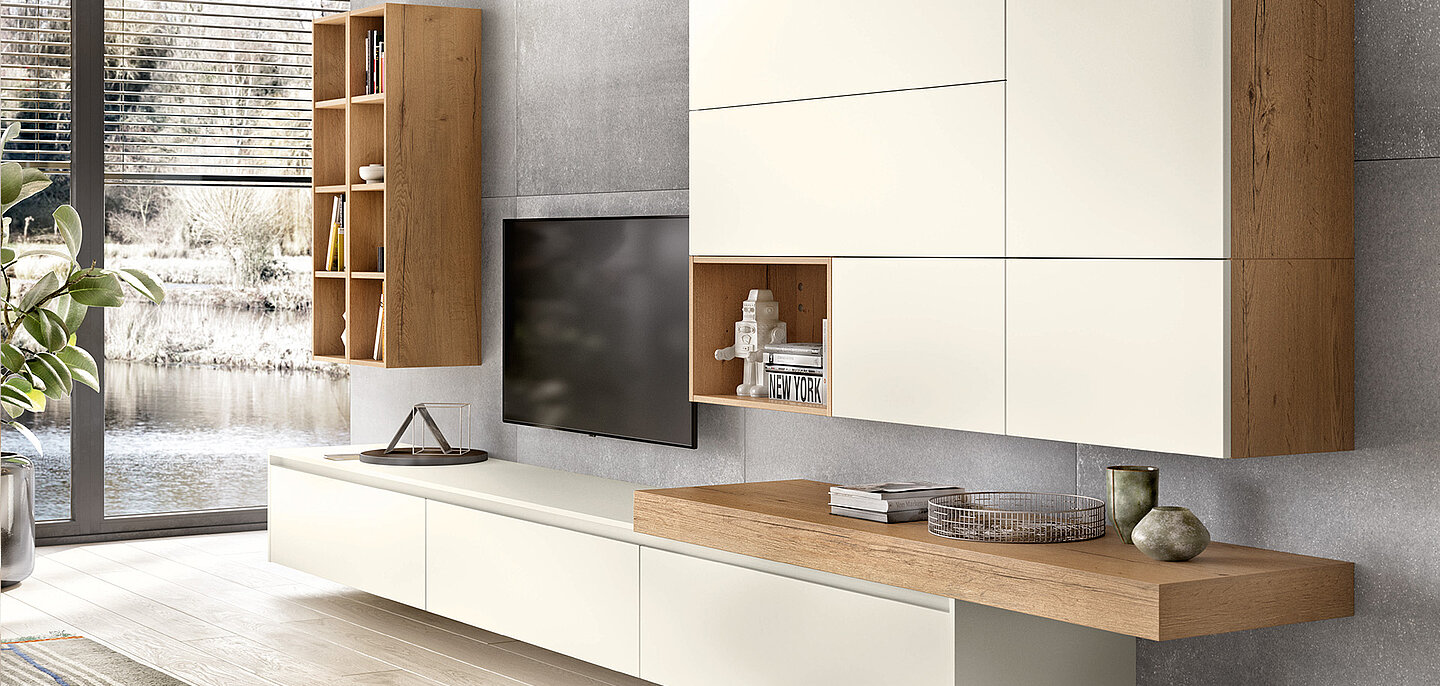 A modern solution with uniform and large format fronts that make room for more design options, storage and better organisation. An excellent solution combining cupboard and shelf units to add depth and structure to the room. The standout detail here is the integrated console panel in Sierra Oak.