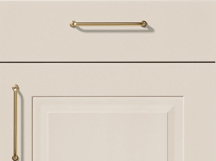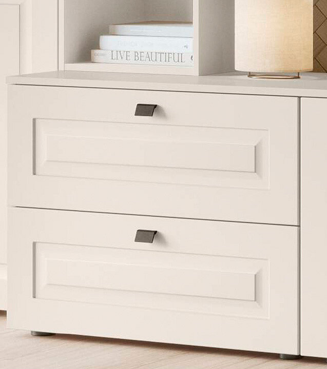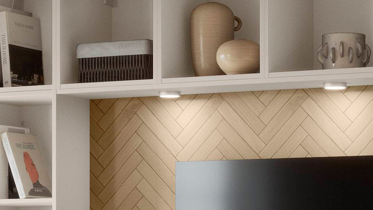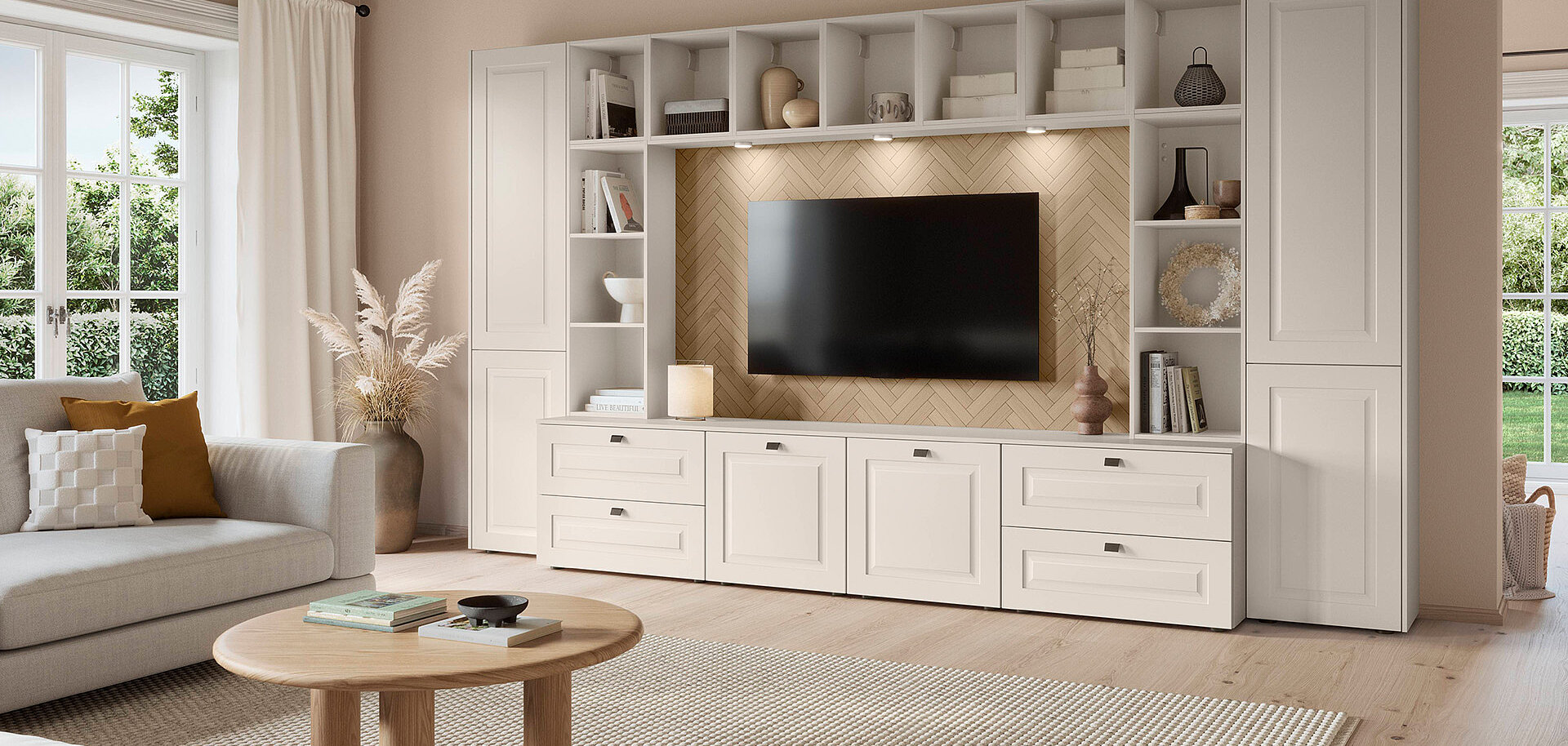The classic country house design in an earthy sand tone and stuns with its symmetrical aesthetics and classically elegant style, which is simply romantic. Carefully coordinated proportions, fine, high-quality materials and accent lighting characterise the overall look and give the room a natural and contemporary expression. The niche cladding with herringbone pattern in Como oak decor is a charming detail, and the open compartments provide space for decorative favourites.