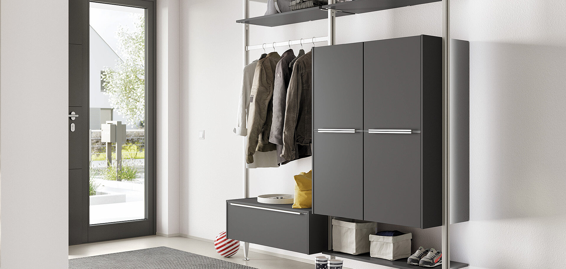 With fronts and car case in slate grey super matte, this piece of furniture is full of timeless elegance and adapts to any room situation with ease. The shelving system offers maximum variability: it can be extended as required and can be customised with cupboards, pull-outs, shelves, and clothes rails. This transforms any hallway into a real space miracle.