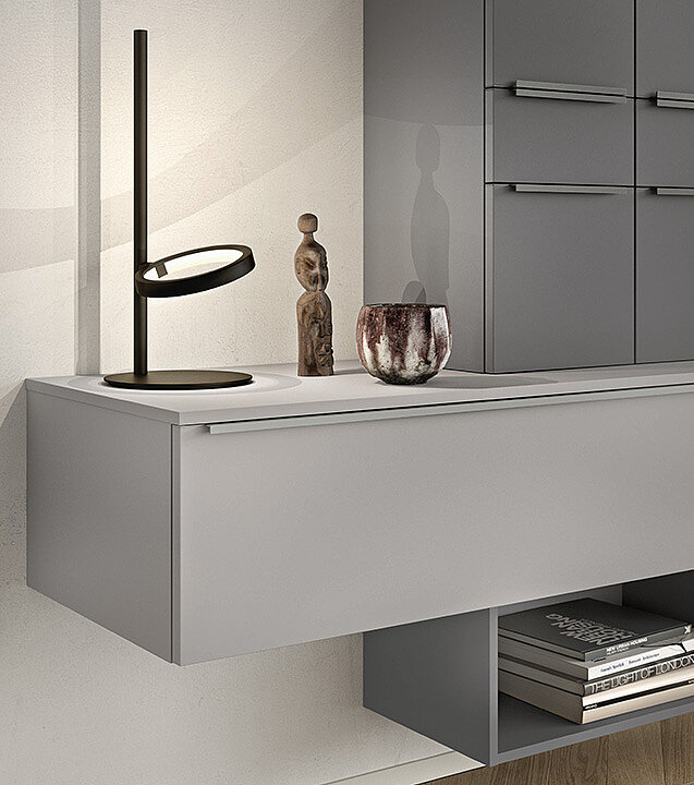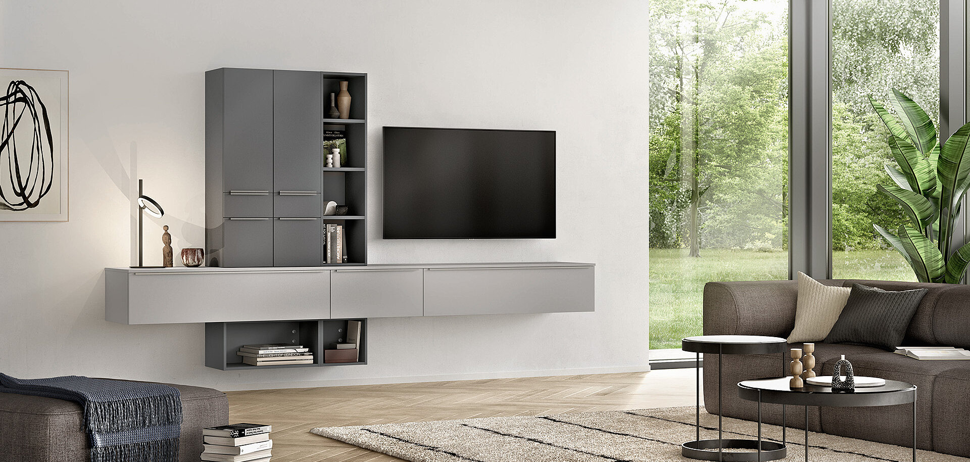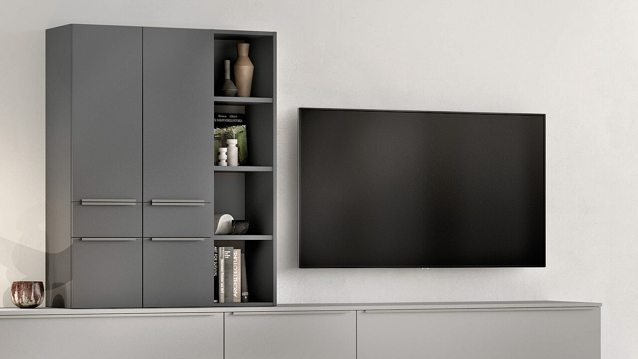 The perfect mix of style and function with plenty of space for beautiful things, the sideboard in stone grey super matte provides order and adds a modern accent to any living area at the same time. The shelf insert breaks up the high-contrast wall unit element and creates a special overall look. Clearly reduced and a real charmer.
