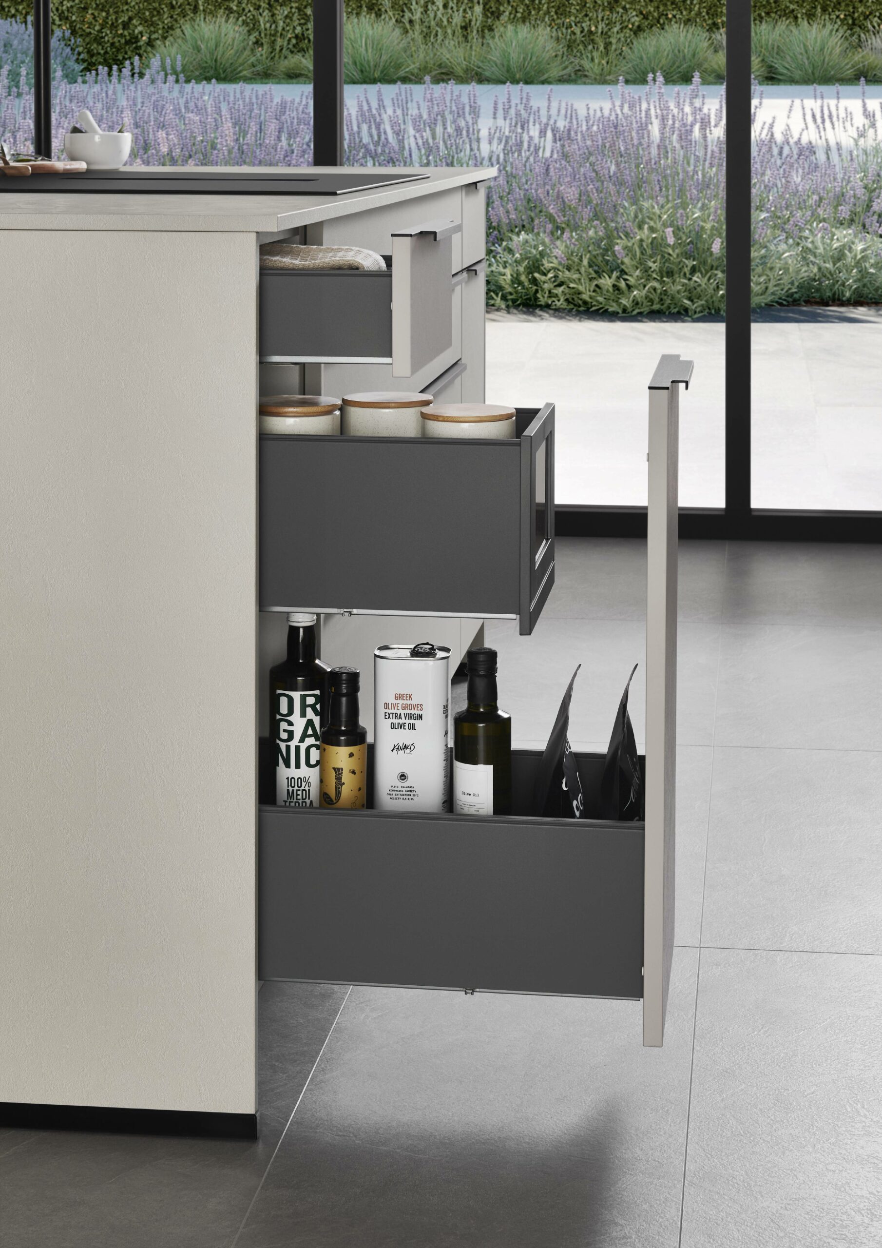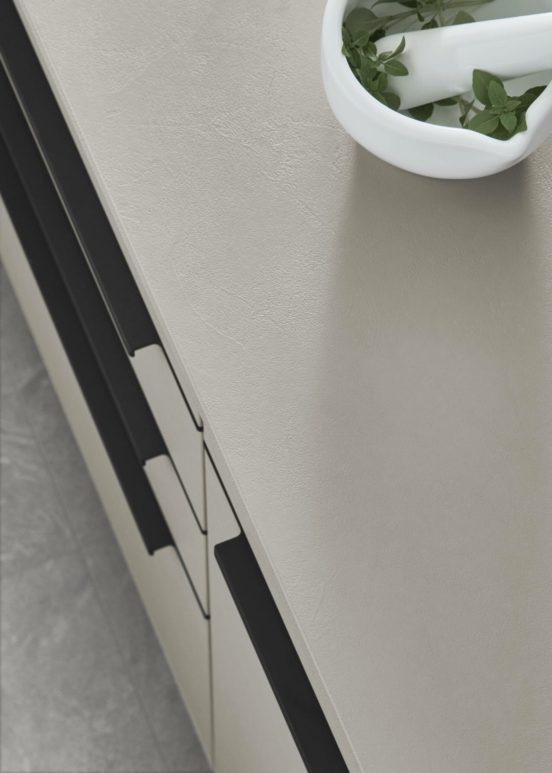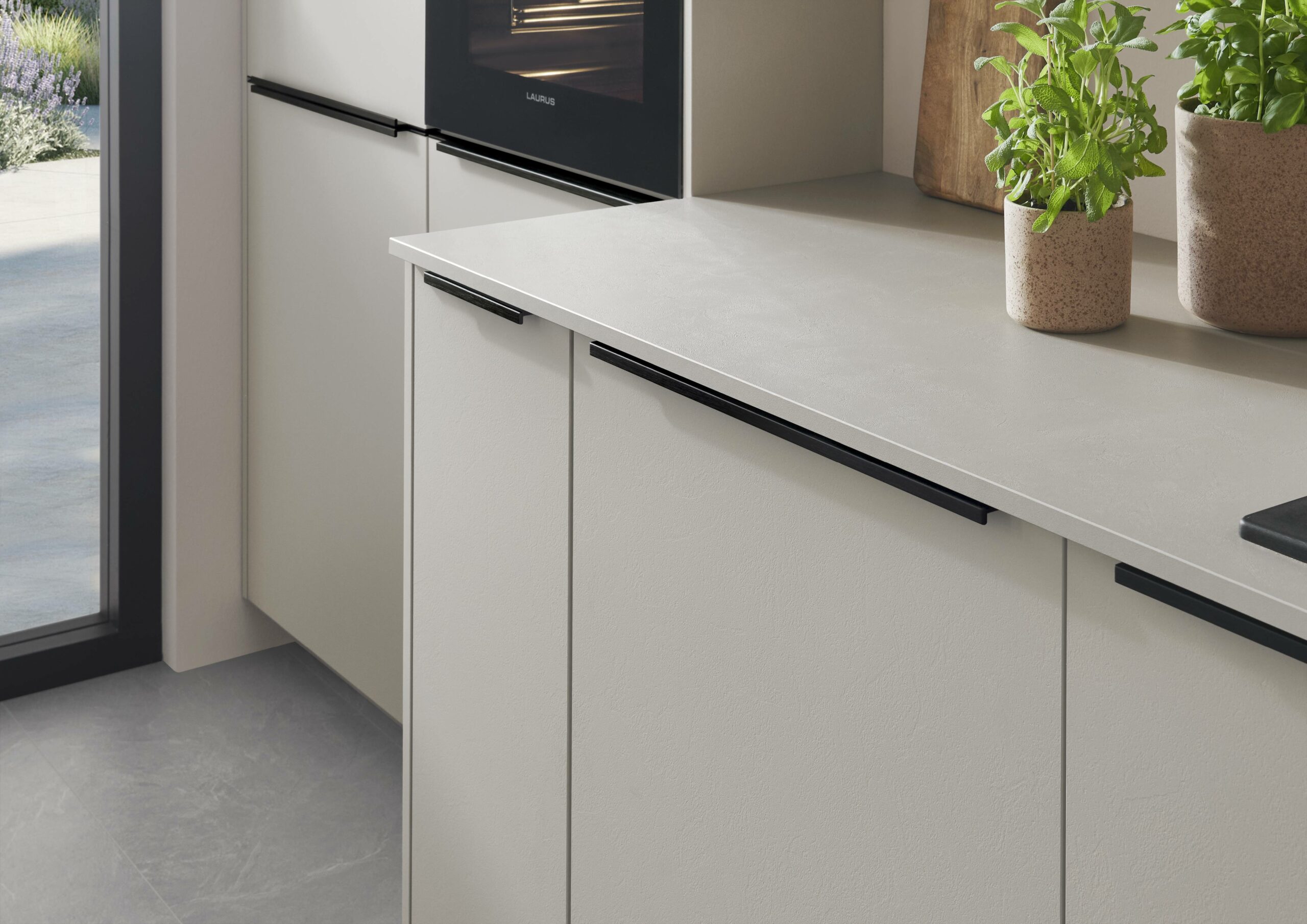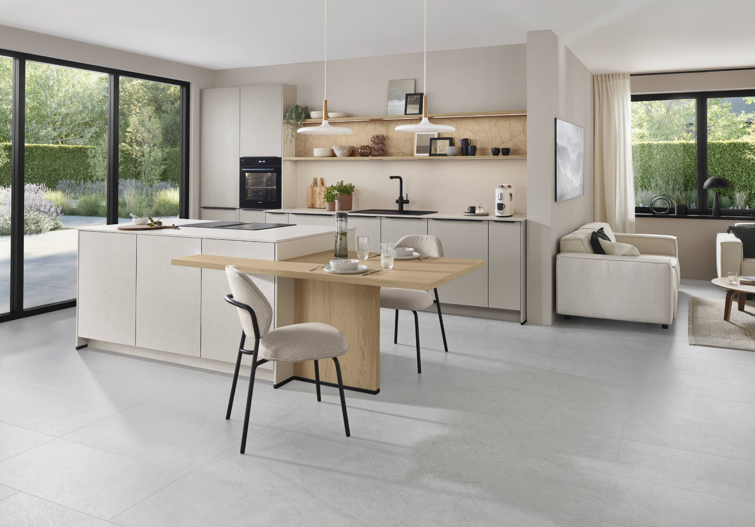 An impressive interplay that is both visually and physically convincing: the clear sand tone brings calm and quiet to the room, and the subtle texture fronts add a subtle liveliness. The textured Slim Line worktop and oak-look niche cladding adds depth and warmth, creating a balanced, harmonious mix of natural colours and interesting materials.