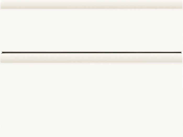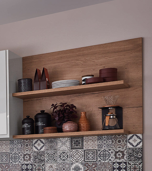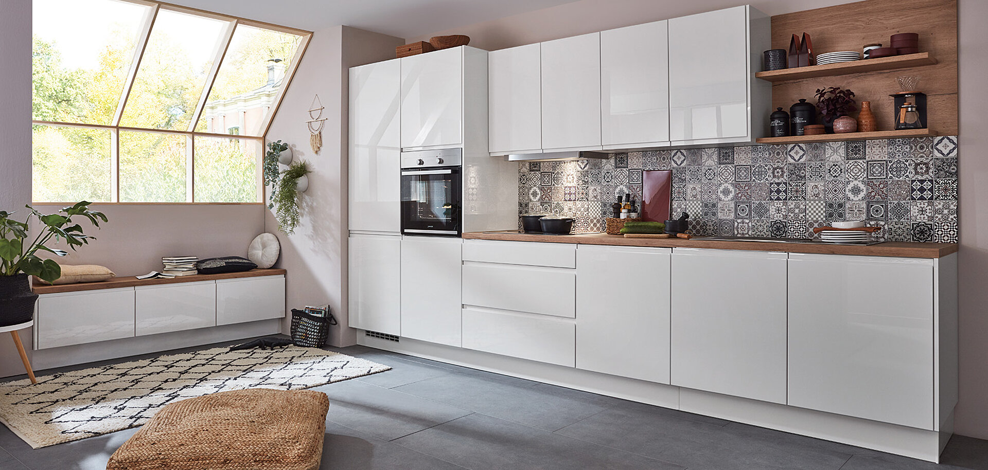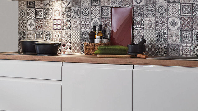 Glossy white surfaces meet warm, natural finishes for a fresh kitchen look. A ceramic tile-style wall adds visual depth and a hint of bright mosaic charm. This touch brings subtle character to your kitchen space. The overall effect stays clean, calm and inviting.