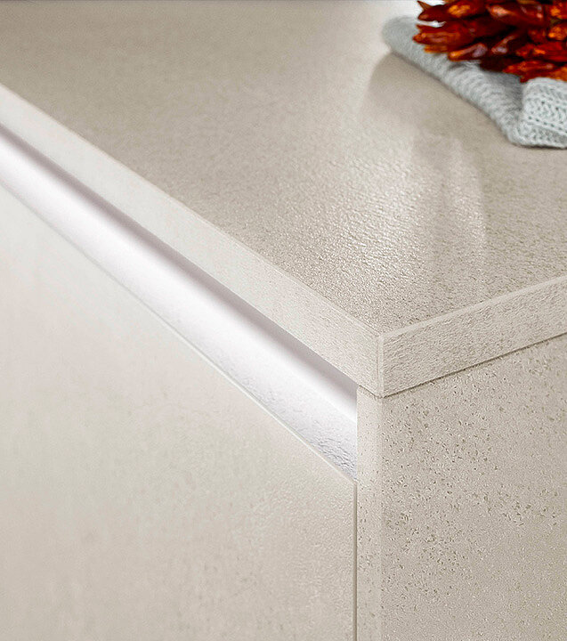 The design blends new concrete-shade “Sand” fronts with wide sliding doors in warm sand tones. The doors match the worktop décor with their real ceramic surface. The result is tranquil and full. The kitchen feels like a quiet, high-end space.