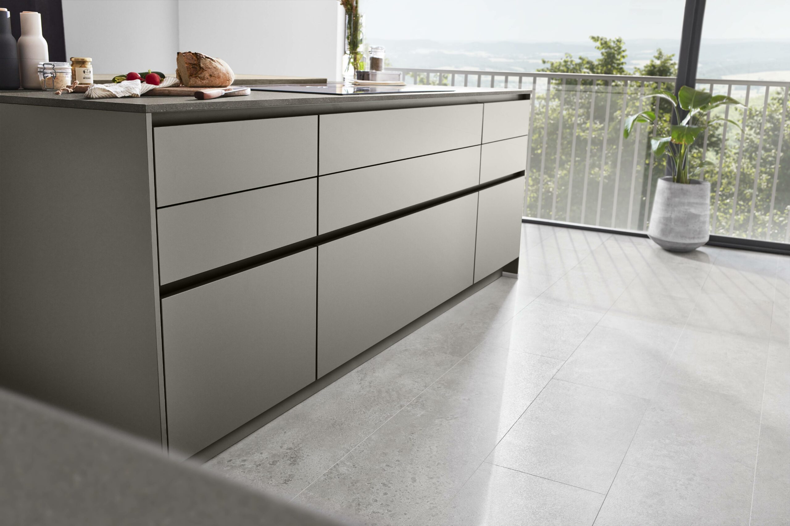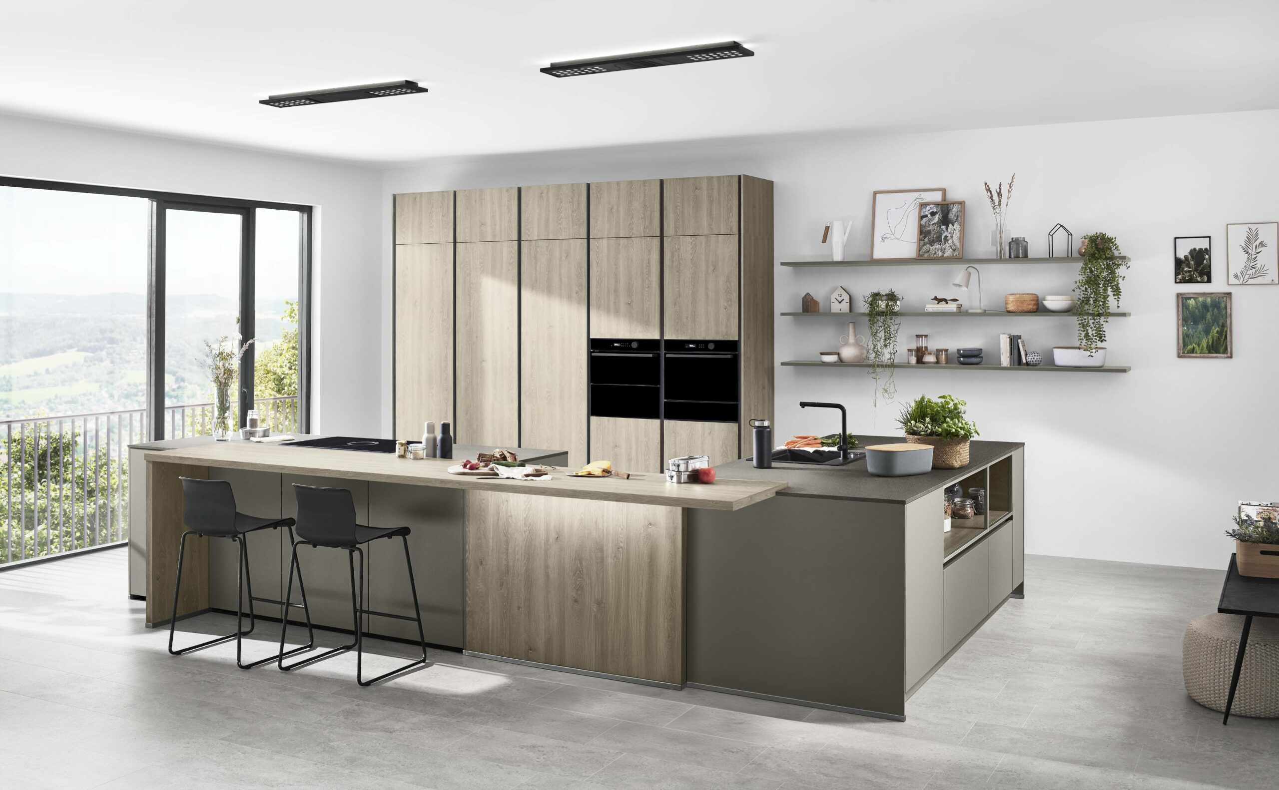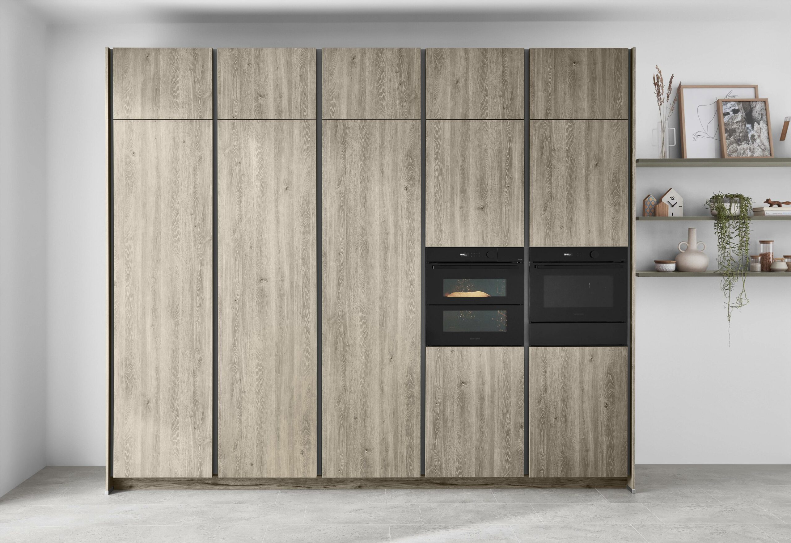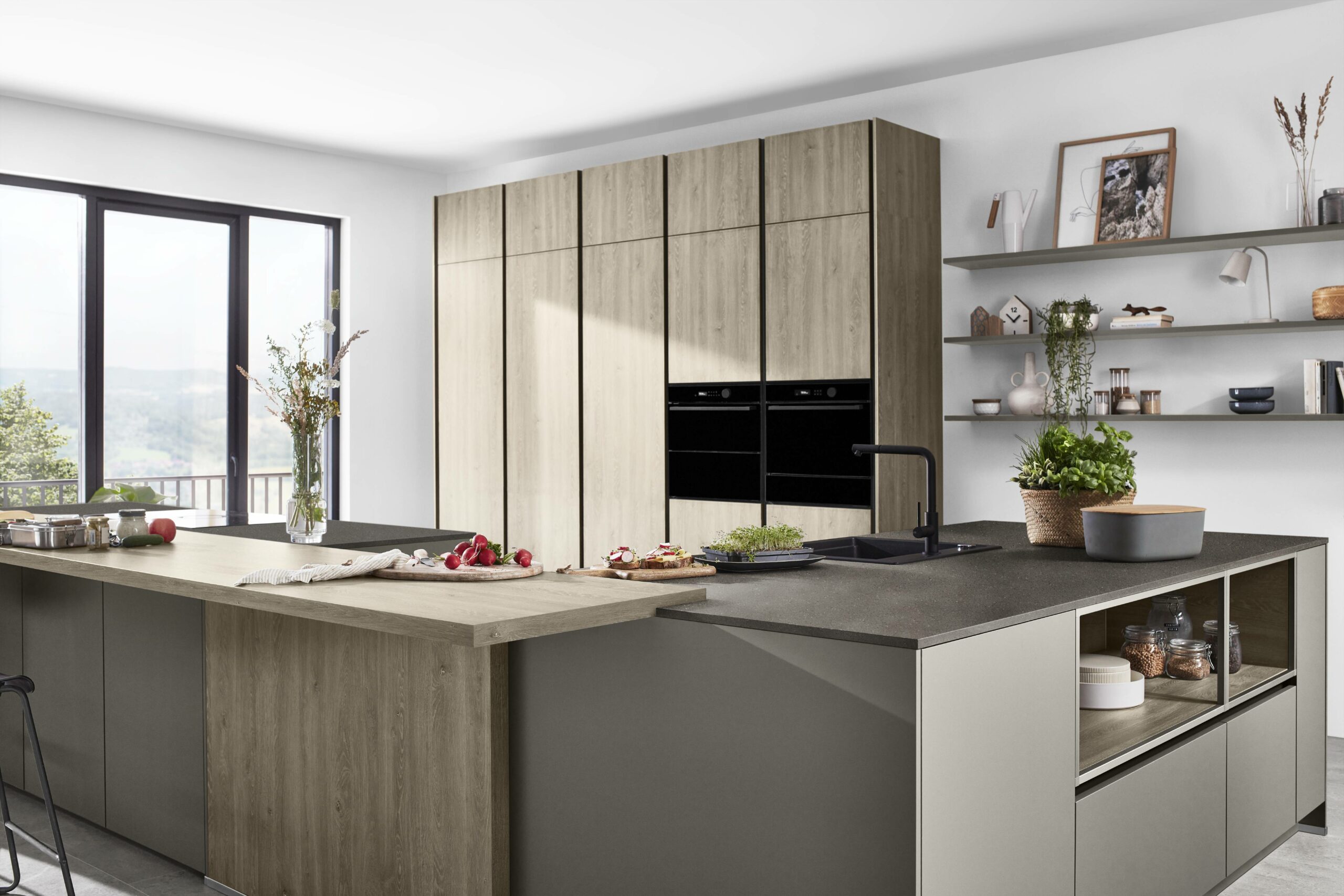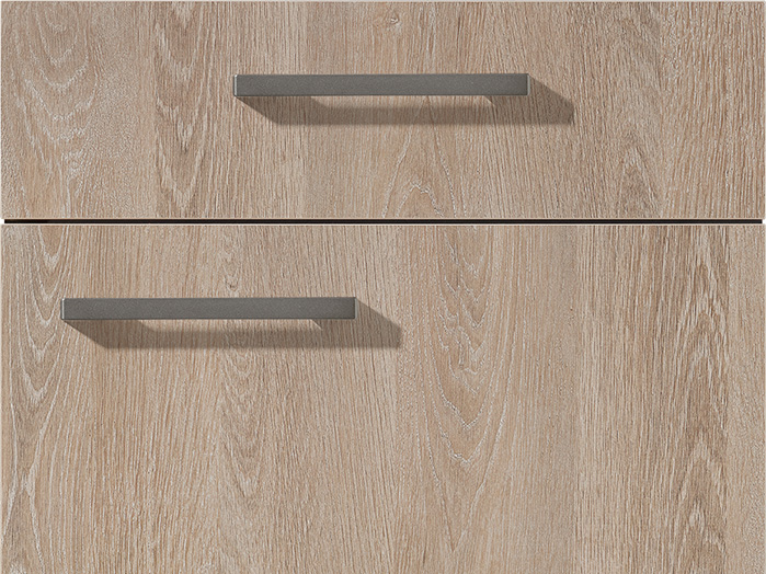 A love for nature shows in warm wood tones and clean, simple lines. The new wood-grain Bergamo oak front feels natural, with tall doors that draw the eye. The soft taupe grey brings a calm match. The taupe worktop with its stone-look fibre adds a quiet, refined depth. The look feels premium, fresh and grounded.