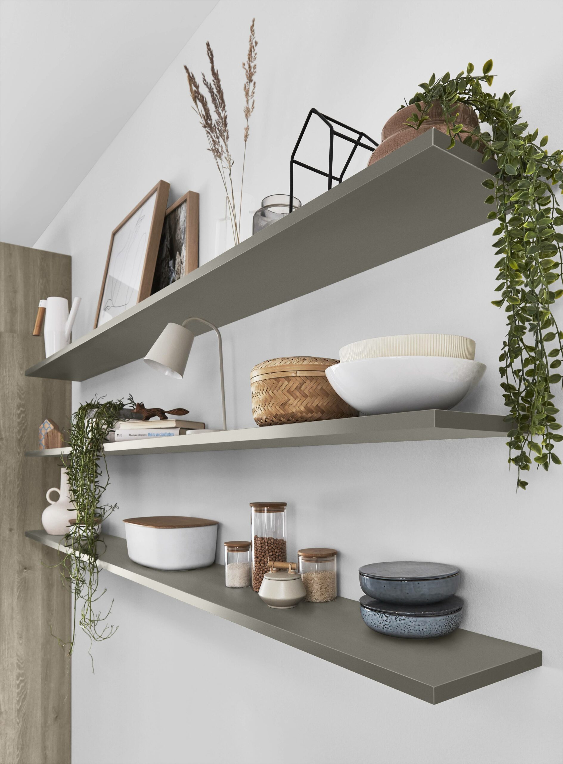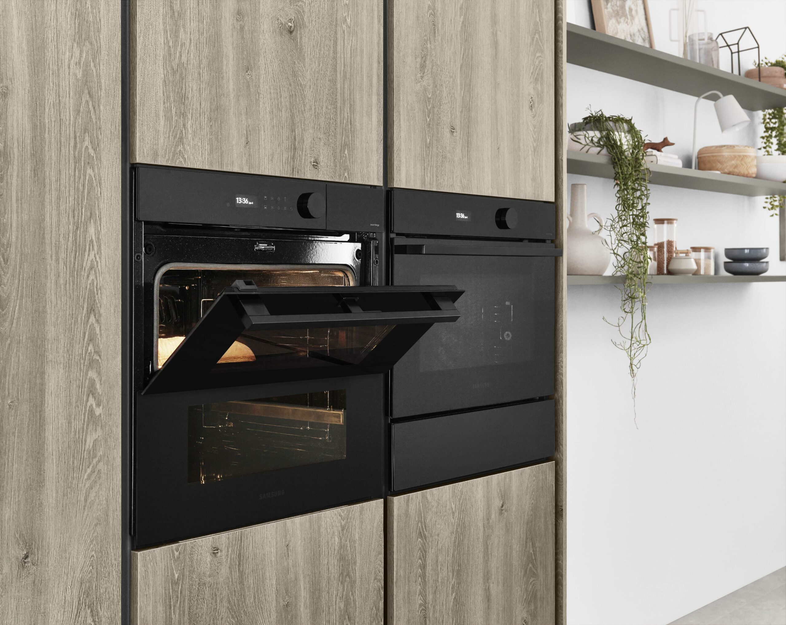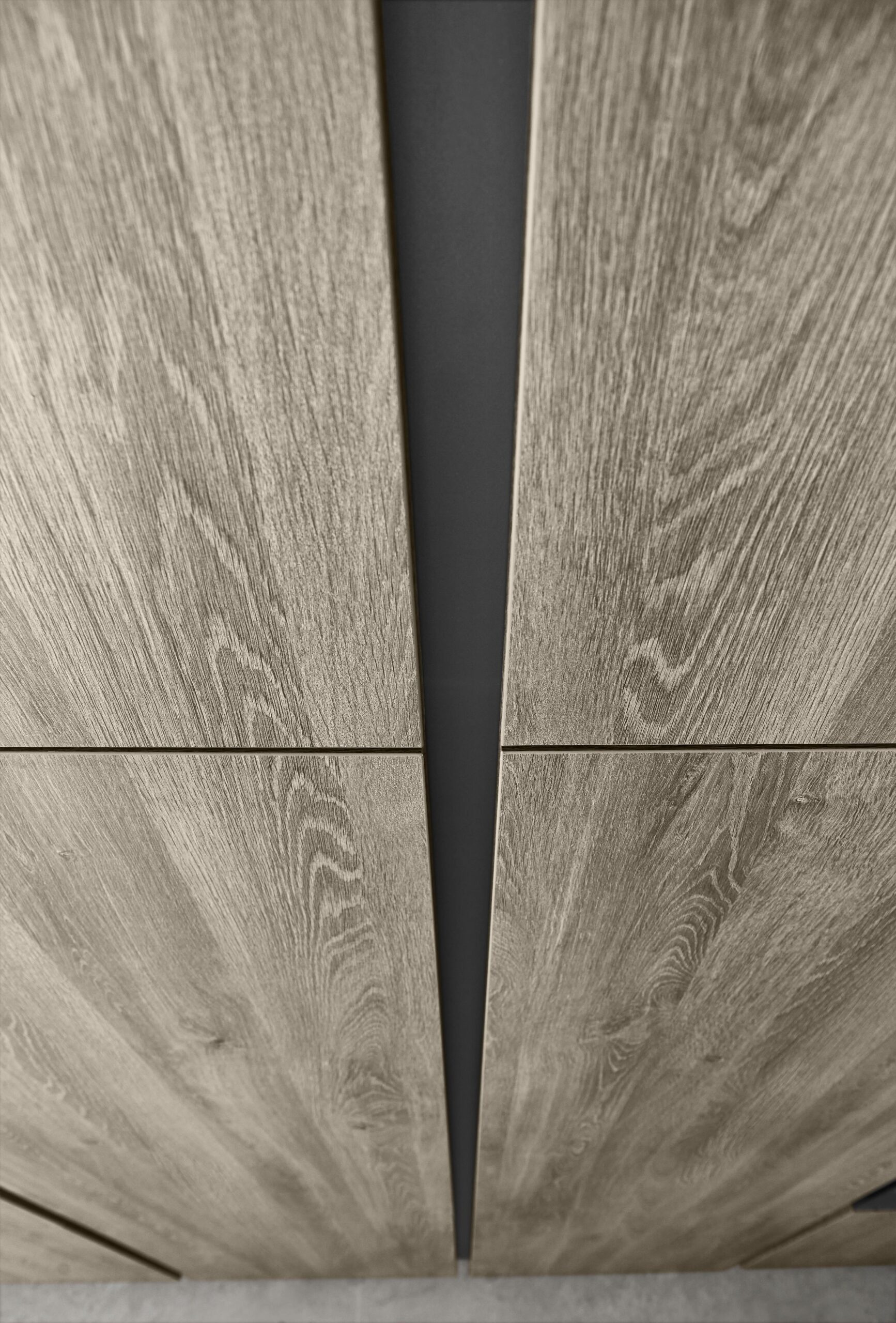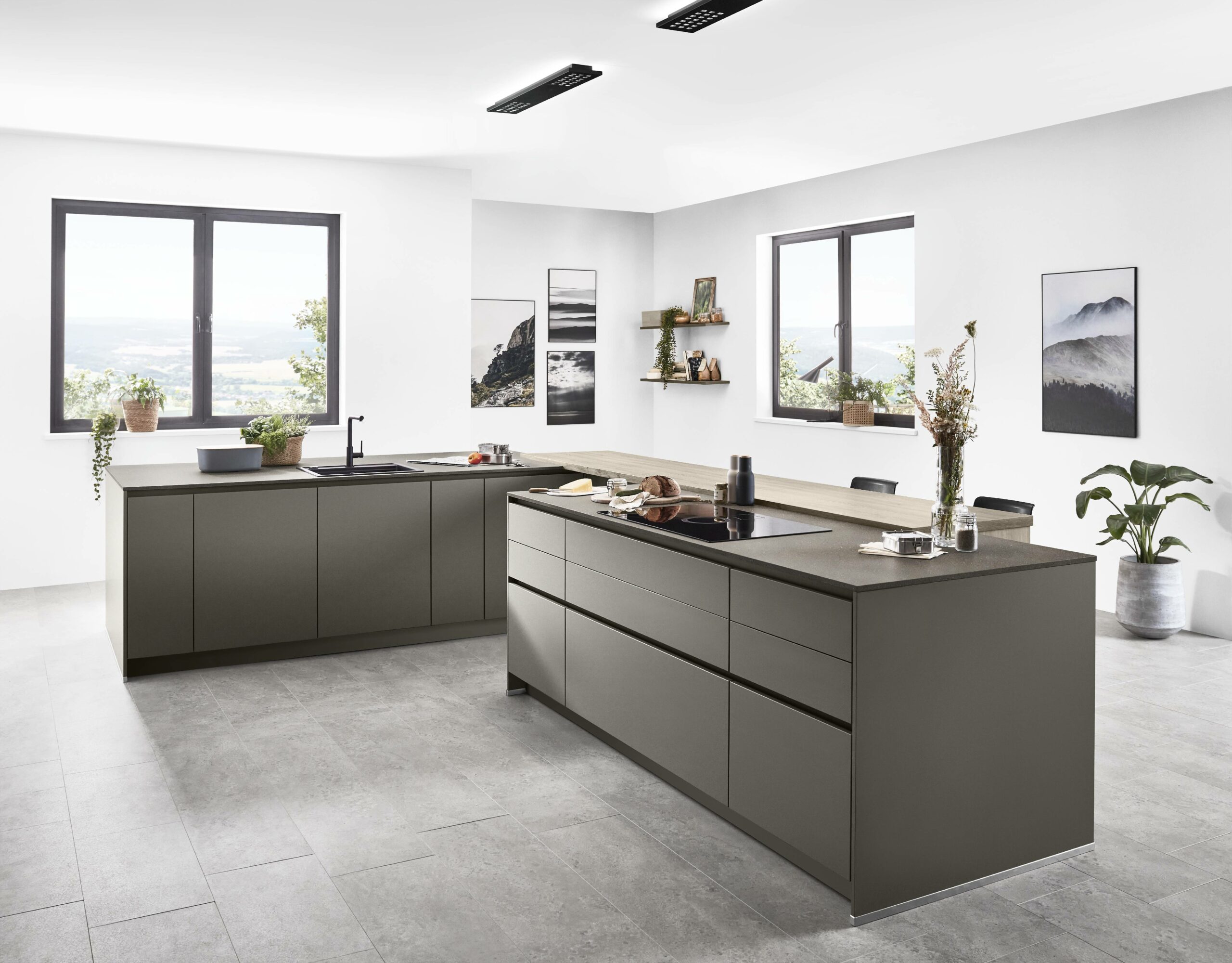A love for nature shows in warm wood tones and clean, simple lines. The new wood-grain Bergamo oak front feels natural, with tall doors that draw the eye. The soft taupe grey brings a calm match. The taupe worktop with its stone-look fibre adds a quiet, refined depth. The look feels premium, fresh and grounded.