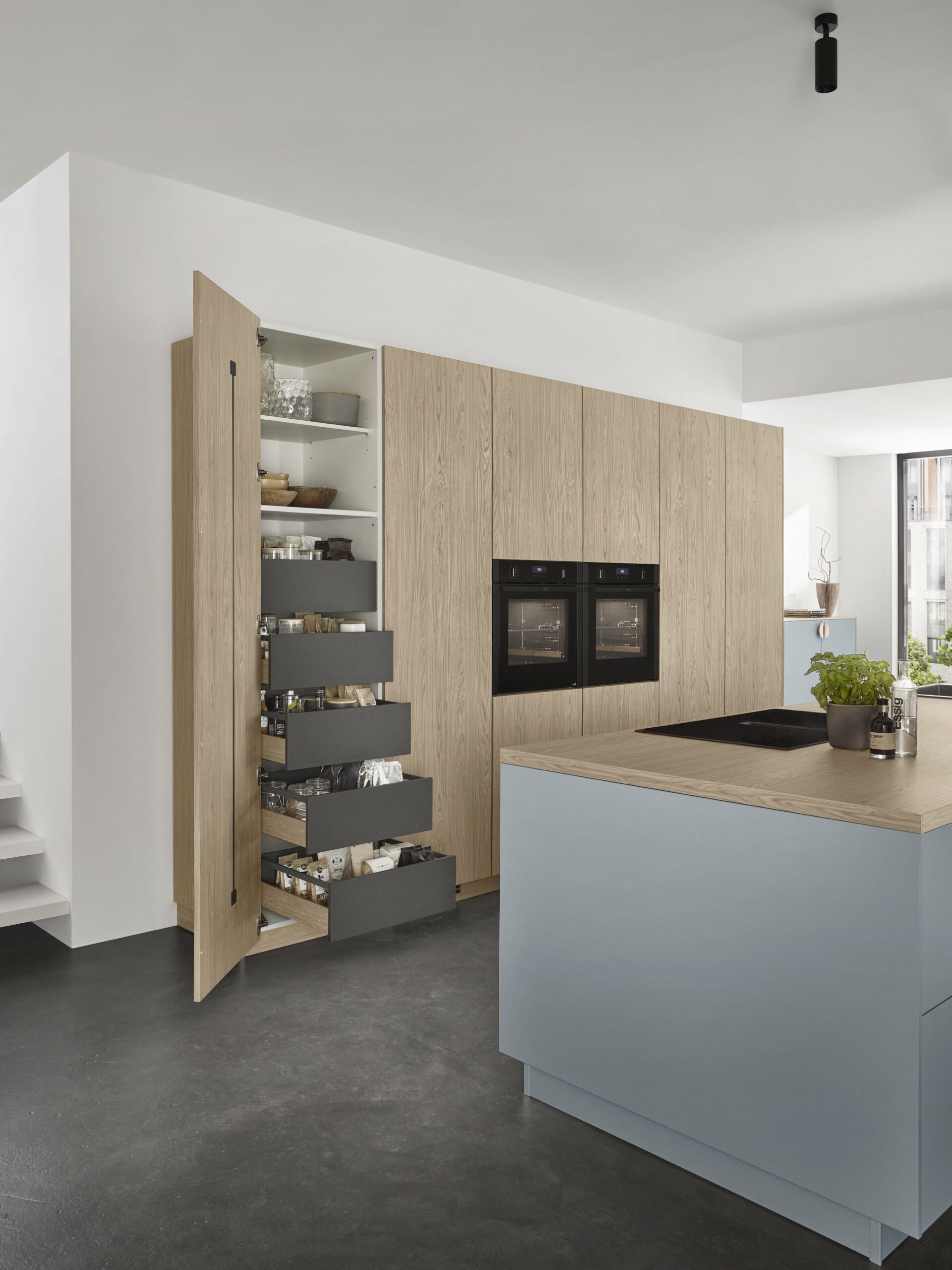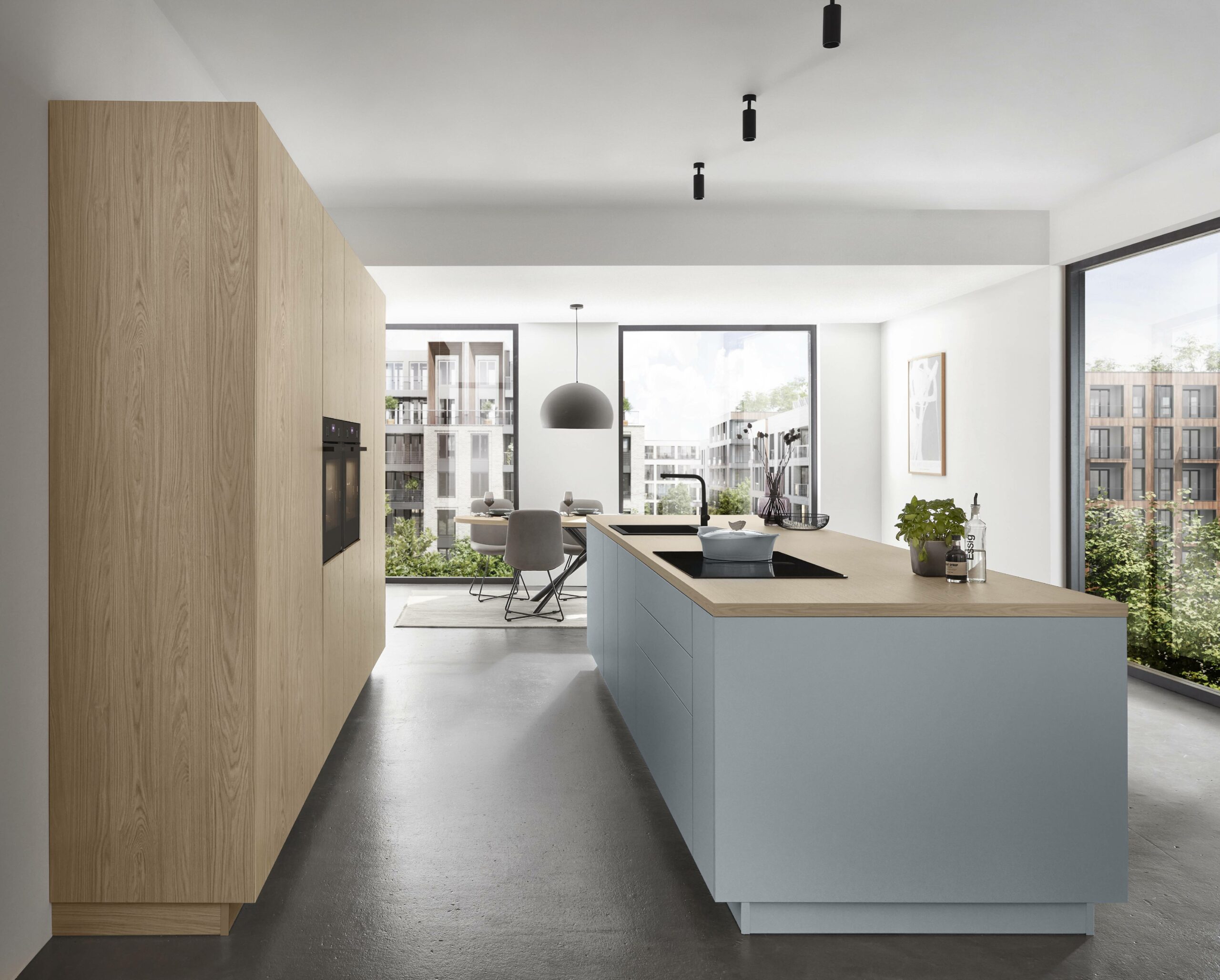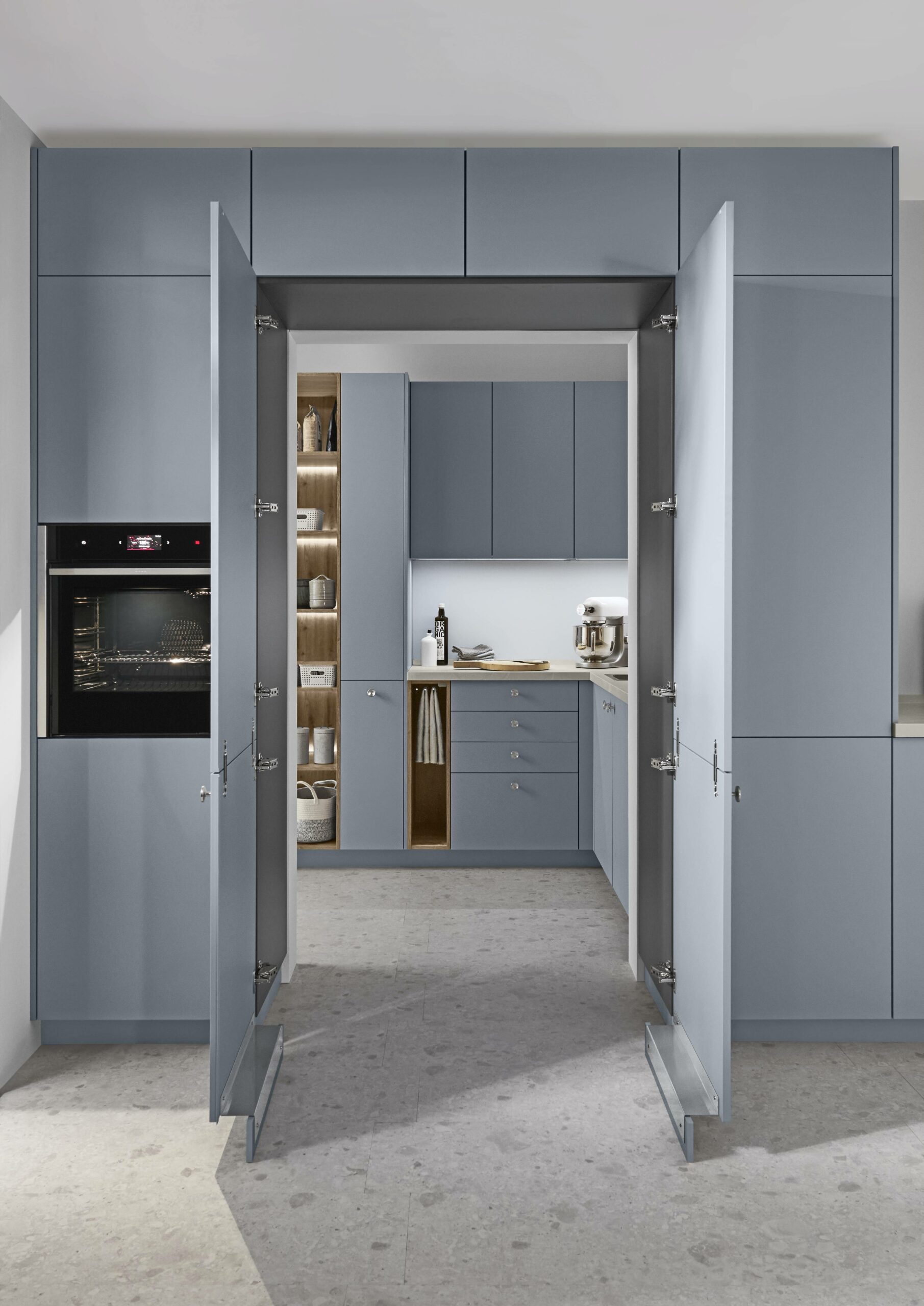 Soft sky-pastel tones make a small kitchen feel open, calm and neat. Light colour and matching shades blur edges and lift space. Clever layout hides doors and links the utility room quietly into the kitchen. The result feels clean, calm and premium.