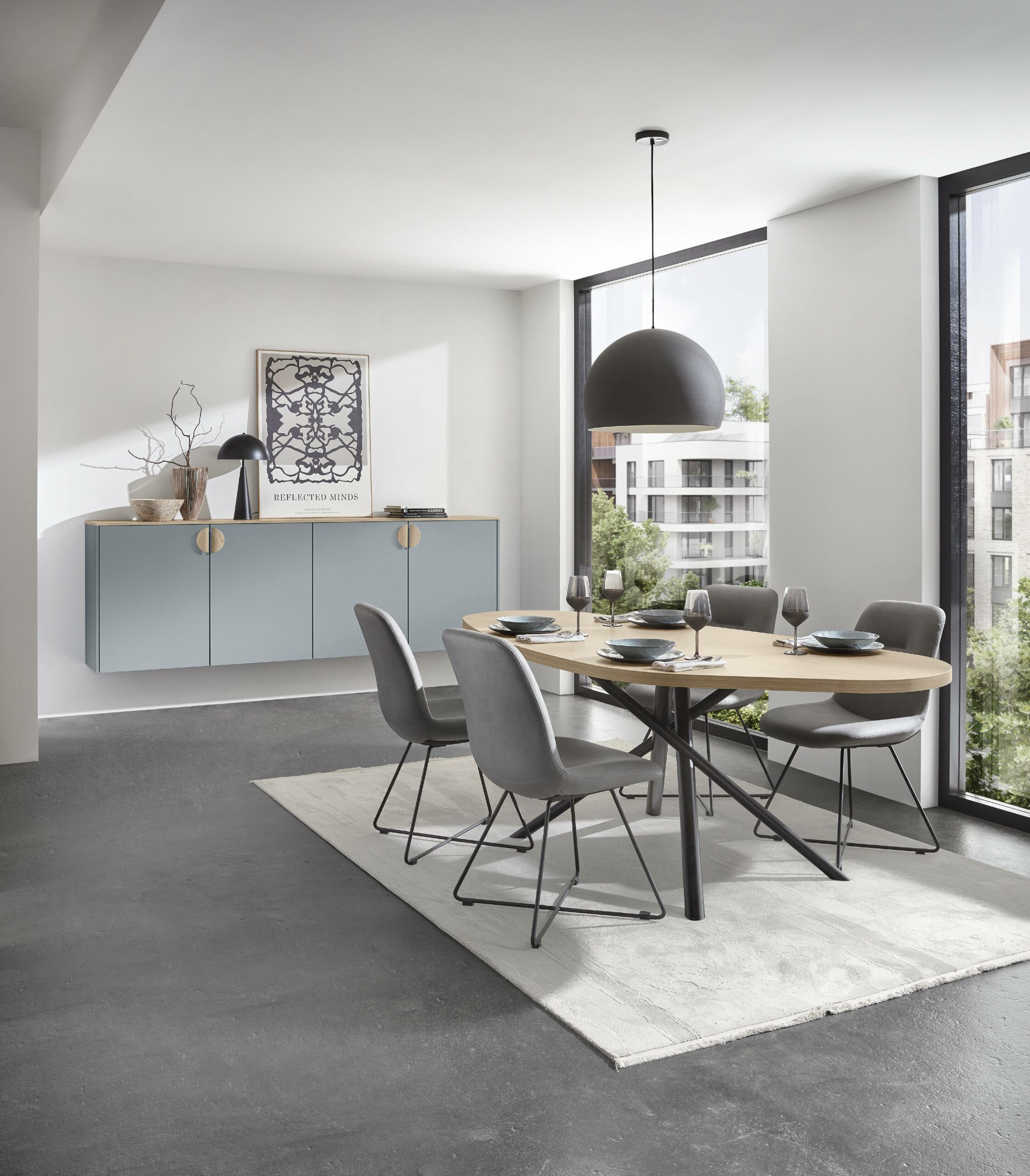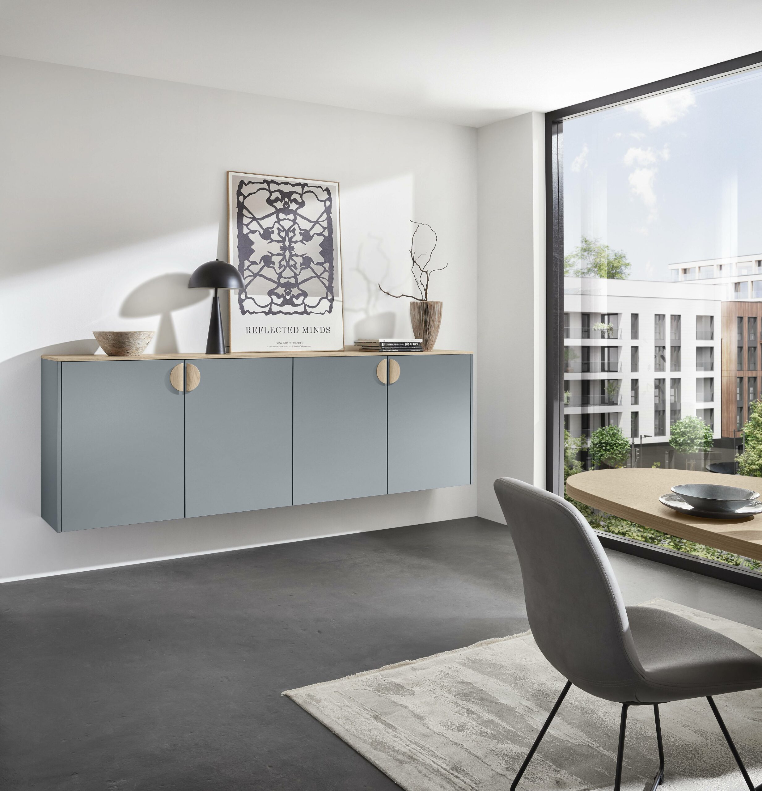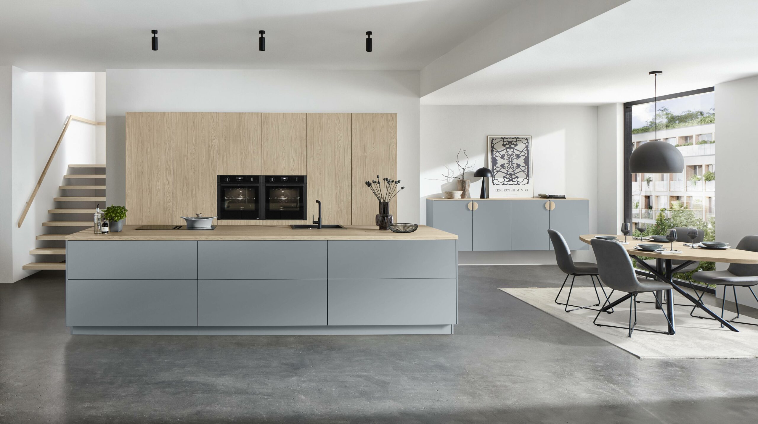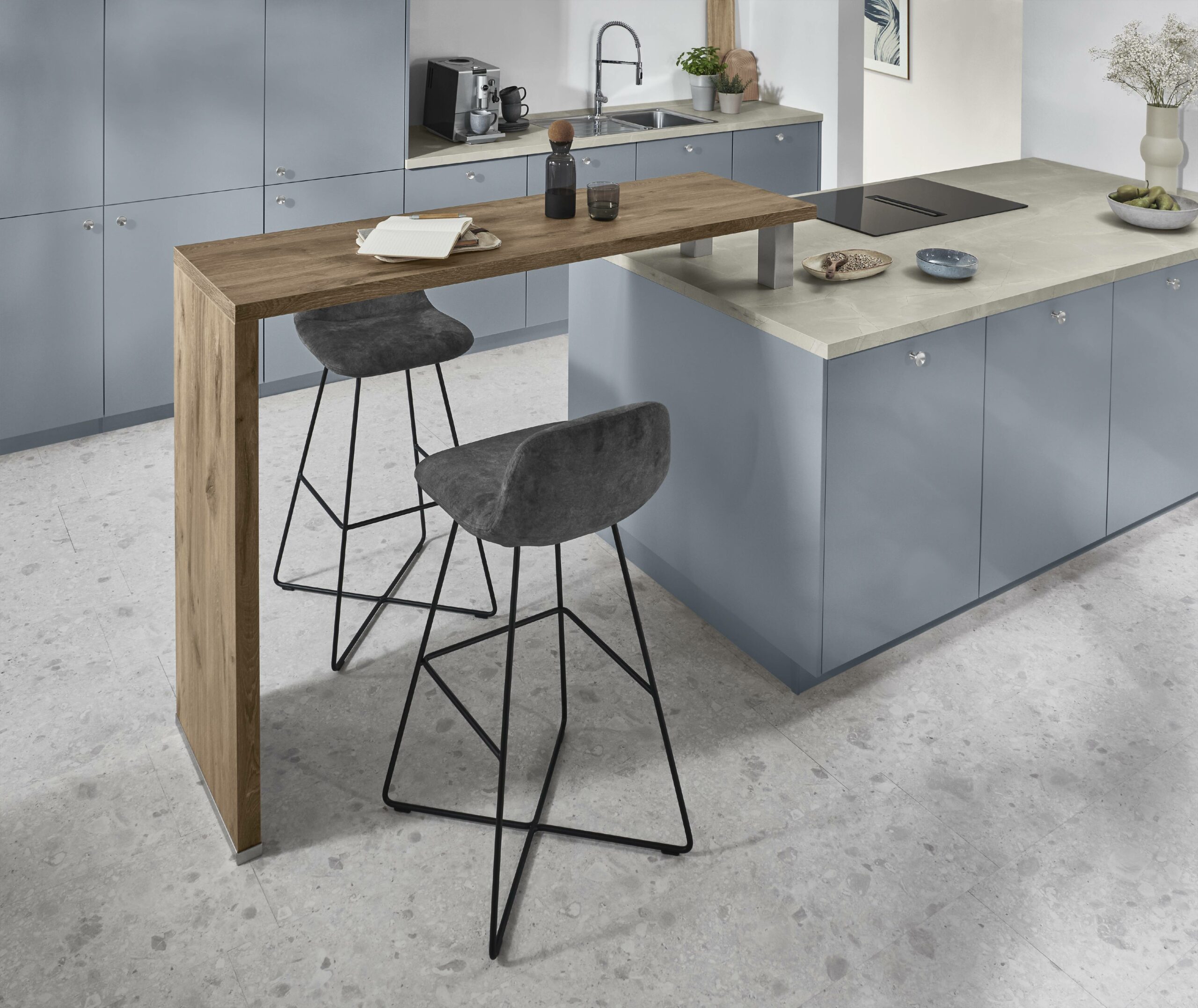 Soft sky-pastel tones make a small kitchen feel open, calm and neat. Light colour and matching shades blur edges and lift space. Clever layout hides doors and links the utility room quietly into the kitchen. The result feels clean, calm and premium.