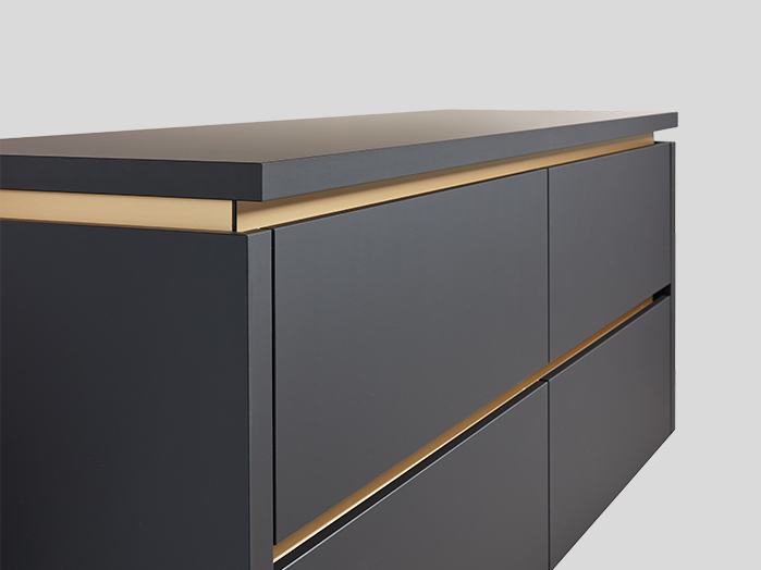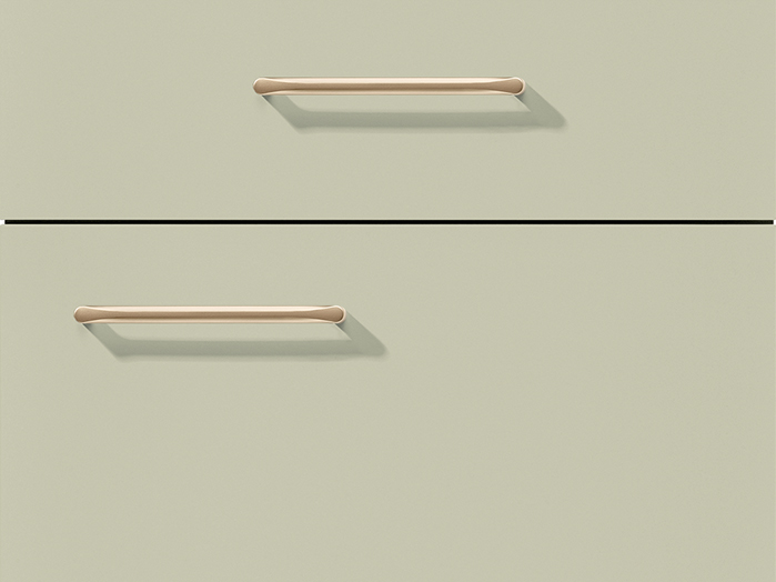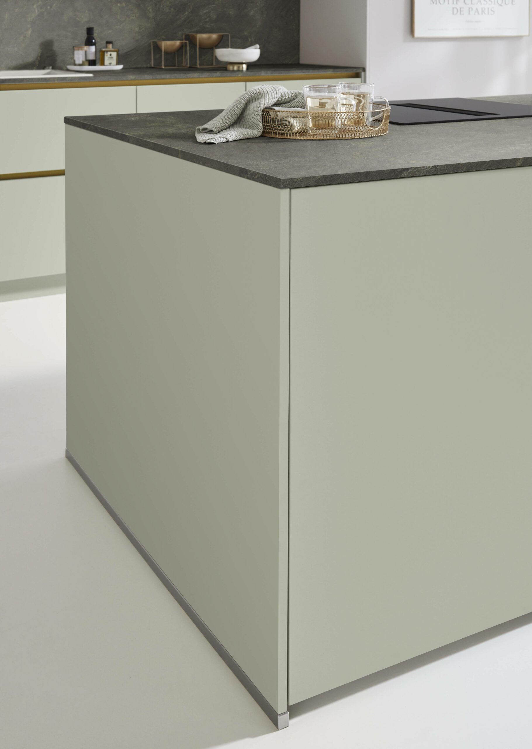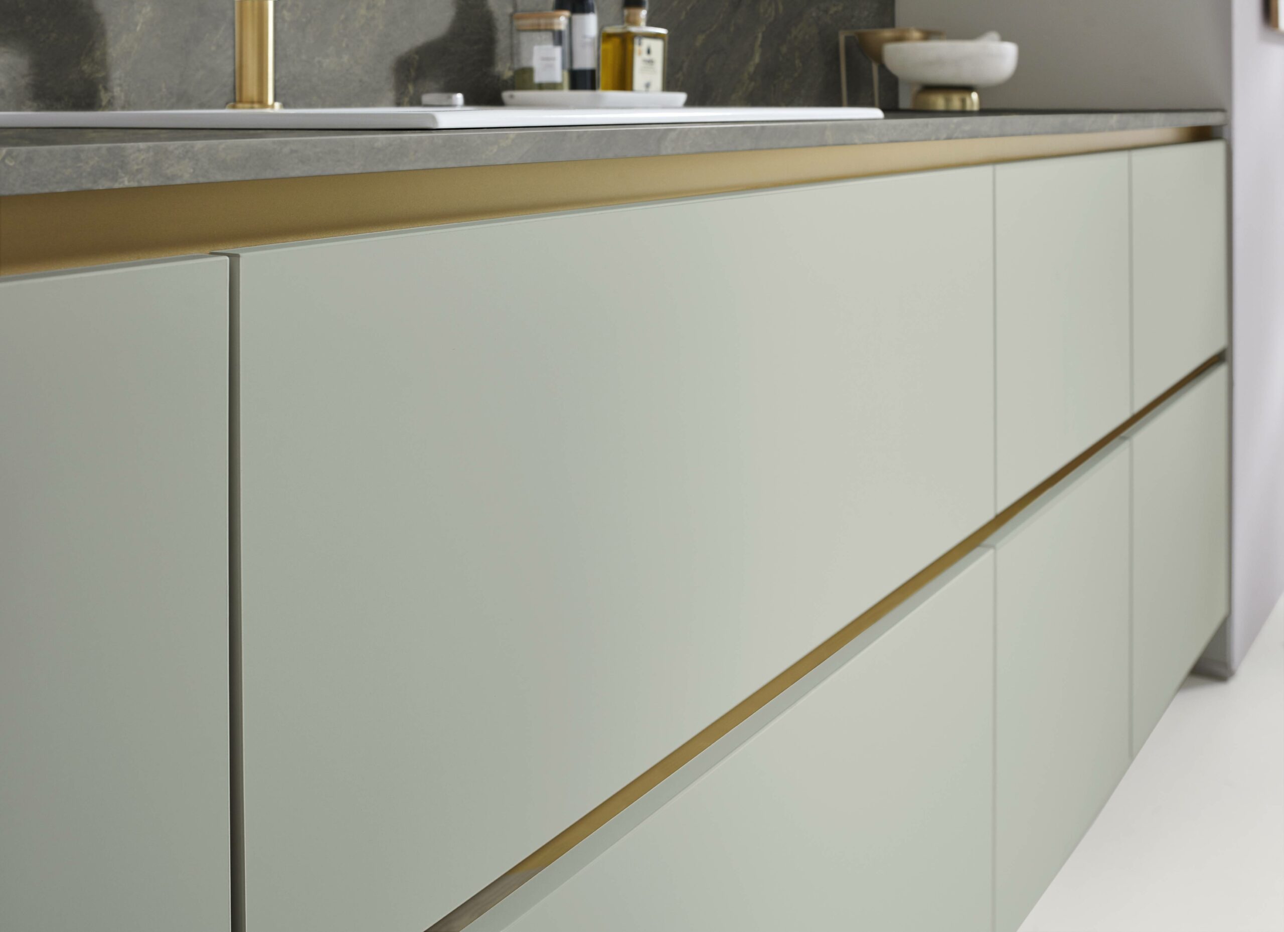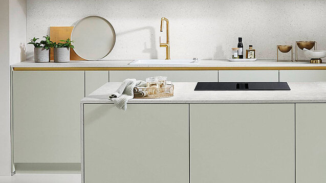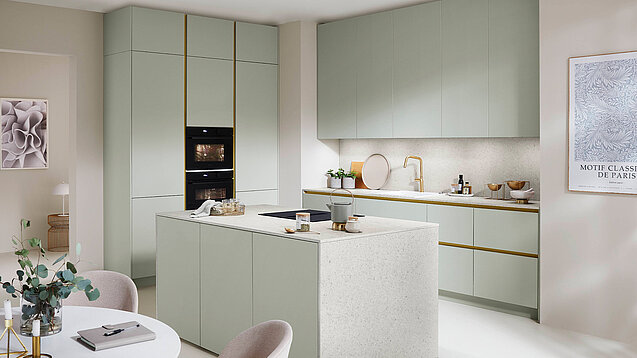 Ceiling-high cupboards in jade colour give the kitchen a gentle, youthful feel. Terrazzo worktops and cladding add subtle texture and charm. Recessed handles keep cabinet fronts smooth and clean. The whole kitchen feels poised, airy and elegant.