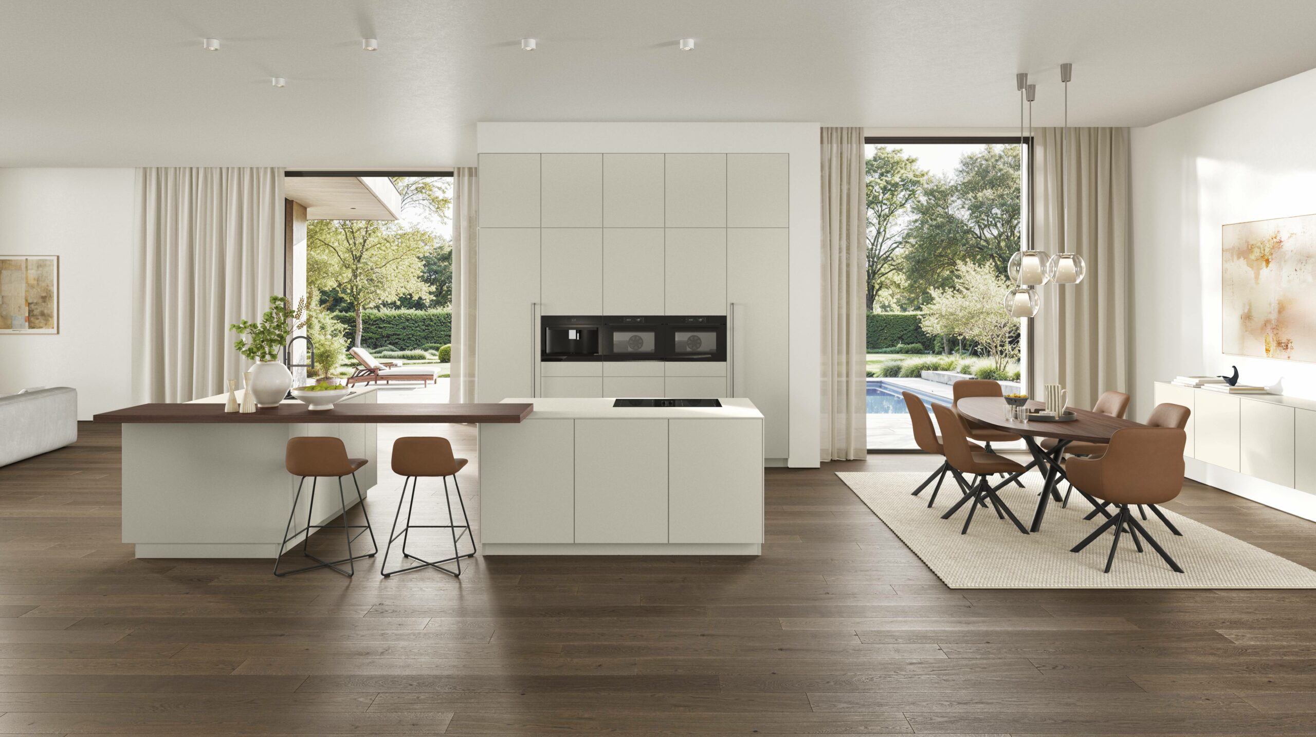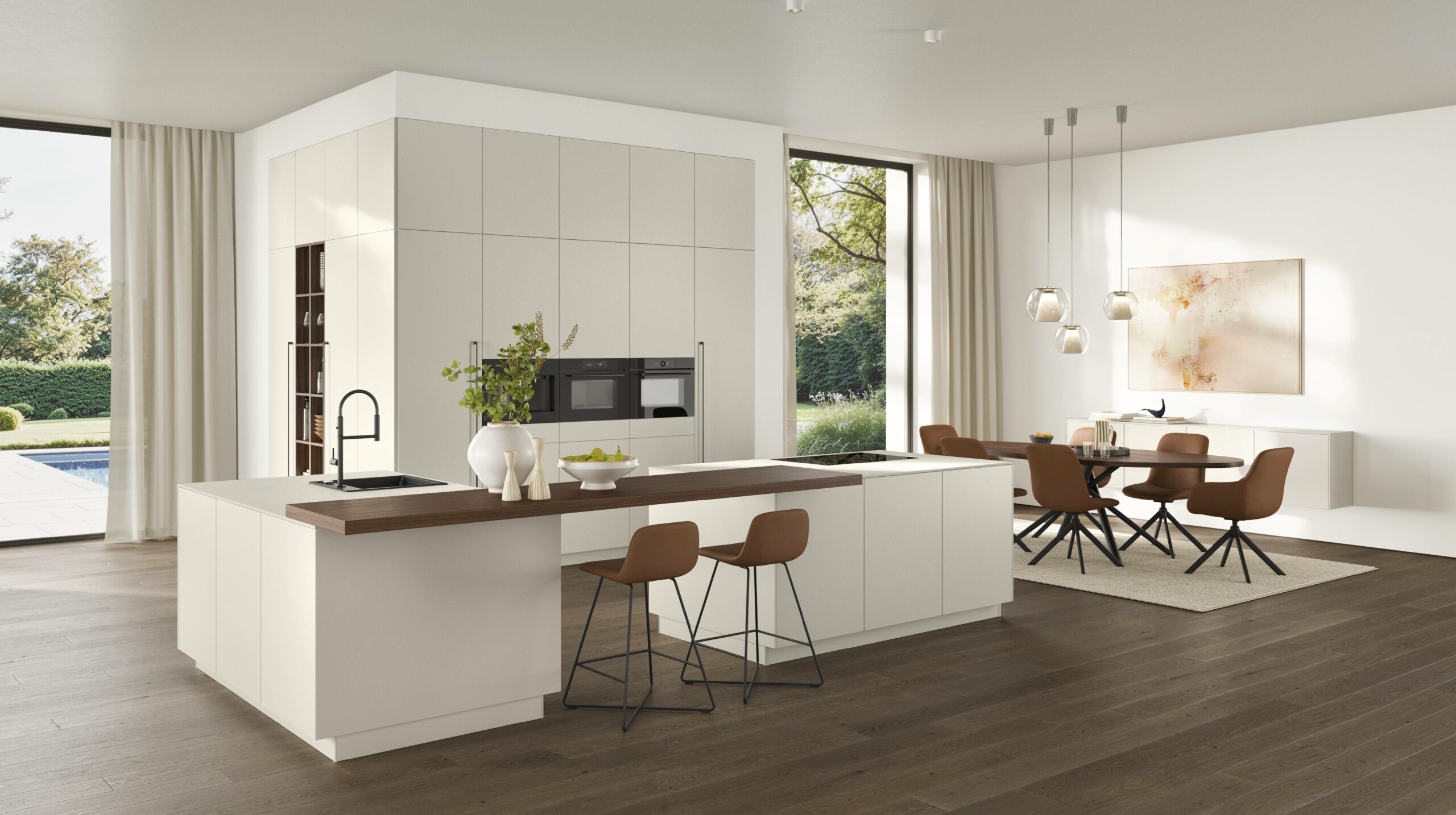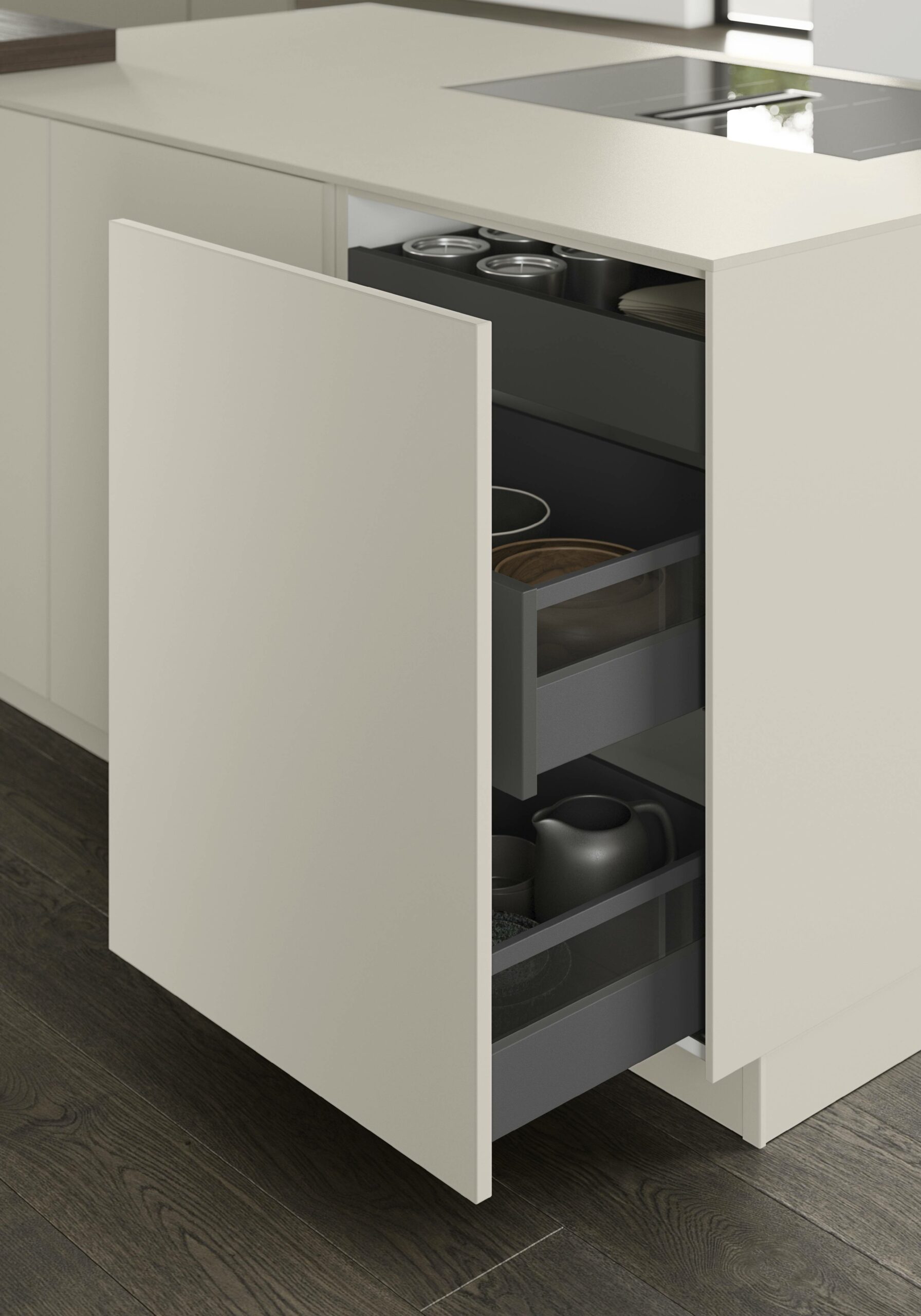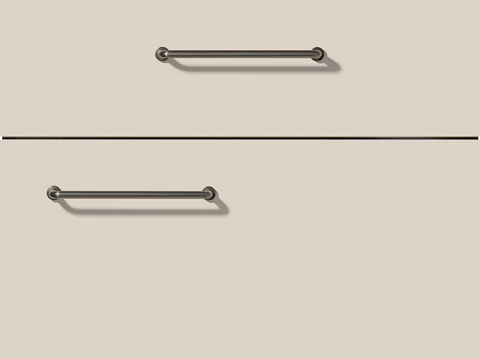 Since last year, this matte lacquer finish has earned many fans. The soft sand tone feels chic and classy. The matte surface cuts glare and keeps the kitchen light lovely. A fine 1.8 mm edge gives the front a clean, sharp look. The result feels quiet, rich, and refined.