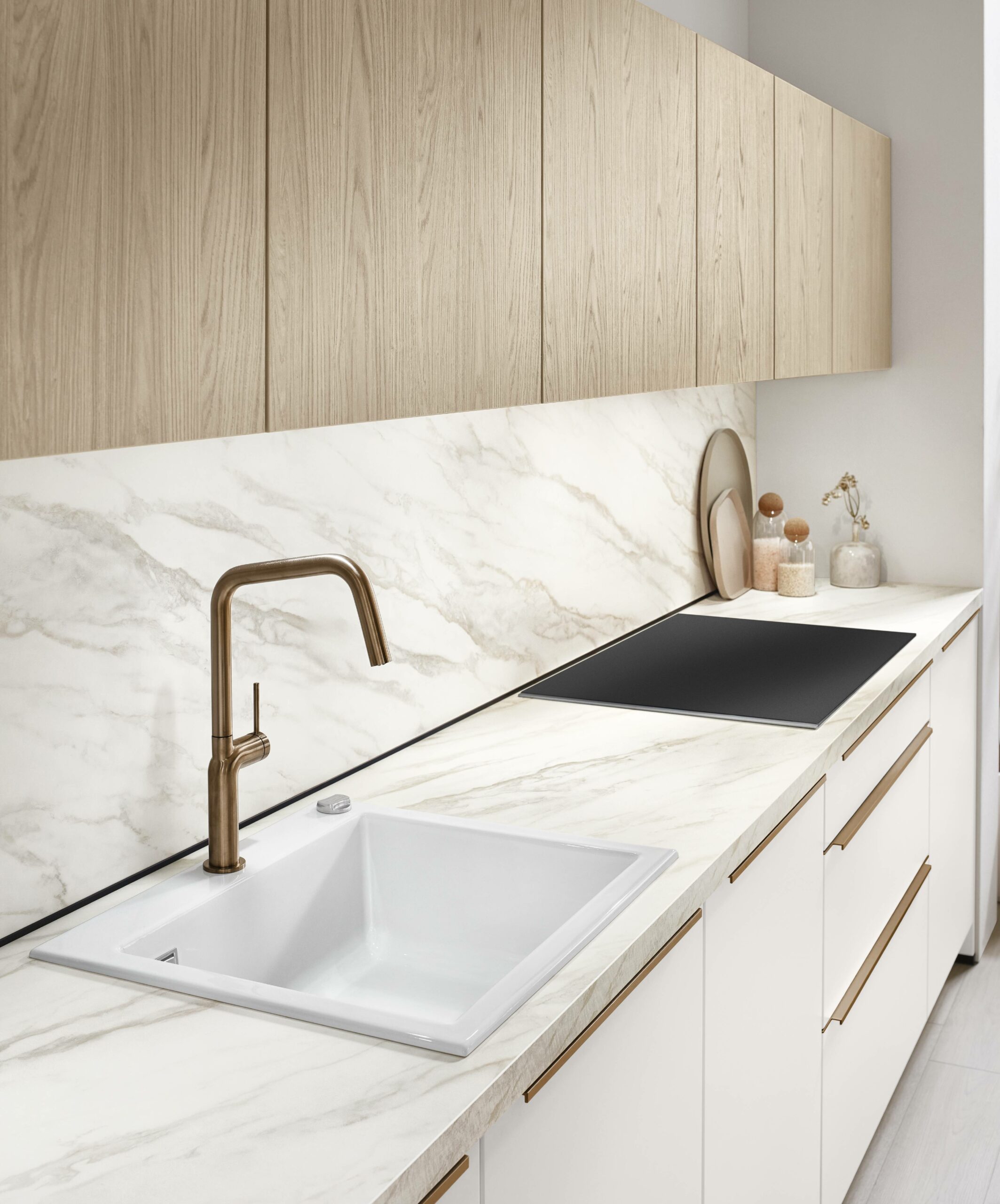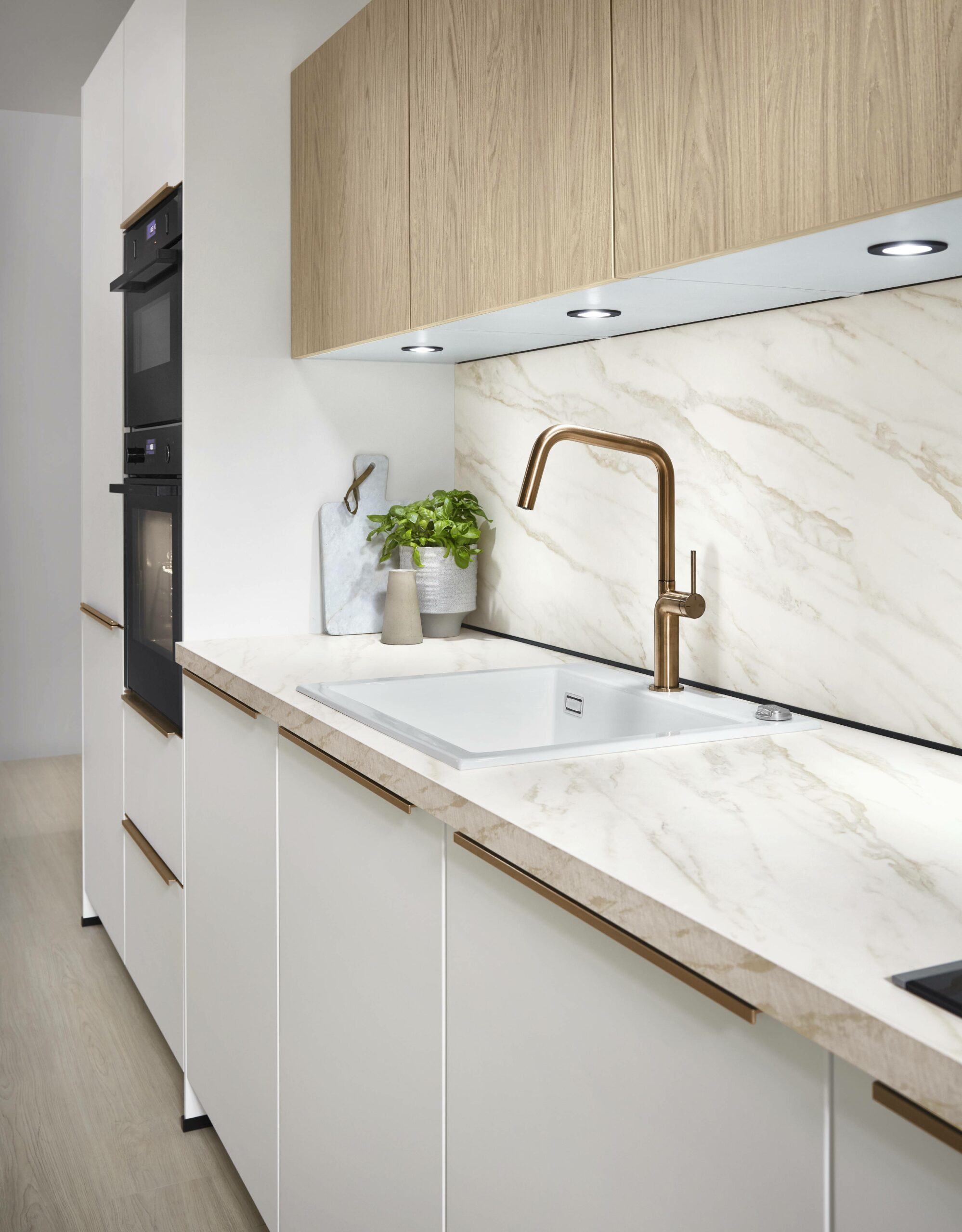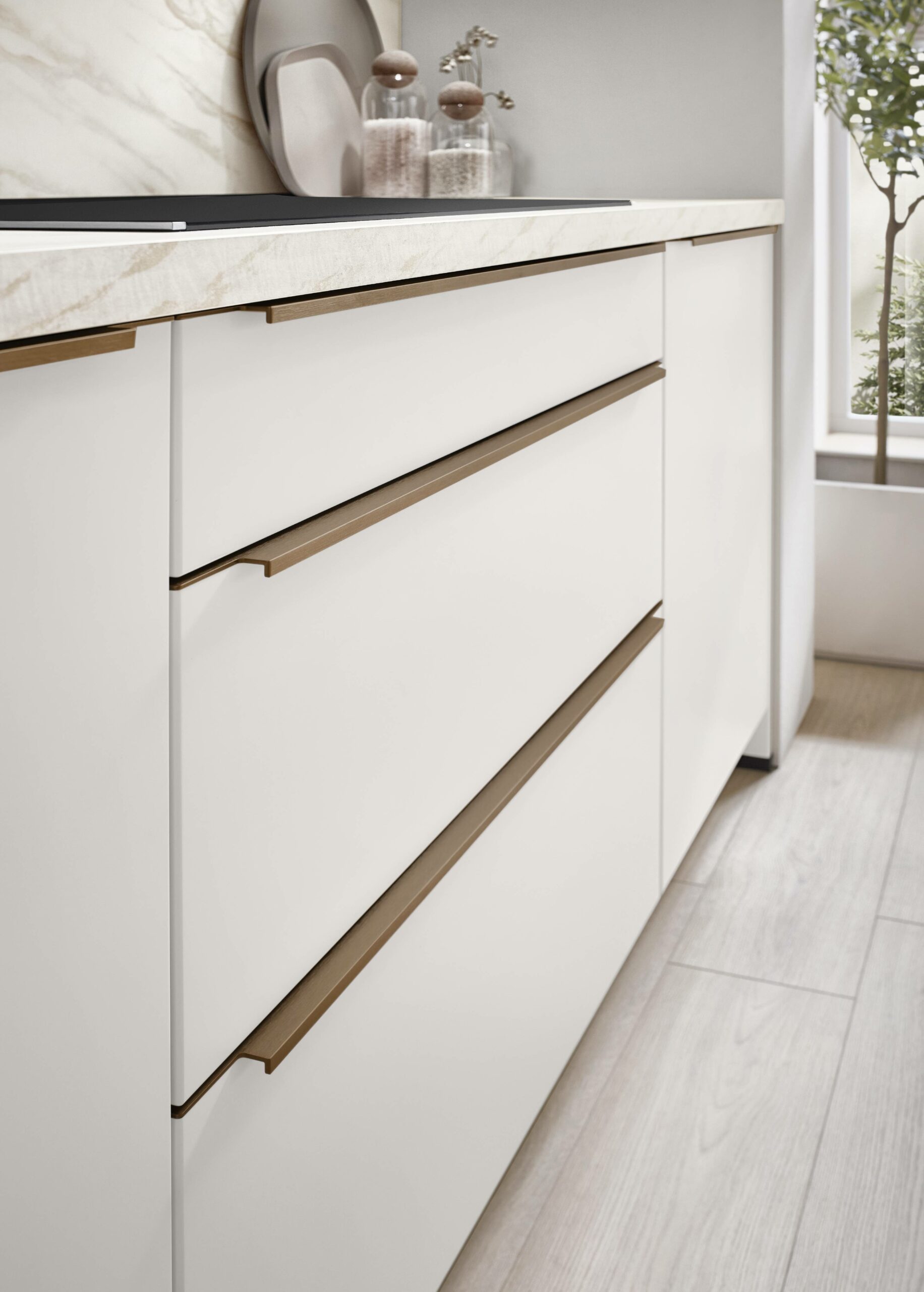 Bronze taps and bar handles give soft touches of class. Fronts with anti-fingerprint coating stay clean and smooth even after daily wear and tear. The kitchen ends up looking bright, welcoming, and high-end.