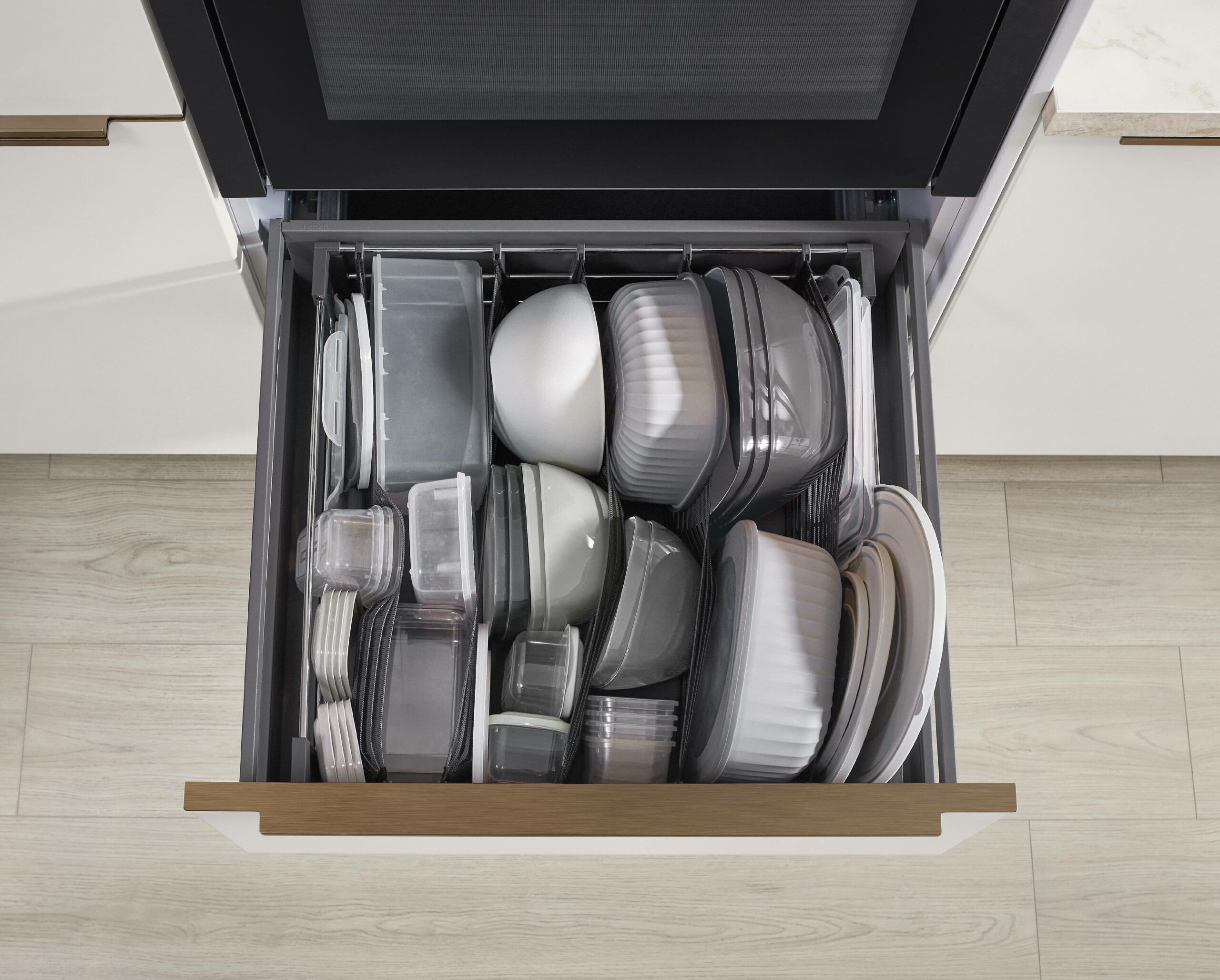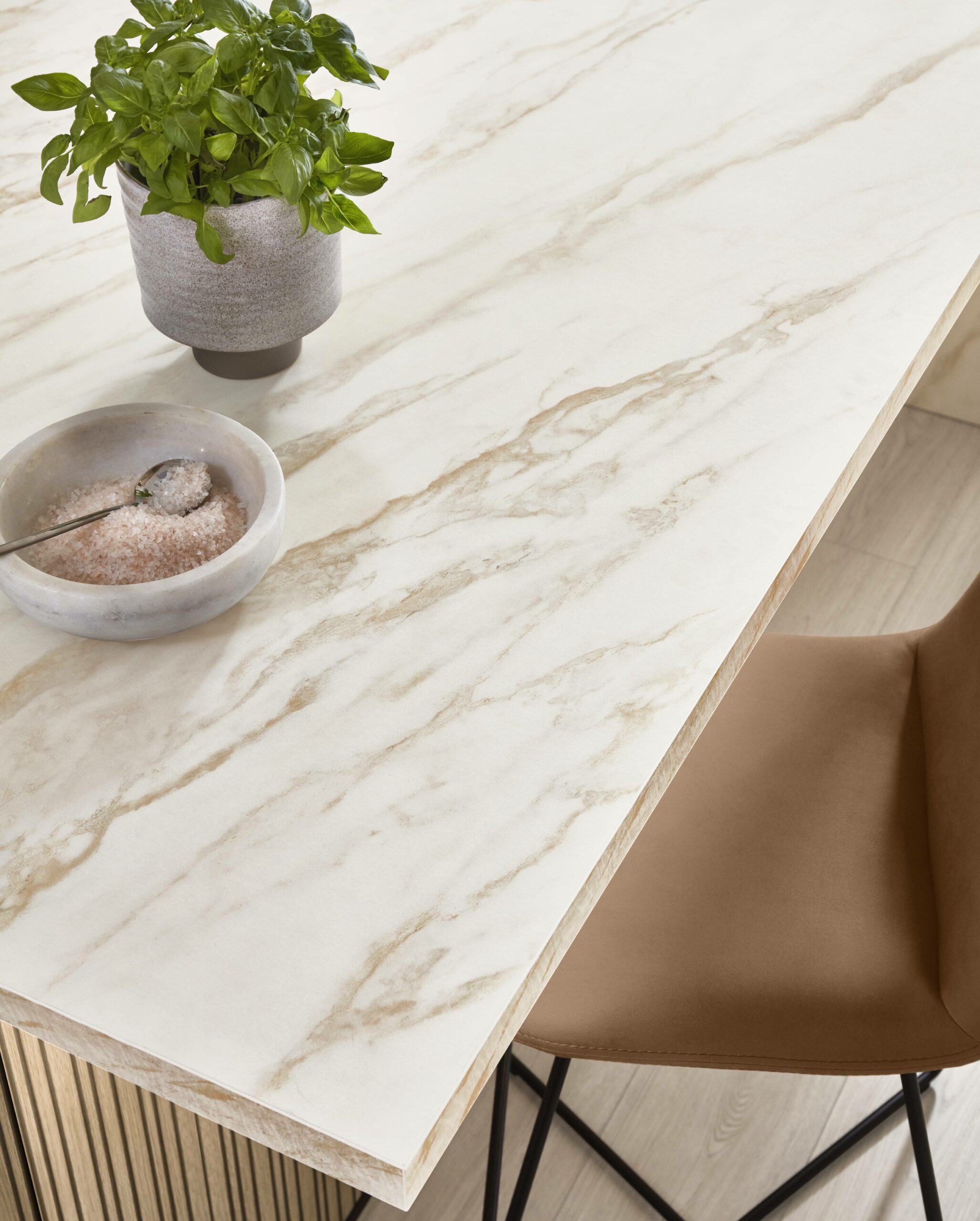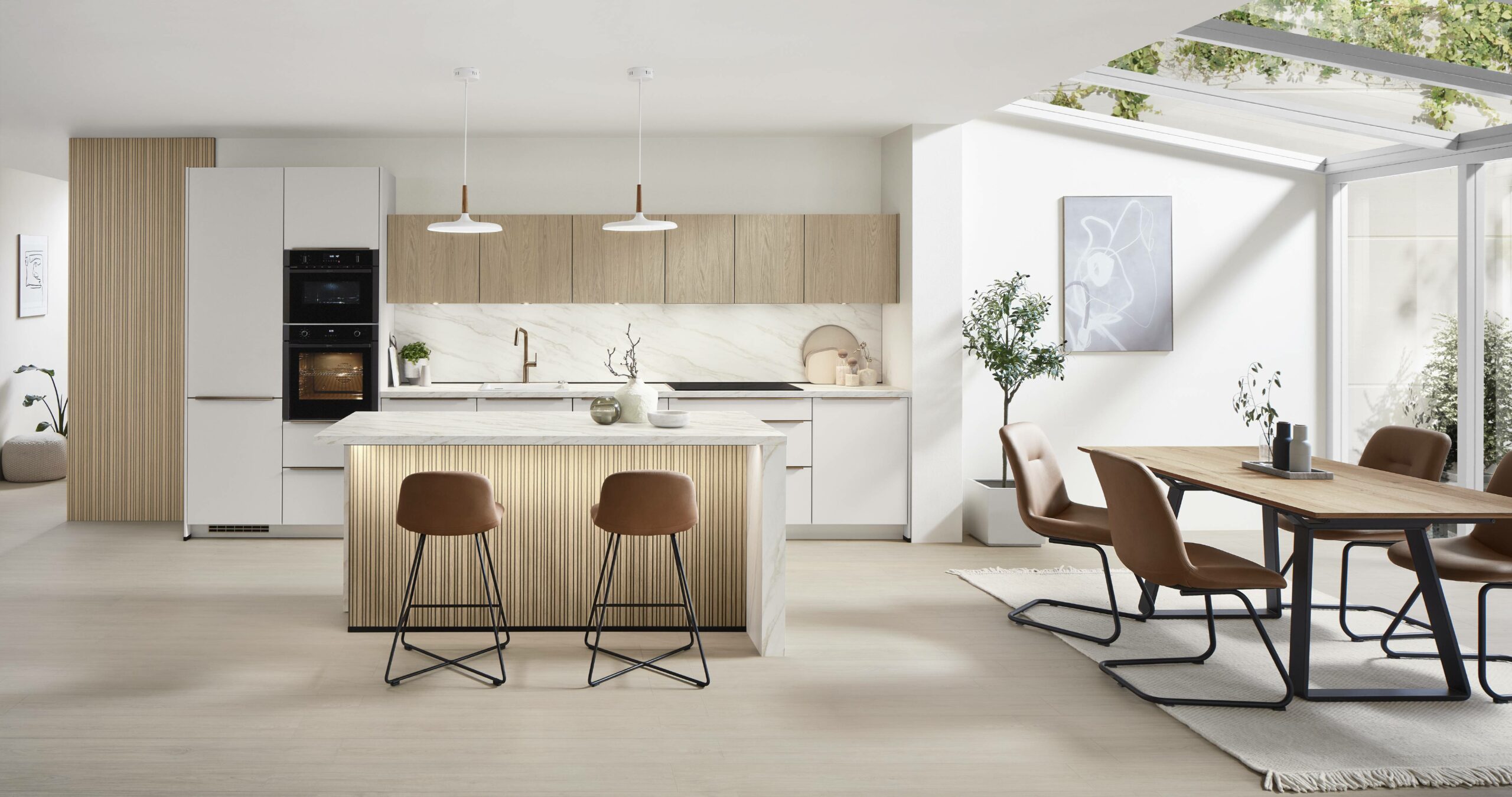 Bronze taps and bar handles give soft touches of class. Fronts with anti-fingerprint coating stay clean and smooth even after daily wear and tear. The kitchen ends up looking bright, welcoming, and high-end.