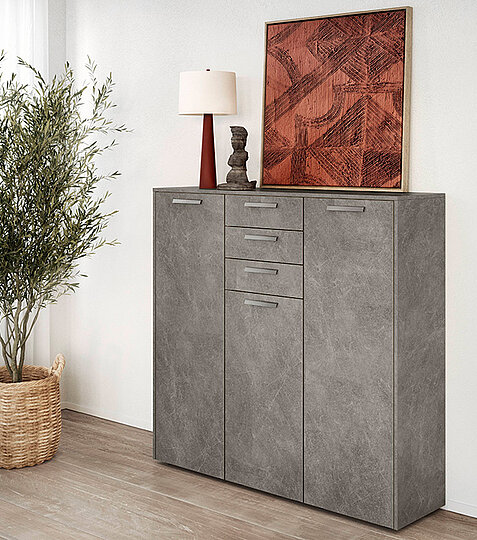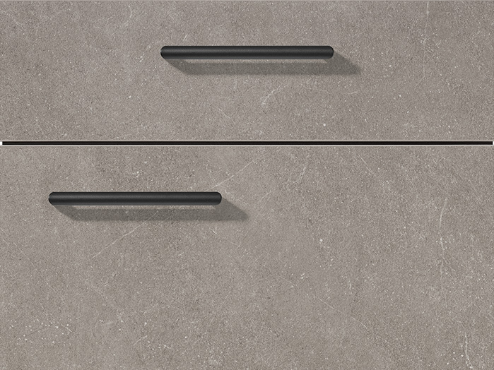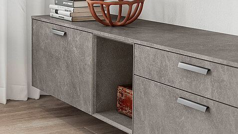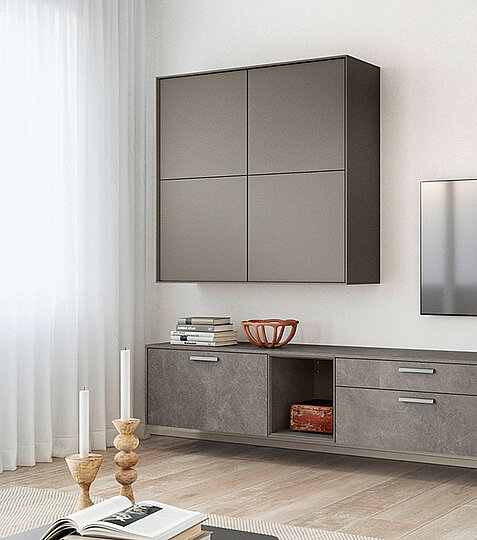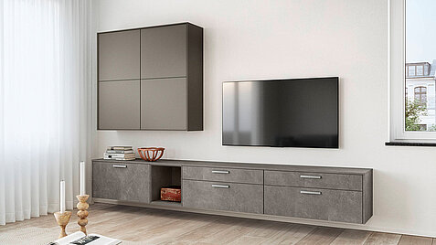 The living room furniture in basalt taupe grey combines modern design and simple elegance. With stainless steel colored metal handles and a faceted shelf in Easytouch taype grey, they create stylish accents and create a harmonious and complete look. The high-quality finish creates an inviting atmosphere, and the structured details make the furniture a highlight in your home.