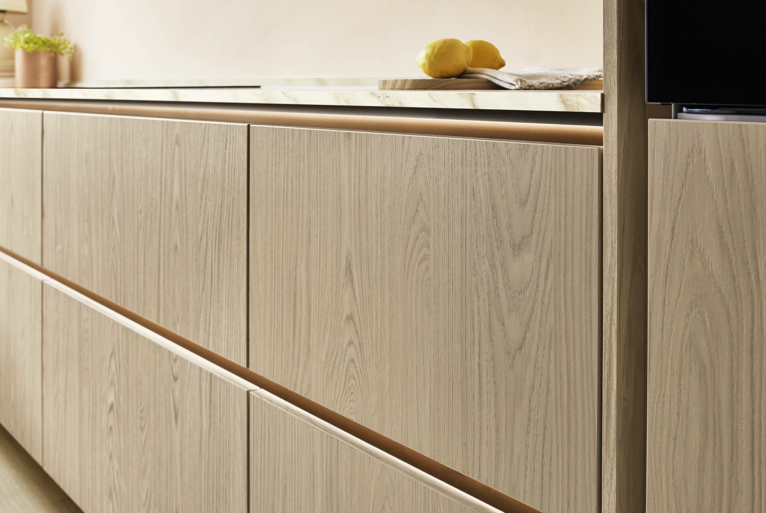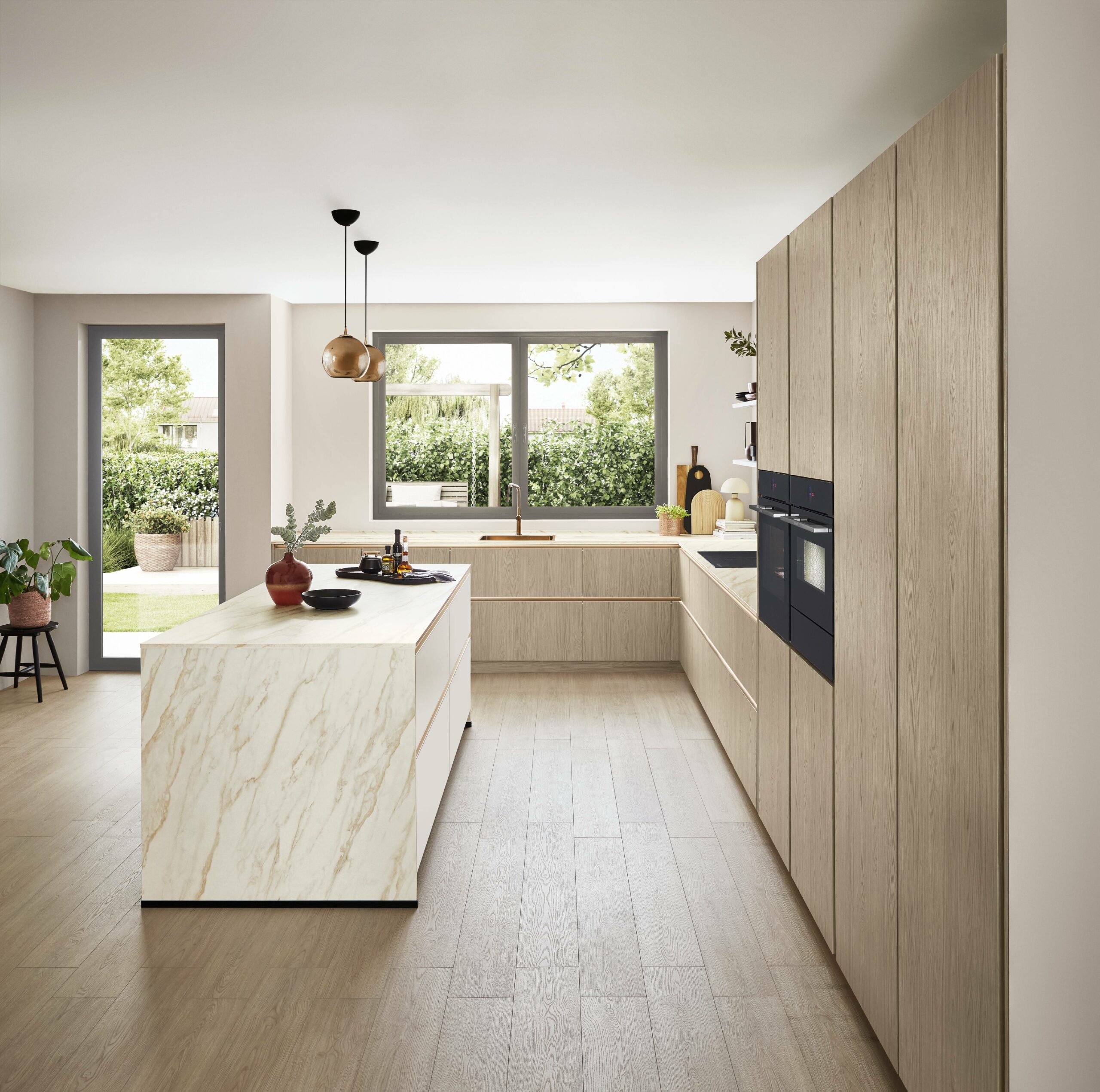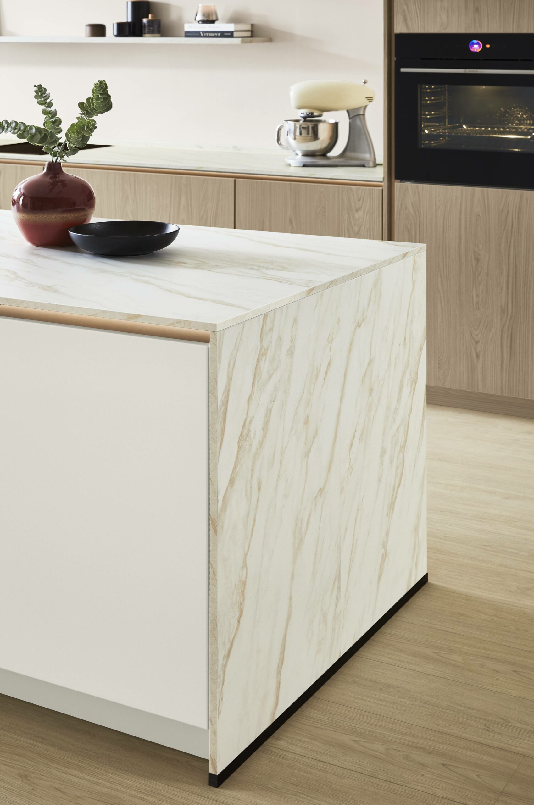 The kitchen gives you space to cook, work, or just spend time with family. Tall units in warm oak hide clutter and keep cooking tools in easy reach. Drawers slide out smoothly so you don’t dig around. A Carrara-bronze marble-look worktop pairs quietly with bronze taps and handles. Surfaces stay clean with anti-fingerprint coating even during busy days. The room feels warm, lived-in and just fits real family life.