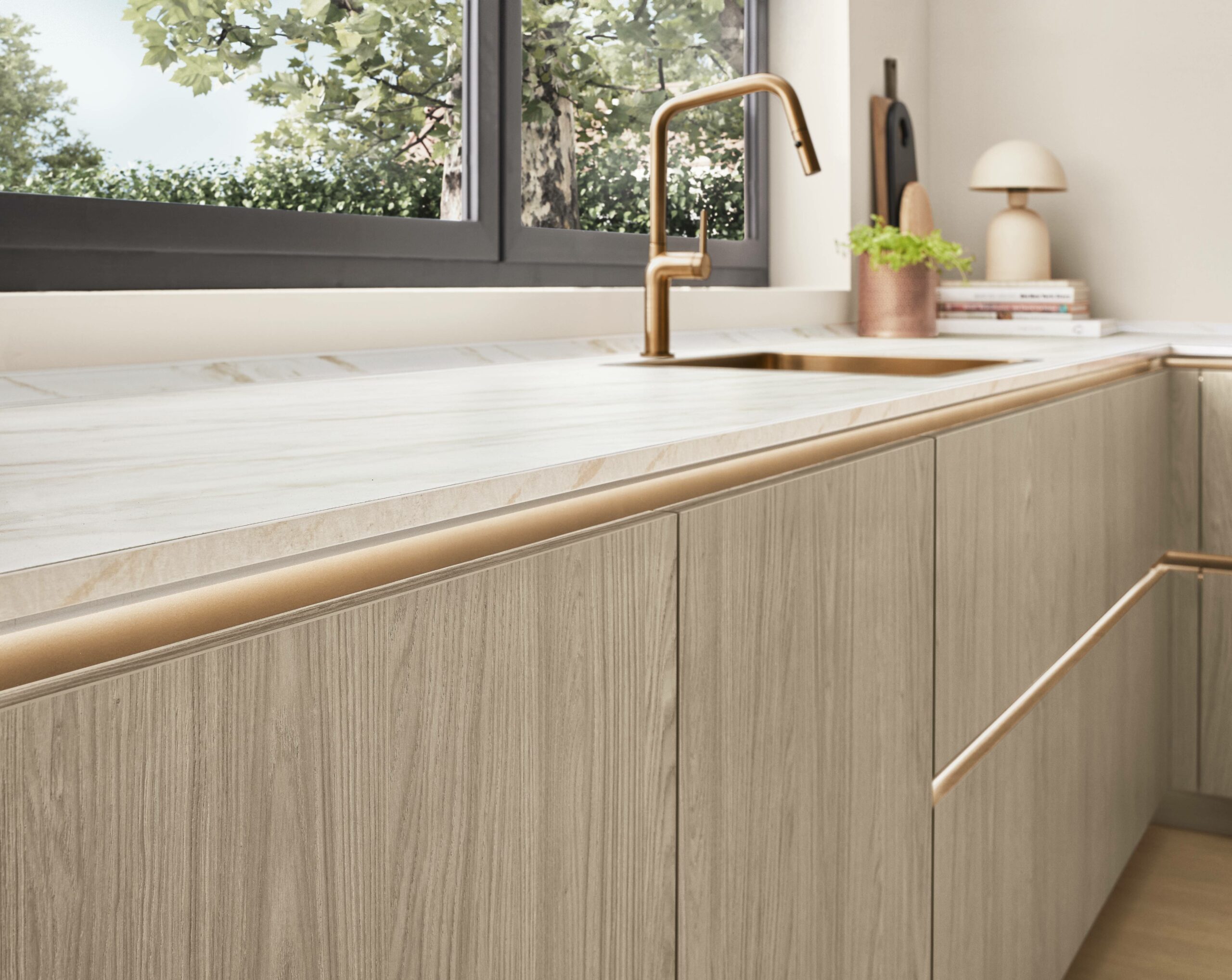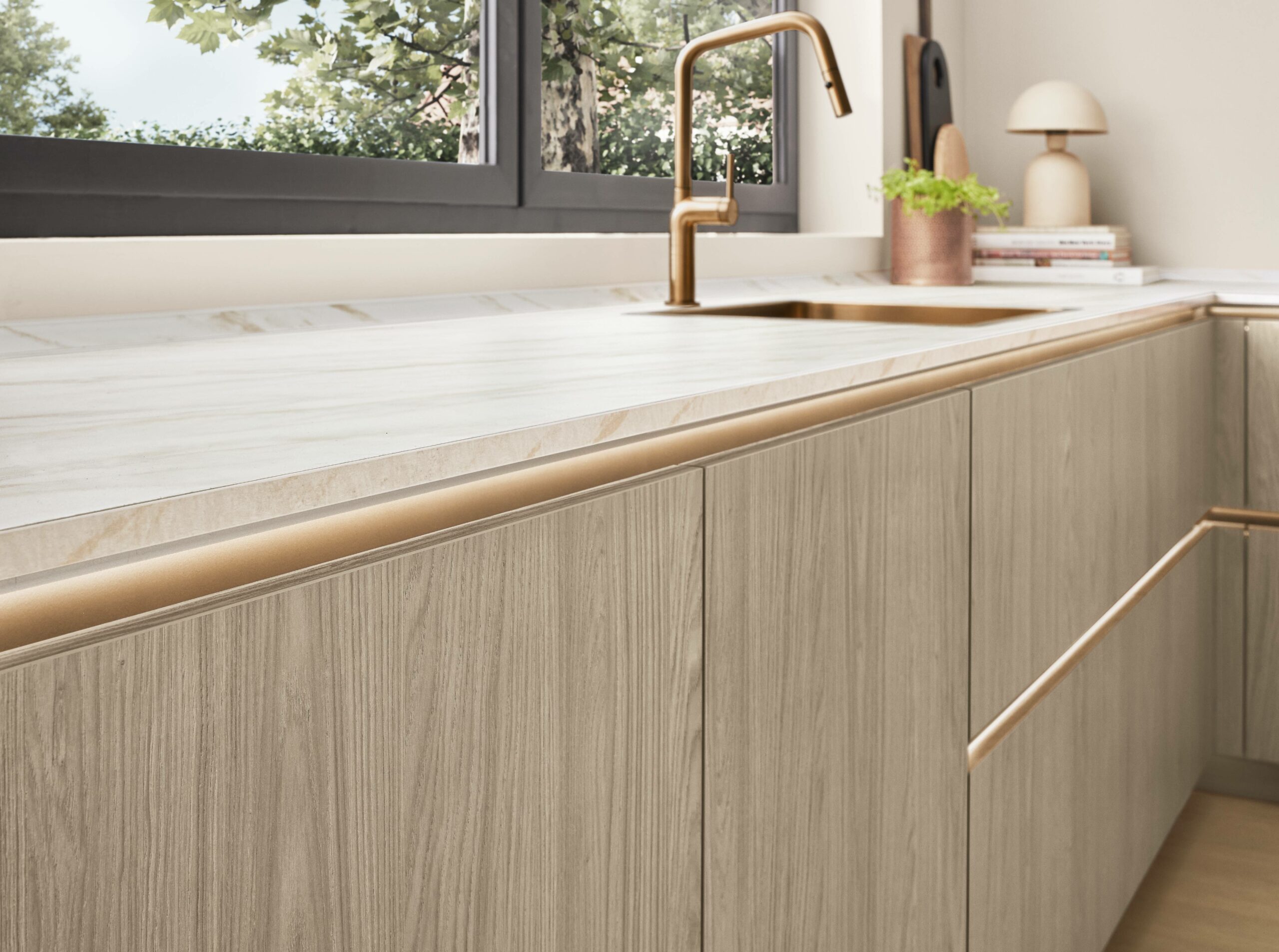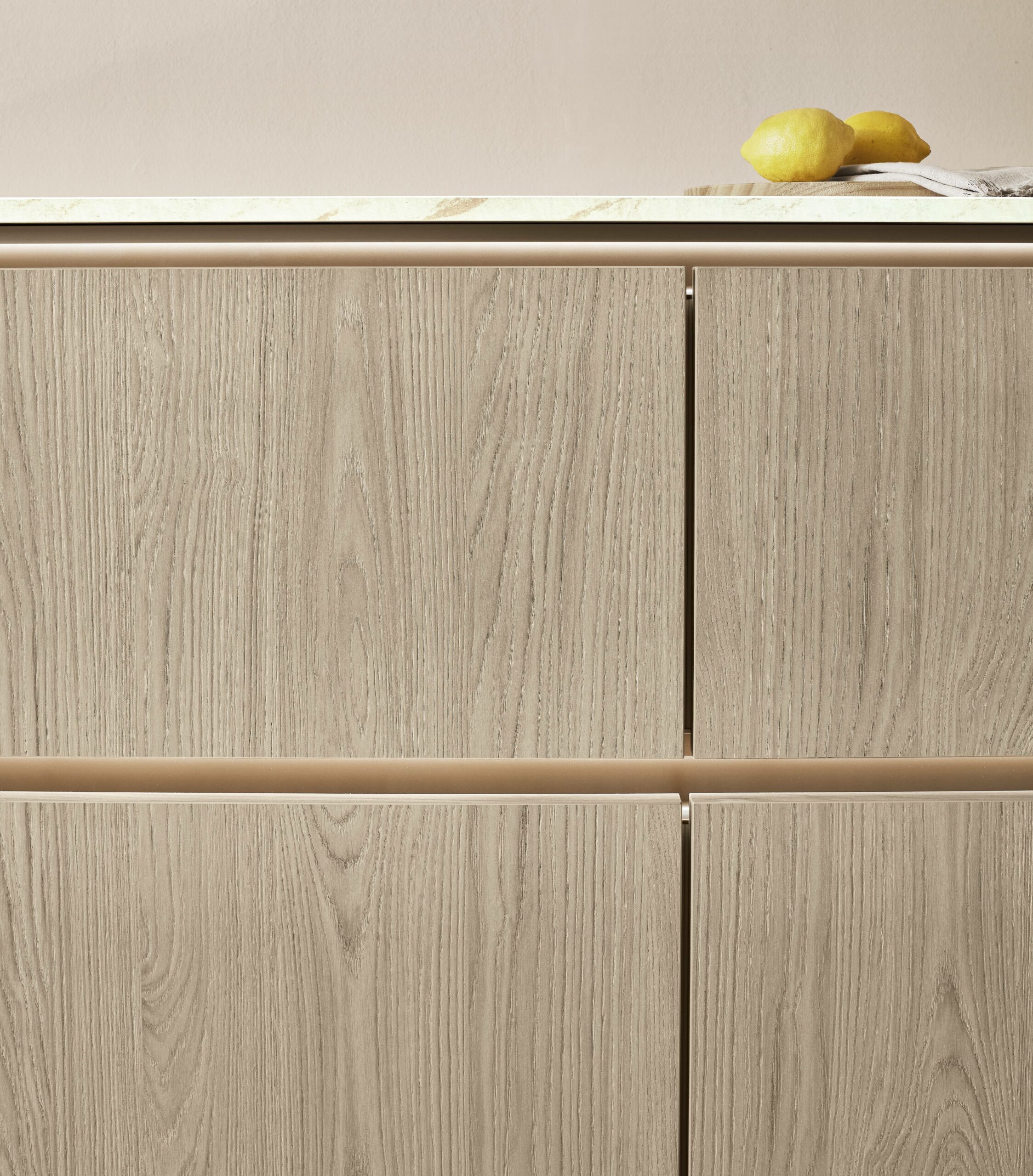 The kitchen gives you space to cook, work, or just spend time with family. Tall units in warm oak hide clutter and keep cooking tools in easy reach. Drawers slide out smoothly so you don’t dig around. A Carrara-bronze marble-look worktop pairs quietly with bronze taps and handles. Surfaces stay clean with anti-fingerprint coating even during busy days. The room feels warm, lived-in and just fits real family life.