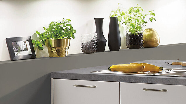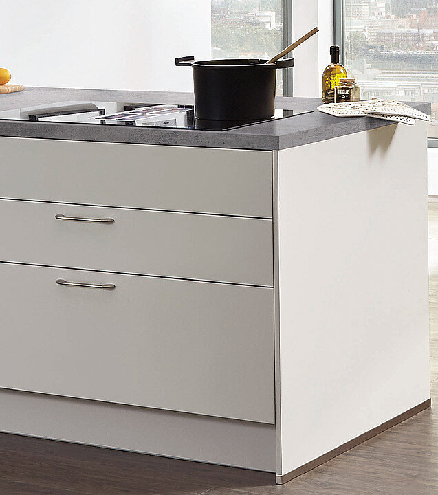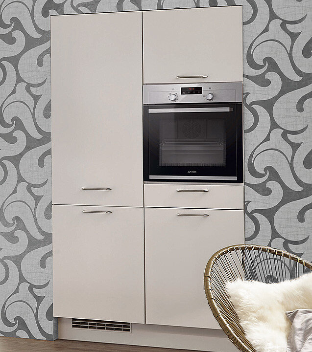 The layout works well for anyone starting out or living light. Matt laminate fronts give a gentle, modern feel. A higher built-in oven brings comfort while cooking. The surfaces stay easy to wipe and handle wear. The Vector Art niche adds a bold detail that lifts the whole room.