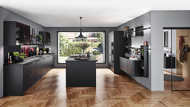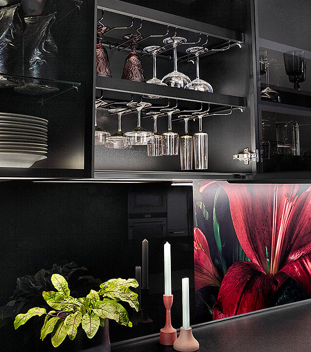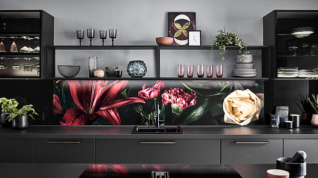 This style works for anyone who likes a clear, simple layout. The Iconic Flowers panel brings a striking burst of colour beside deep black tones. Shelves and cabinets build a strong, balanced mix. Matt surfaces set a soft base, while metal and glass add a light shine.